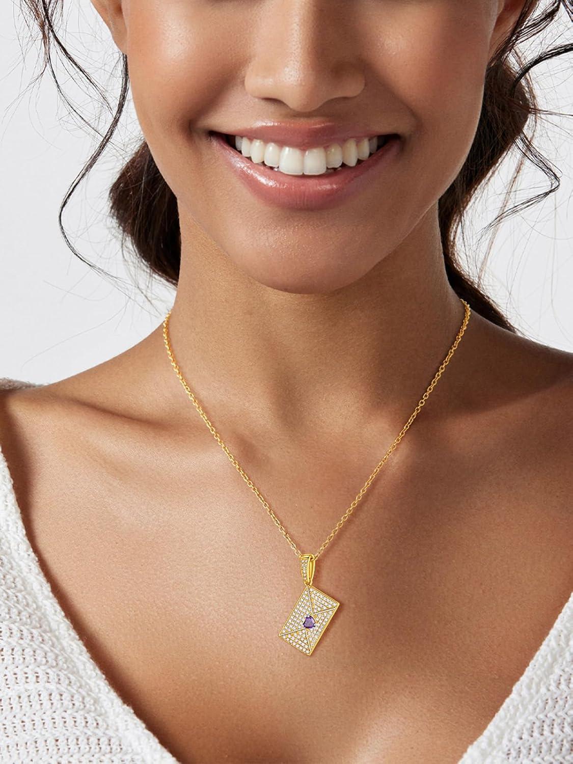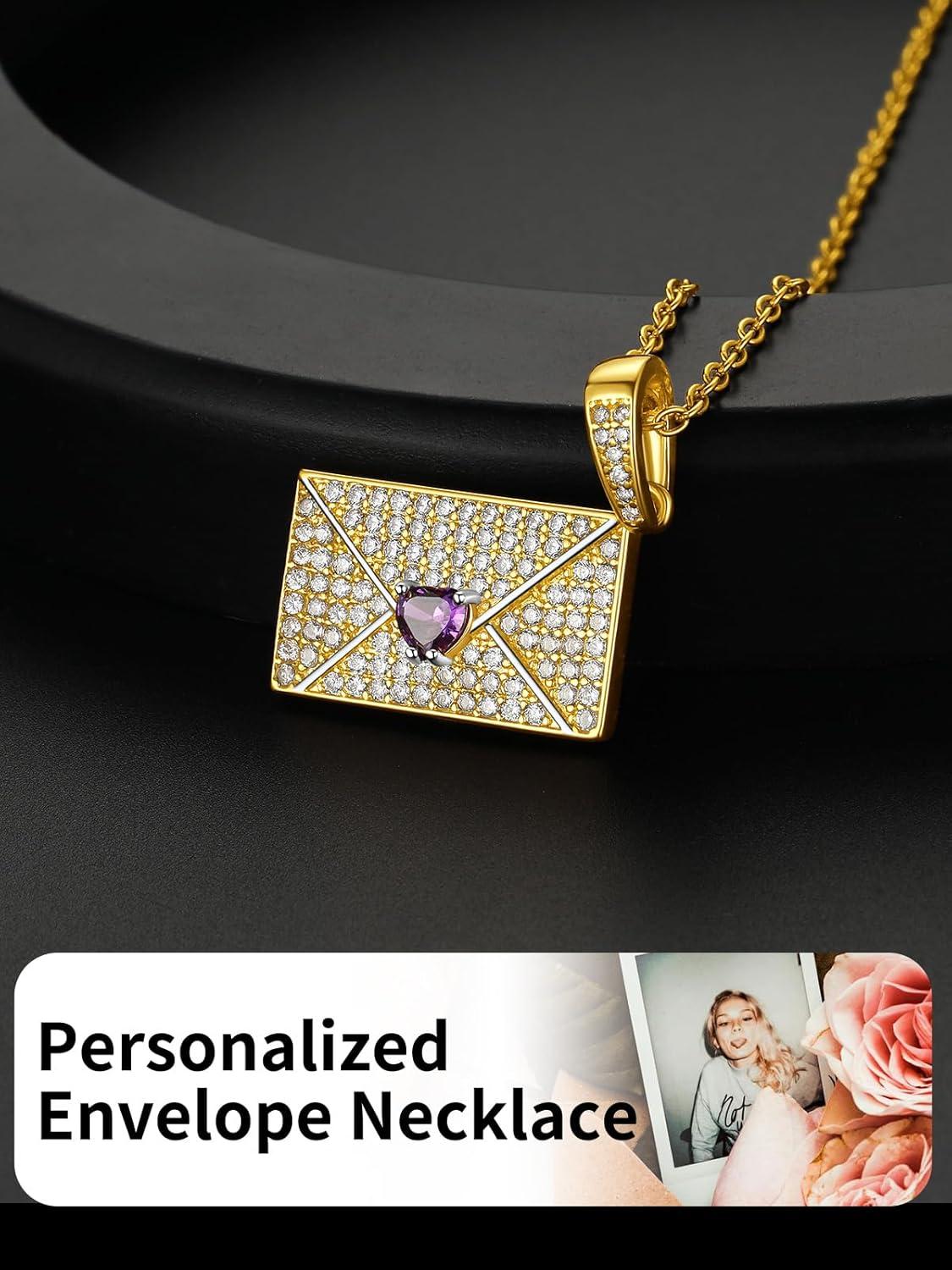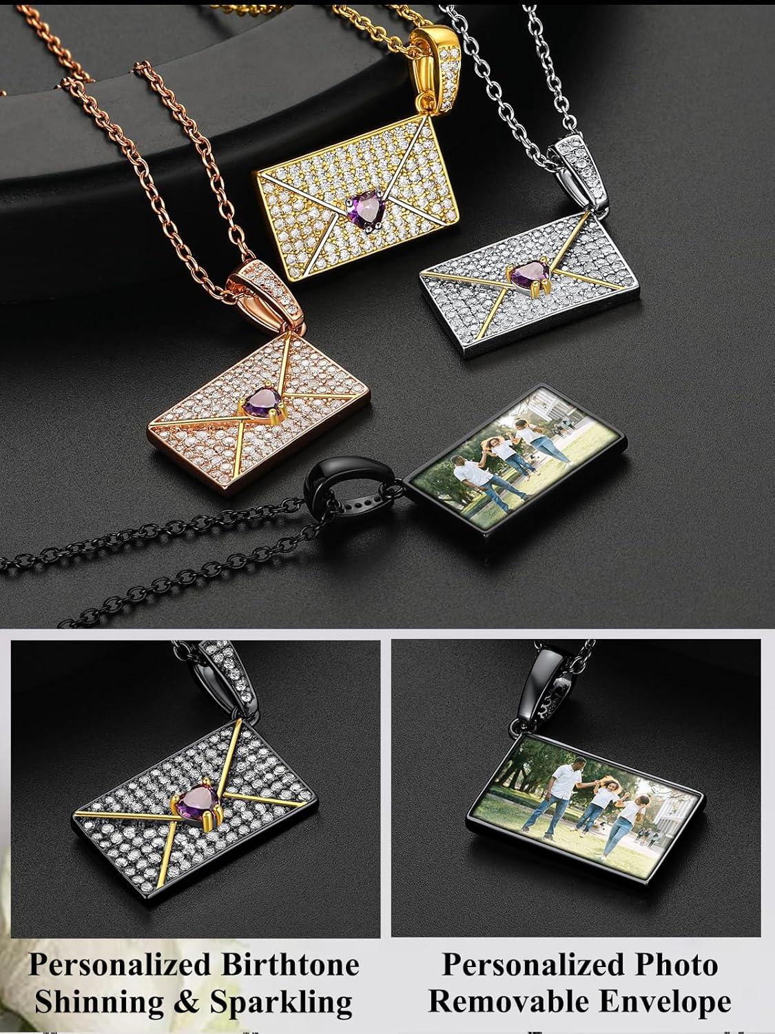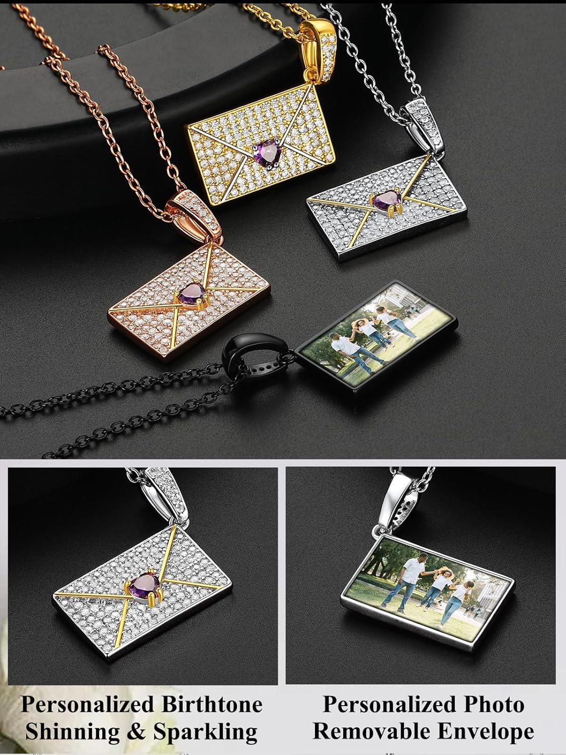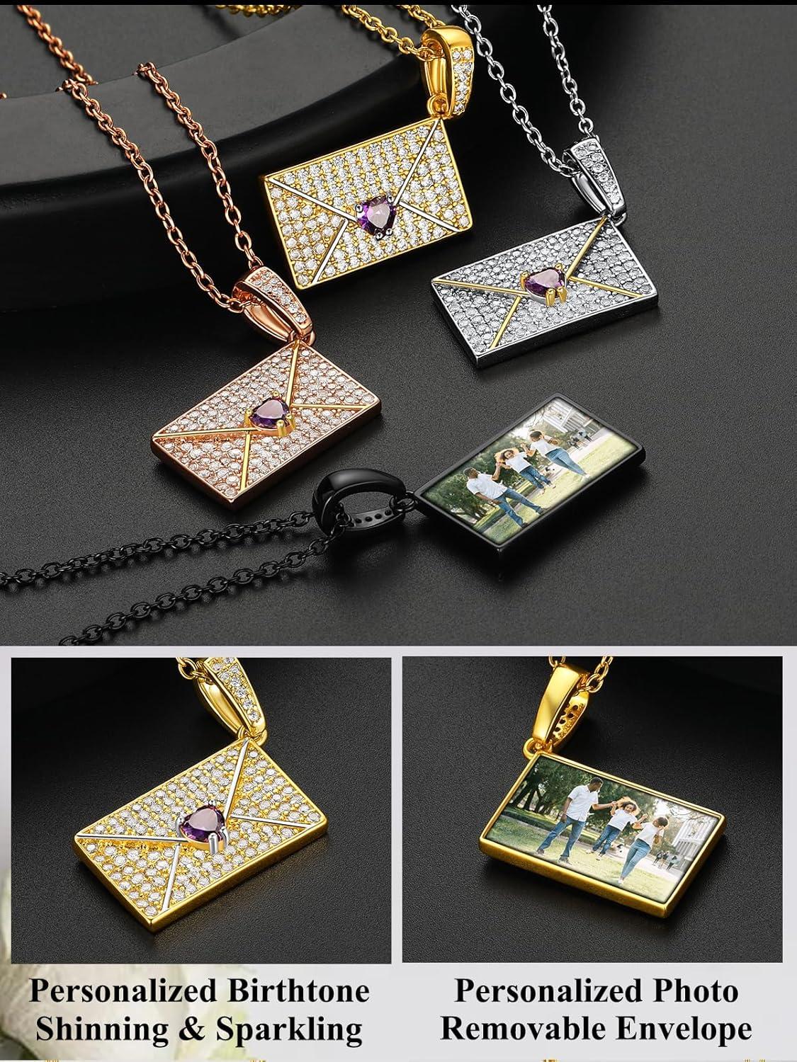 • ChainsHouse Personalized Locket Necklace, Custom Envelope Necklaces with Photo Message Engraved for Women, Stainless Steel/Black/Gold/Rose Gold Plated Memorial Gift for Wife (with Gift Box)(D – Photo & Birthstone-Gold)
