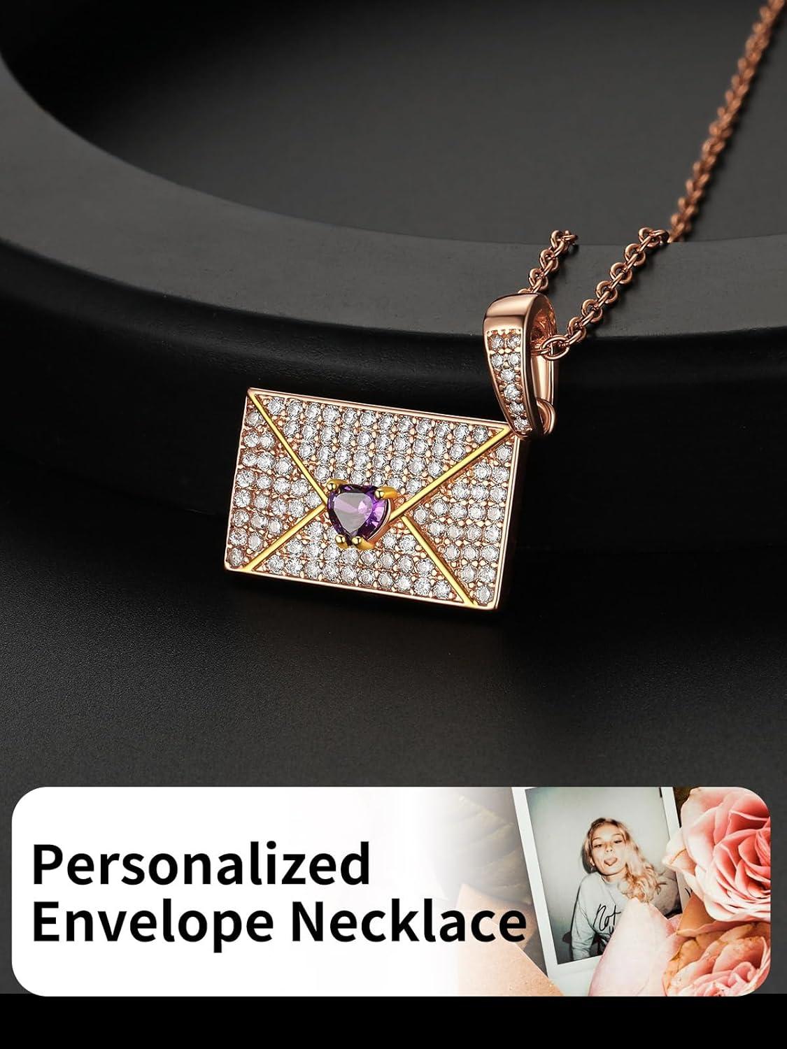 • ChainsHouse Personalized Locket Necklace, Custom Envelope Necklaces with Photo Message Engraved for Women, Stainless Steel/Black/Gold/Rose Gold Plated Memorial Gift for Wife (with Gift Box)(C – Engraved Locket-Rose Gold)
