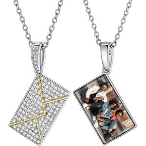 ChainsHouse Personalized Locket Necklace, Custom Envelope Necklaces with Photo Message Engraved for Women, Stainless Steel/Black/Gold/Rose Gold Plated Memorial Gift for Wife (with Gift Box)(E – Photo-Silver)