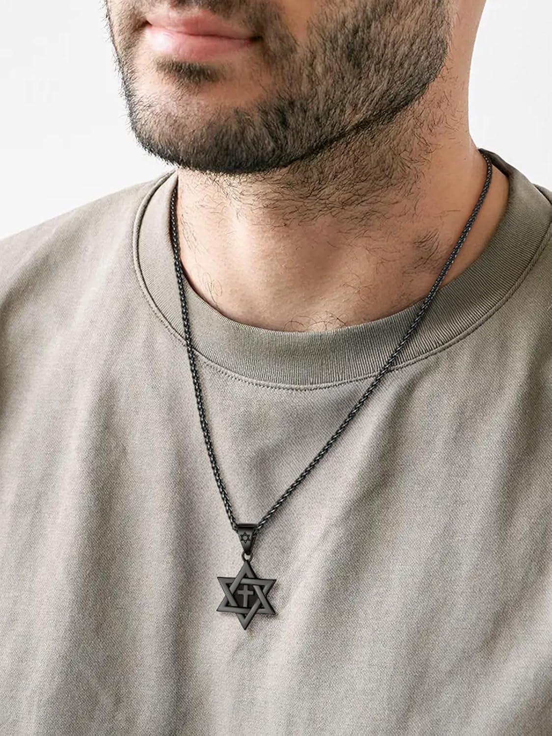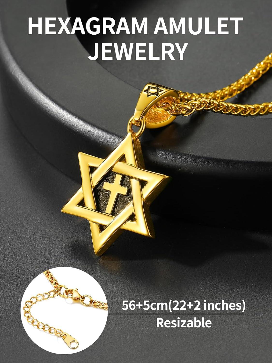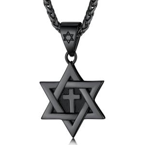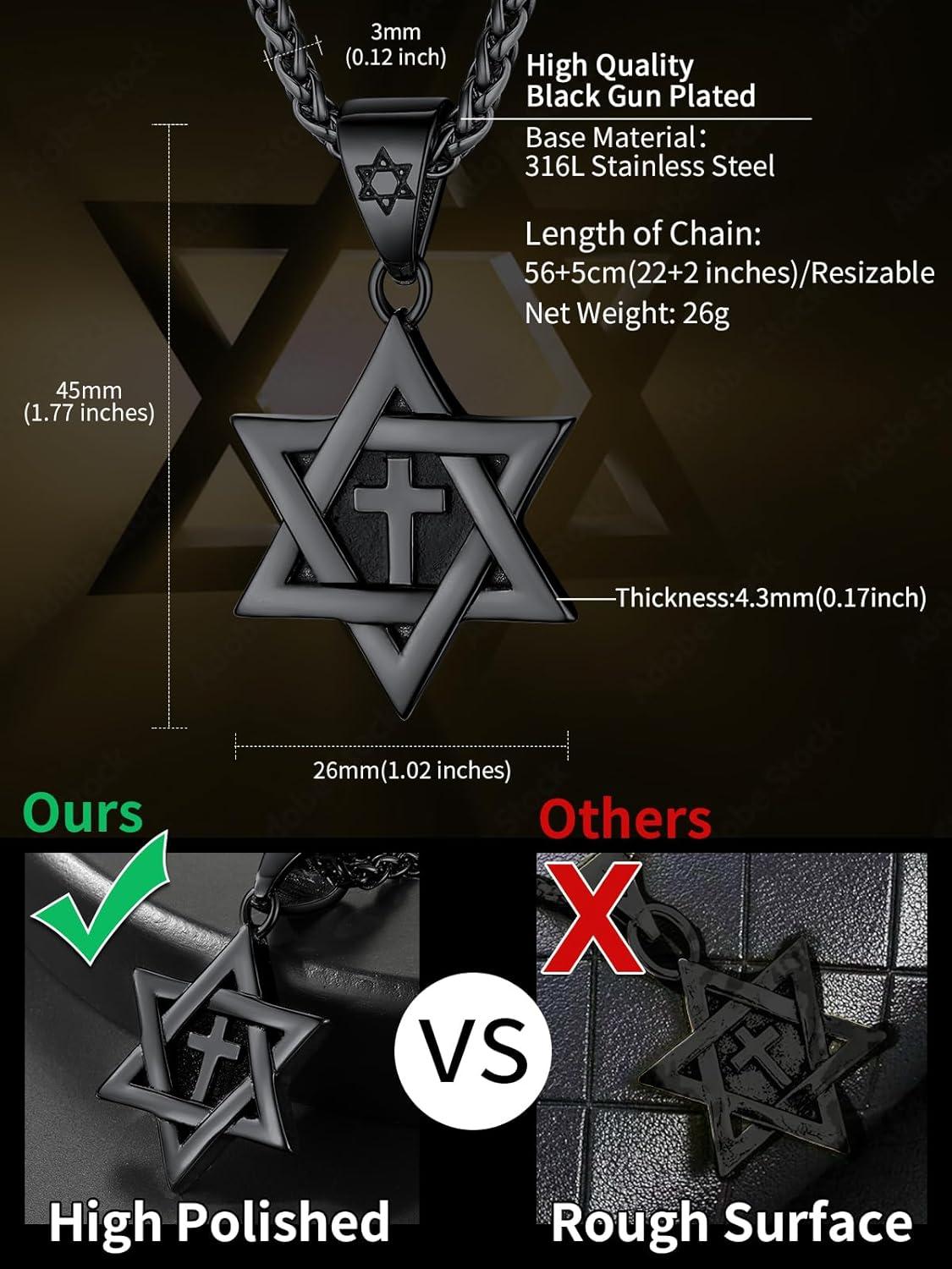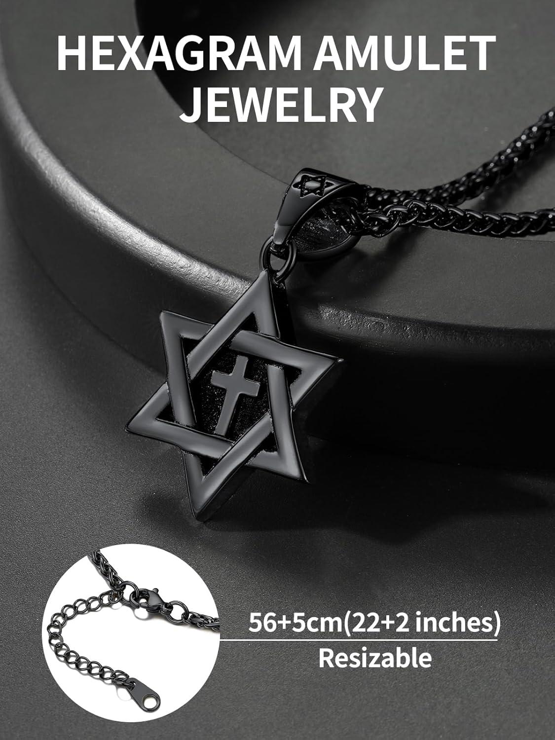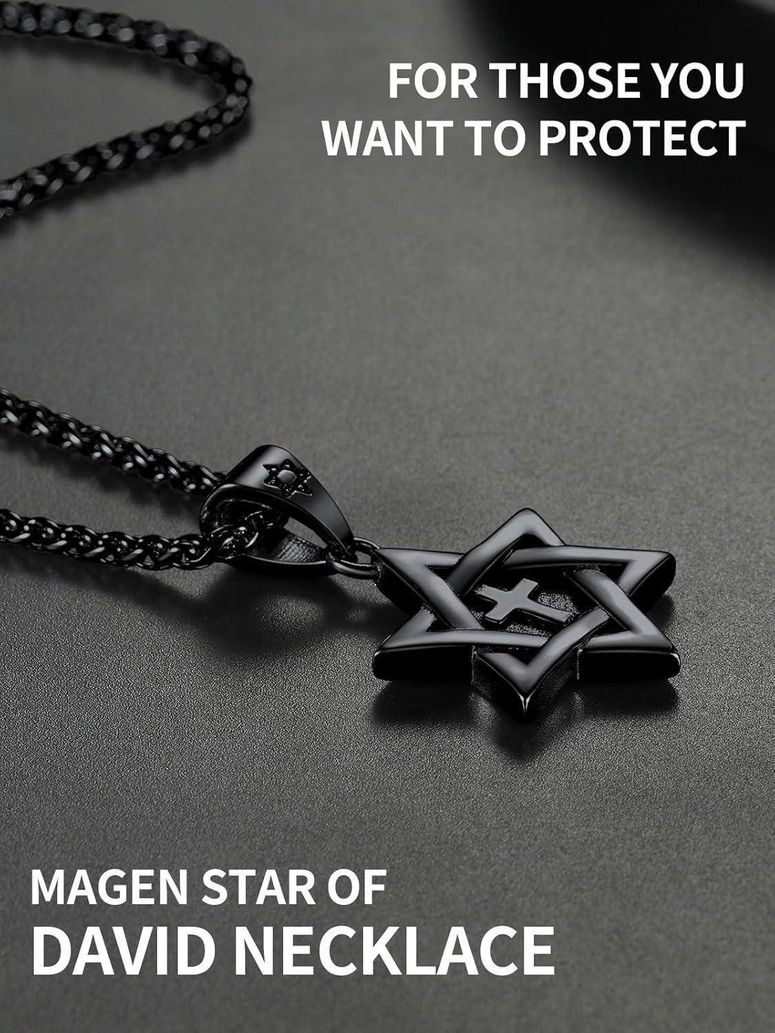 ChainsHouse Magen Star of David Necklace for Men Women, Stainless Steel/18K Gold Plated Hexagram/Dog Tag Pendant Jewish Israel Jewelry(02-Black-Cross Star)
