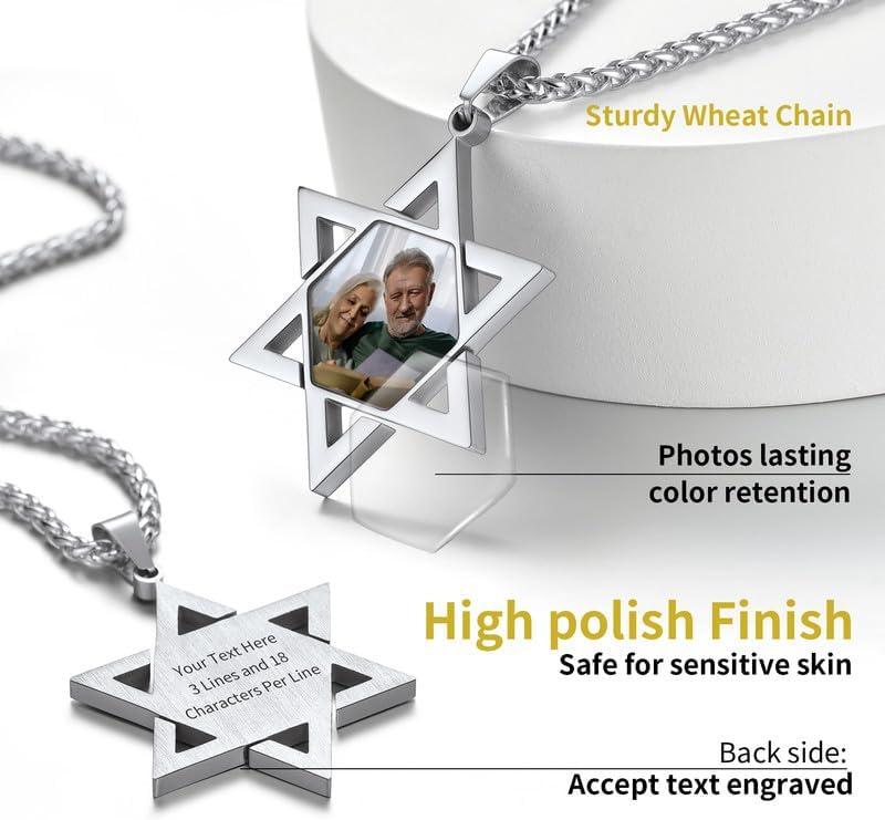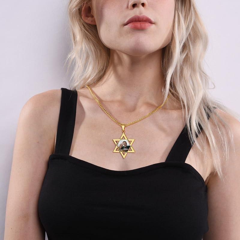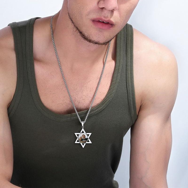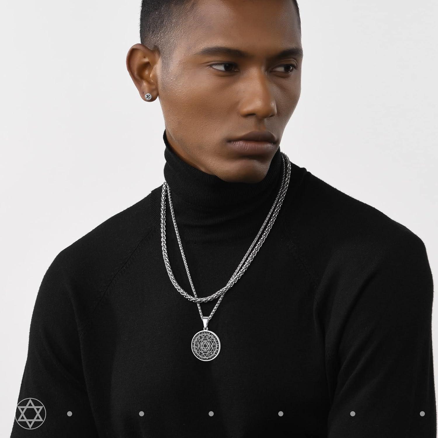 ChainsHouse Magen Star of David Necklace for Men Women, Stainless Steel/18K Gold Plated Hexagram/Dog Tag Pendant Jewish Israel Jewelry(03-Steel-Round Star)