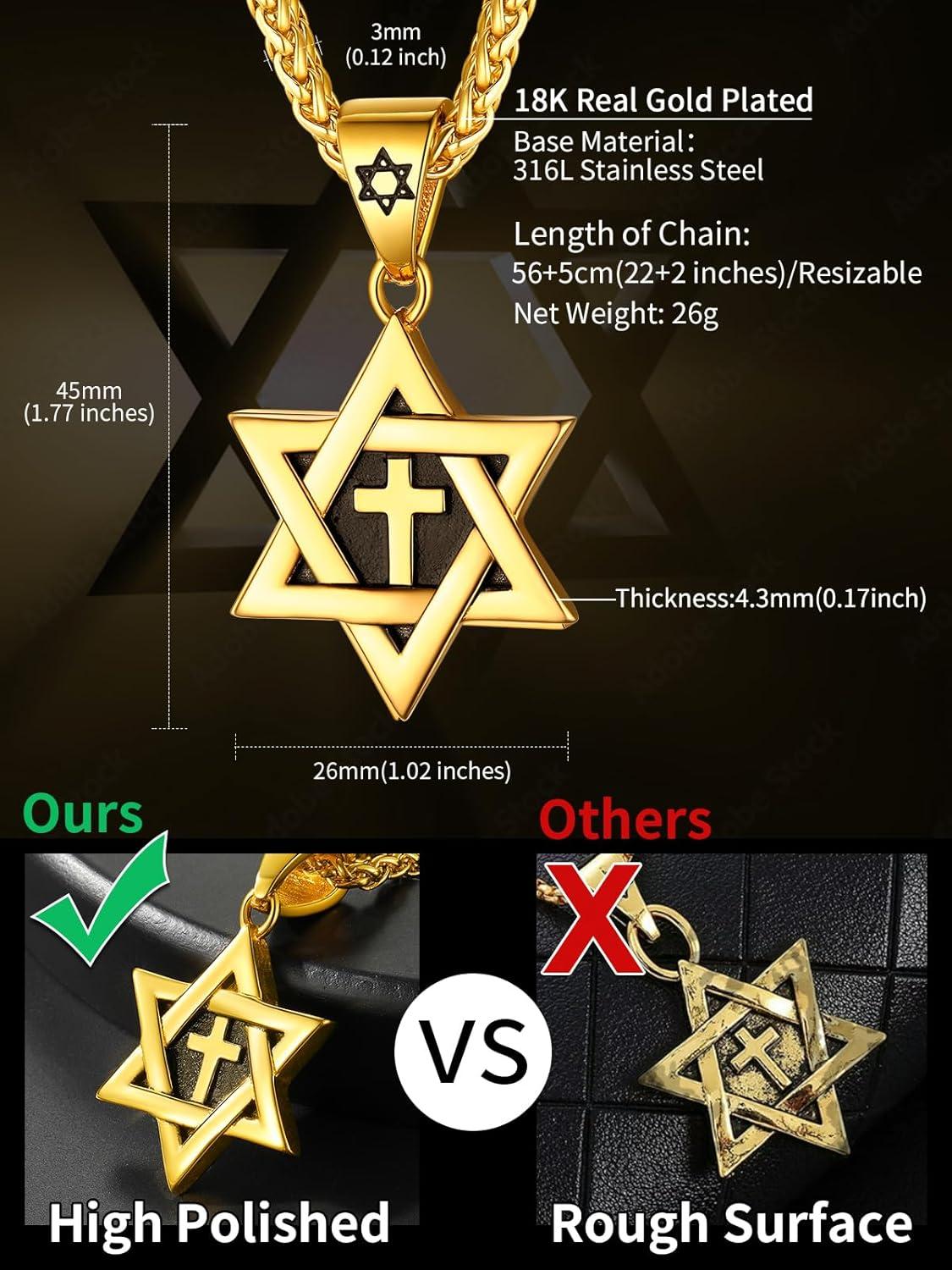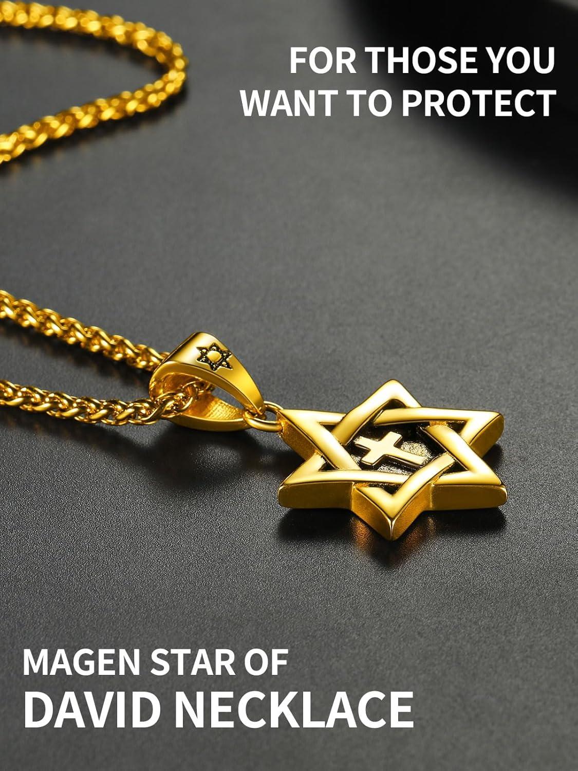 ChainsHouse Magen Star of David Necklace for Men Women, Stainless Steel/18K Gold Plated Hexagram/Dog Tag Pendant Jewish Israel Jewelry(02-Gold-Cross Star)