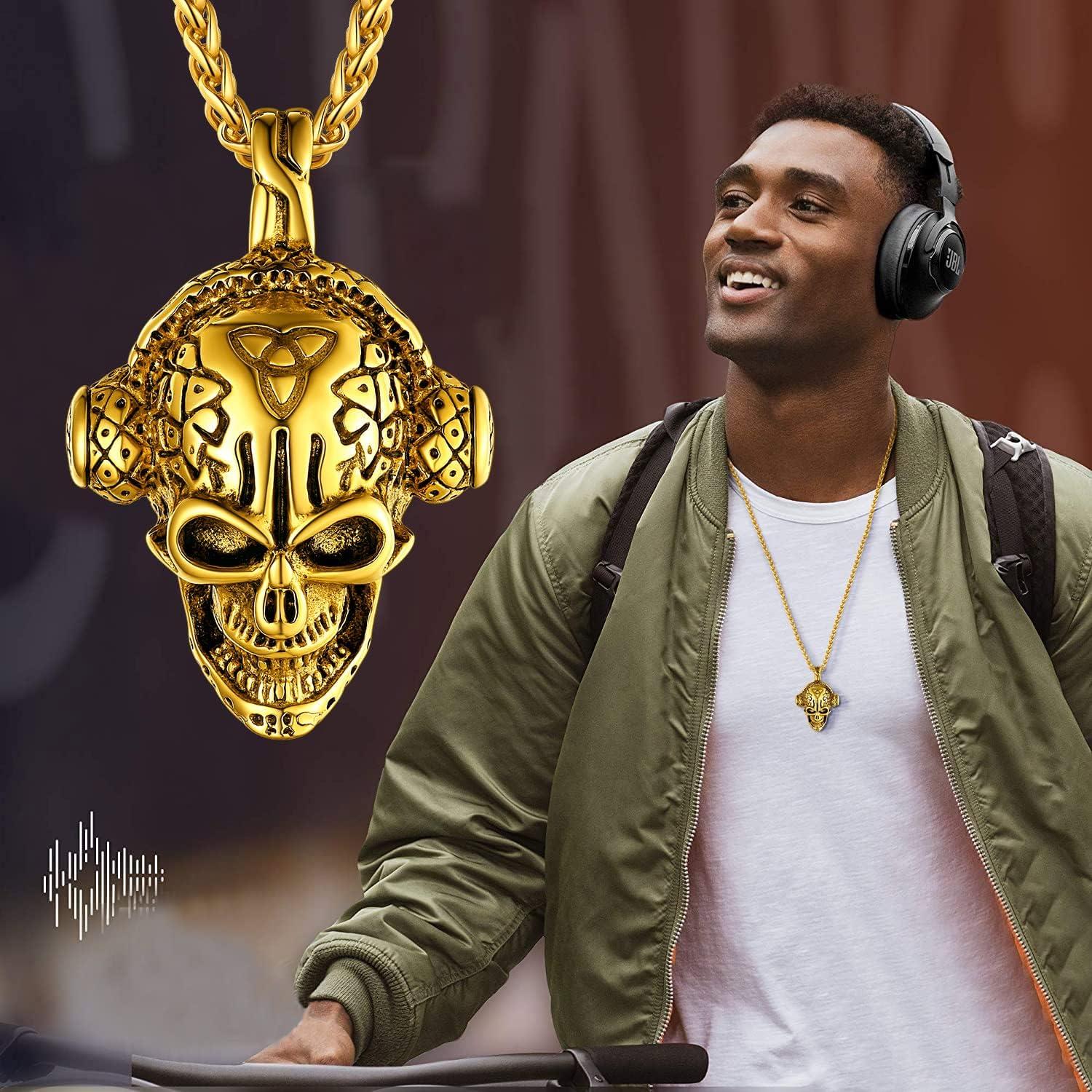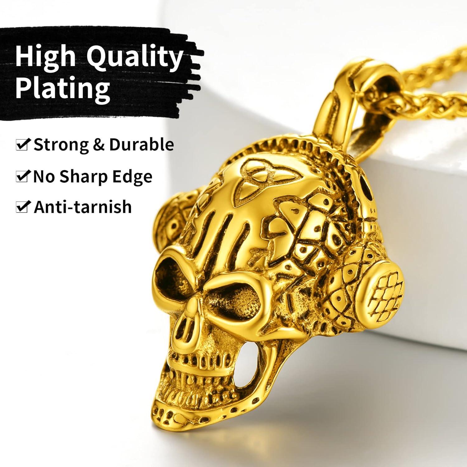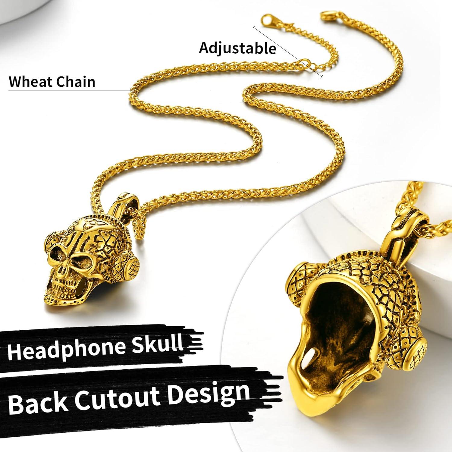 ChainsHouse Skull Necklace for Men, Retro Gothic Punk Jewelry Biker Necklace for Men Women Free Engraving Stainless Steel Dog Tag Pendant Necklace,with Gift Box(05. Earphone-Gold)