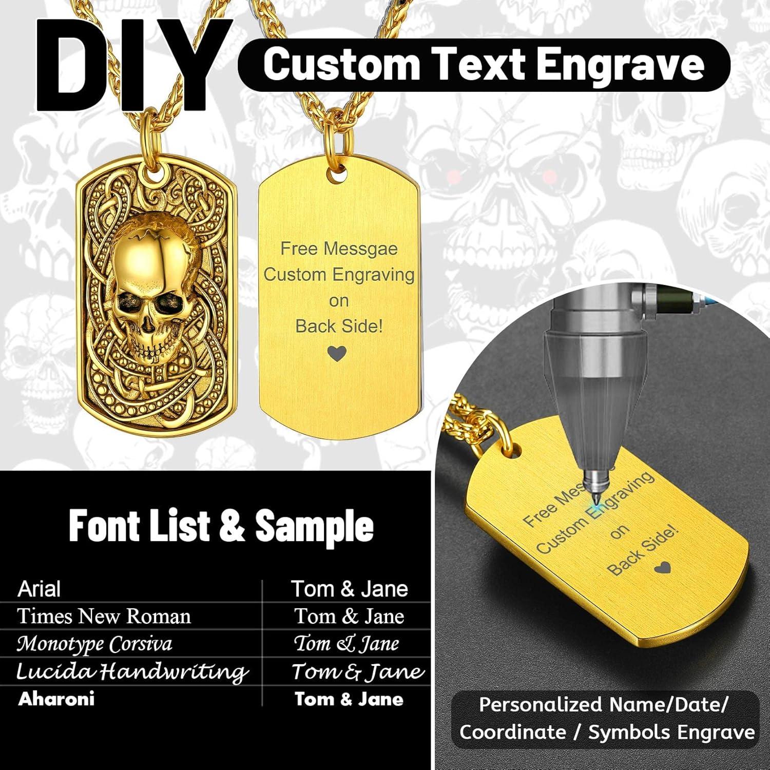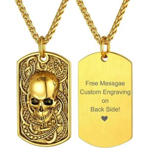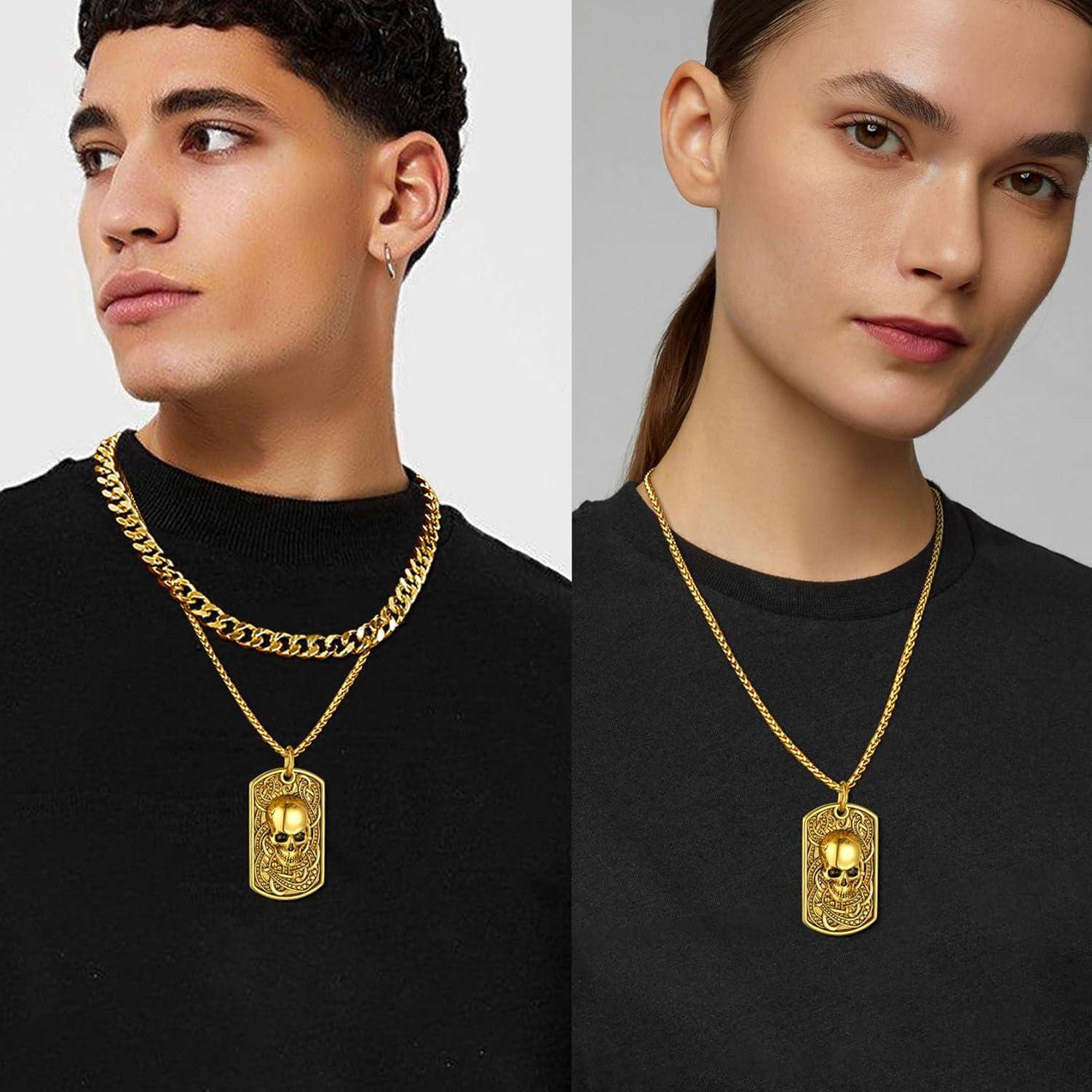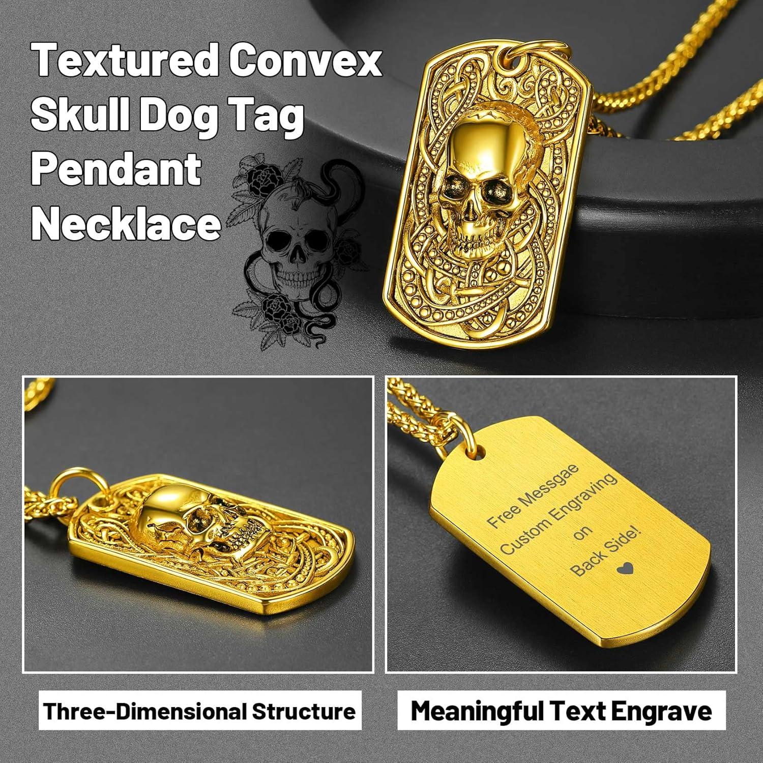 ChainsHouse Skull Necklace for Men, Retro Gothic Punk Jewelry Biker Necklace for Men Women Free Engraving Stainless Steel Dog Tag Pendant Necklace,with Gift Box(03. Dogtag-Gold)