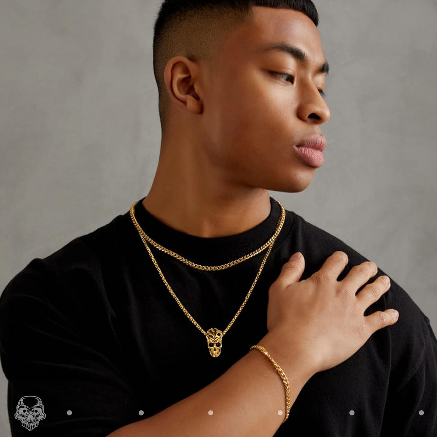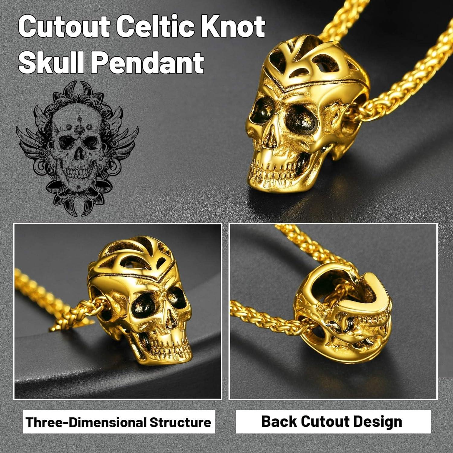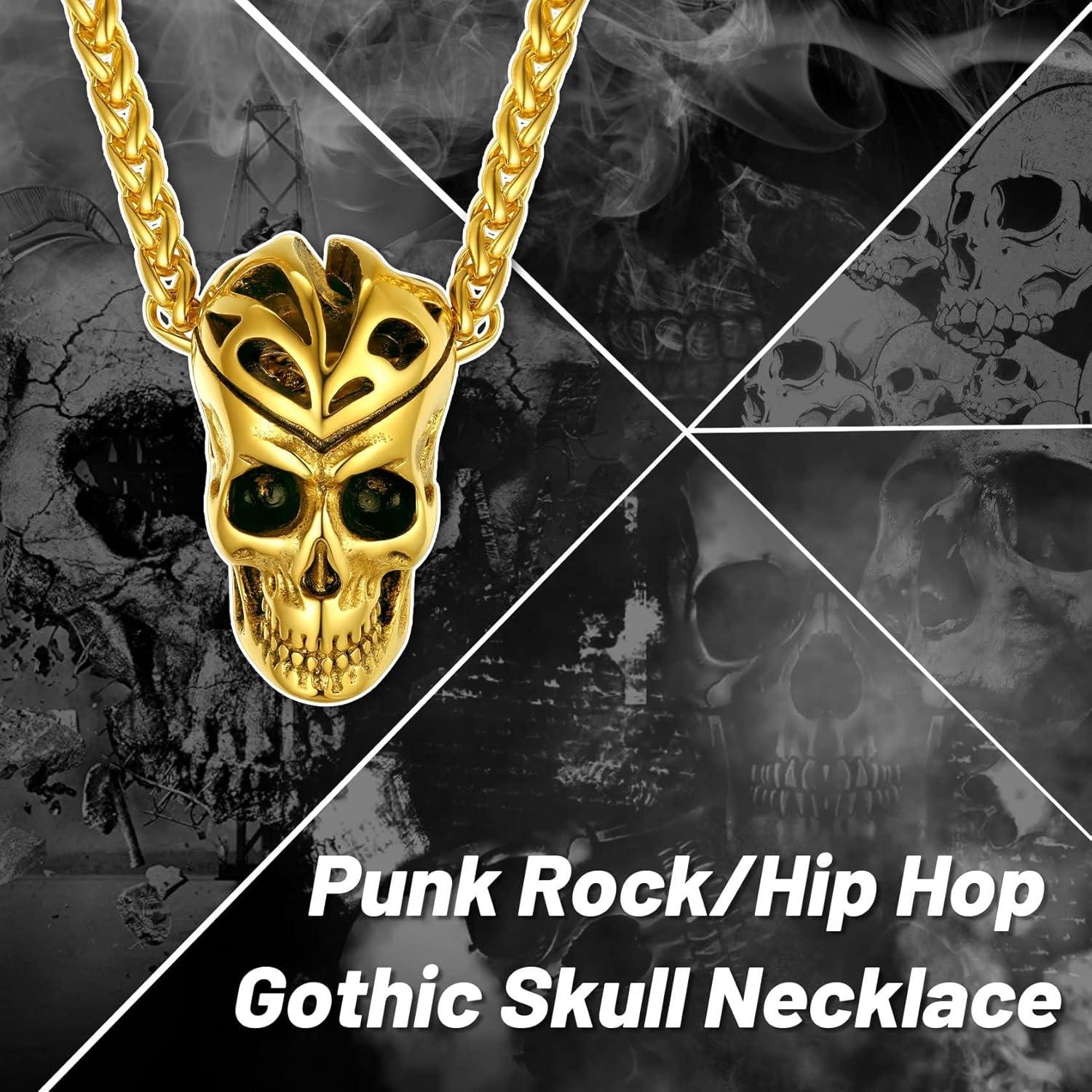 ChainsHouse Skull Necklace for Men, Retro Gothic Punk Jewelry Biker Necklace for Men Women Free Engraving Stainless Steel Dog Tag Pendant Necklace,with Gift Box(04. Skull Head-Gold)