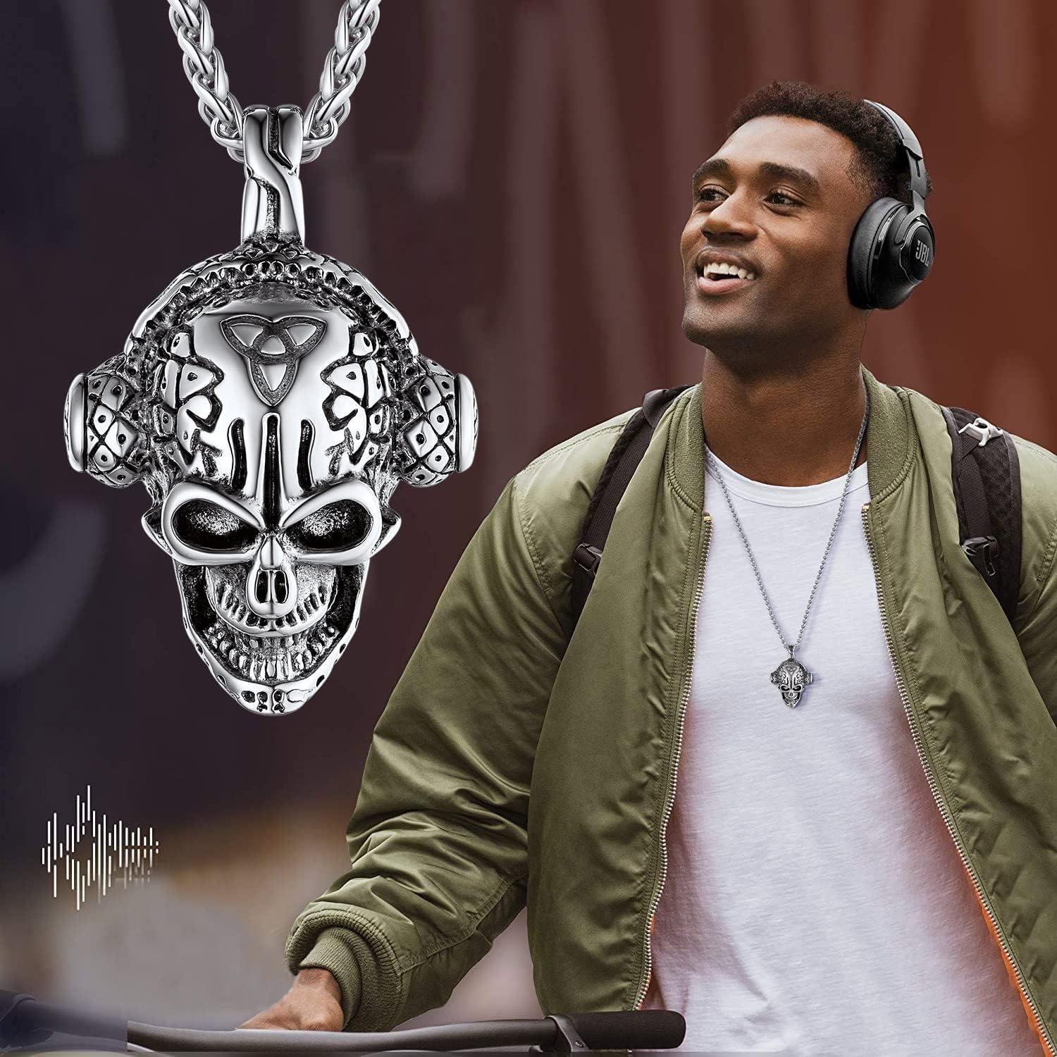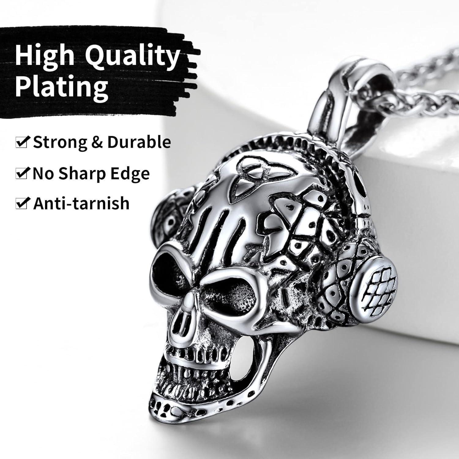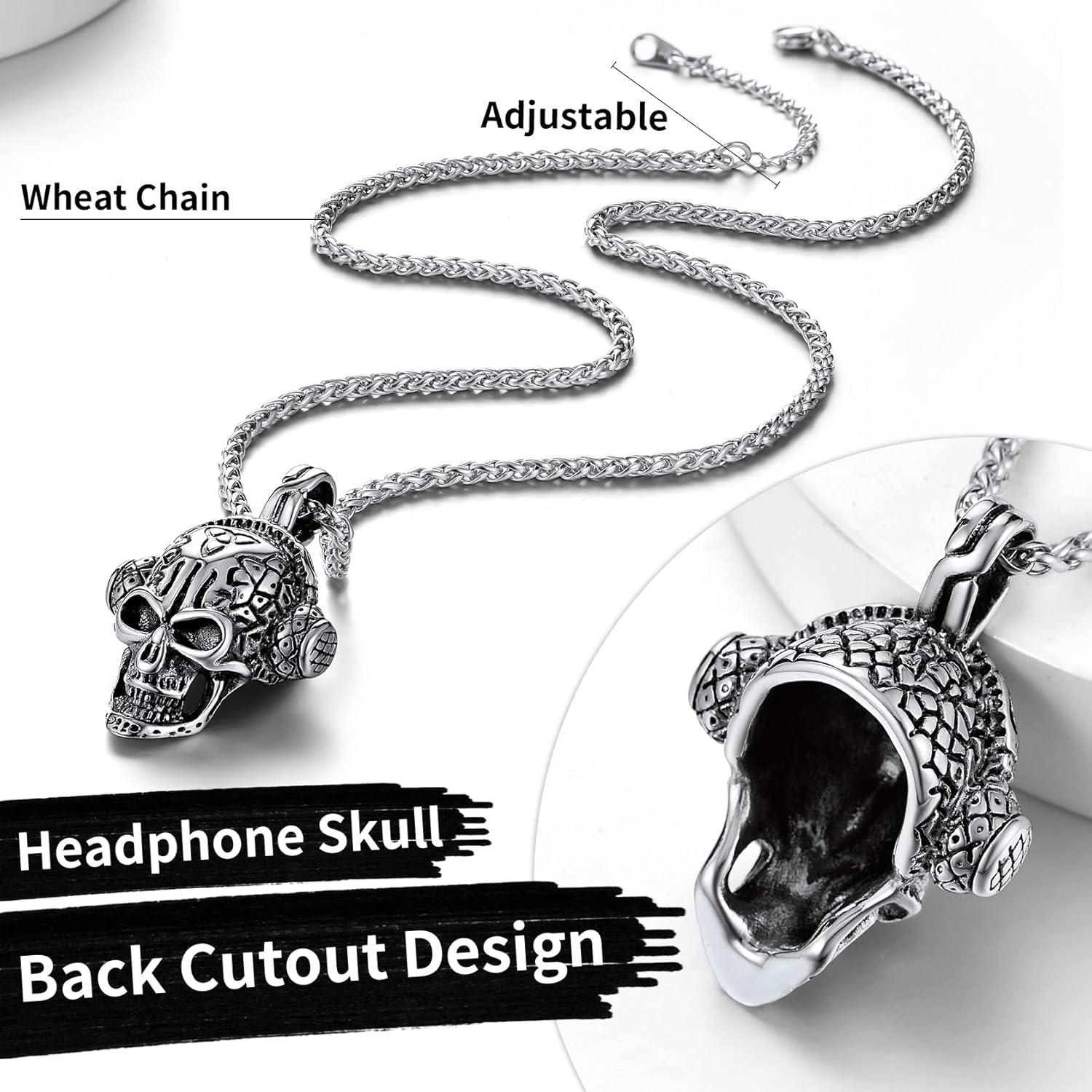 ChainsHouse Skull Necklace for Men, Retro Gothic Punk Jewelry Biker Necklace for Men Women Free Engraving Stainless Steel Dog Tag Pendant Necklace,with Gift Box(05. Earphone-Steel)