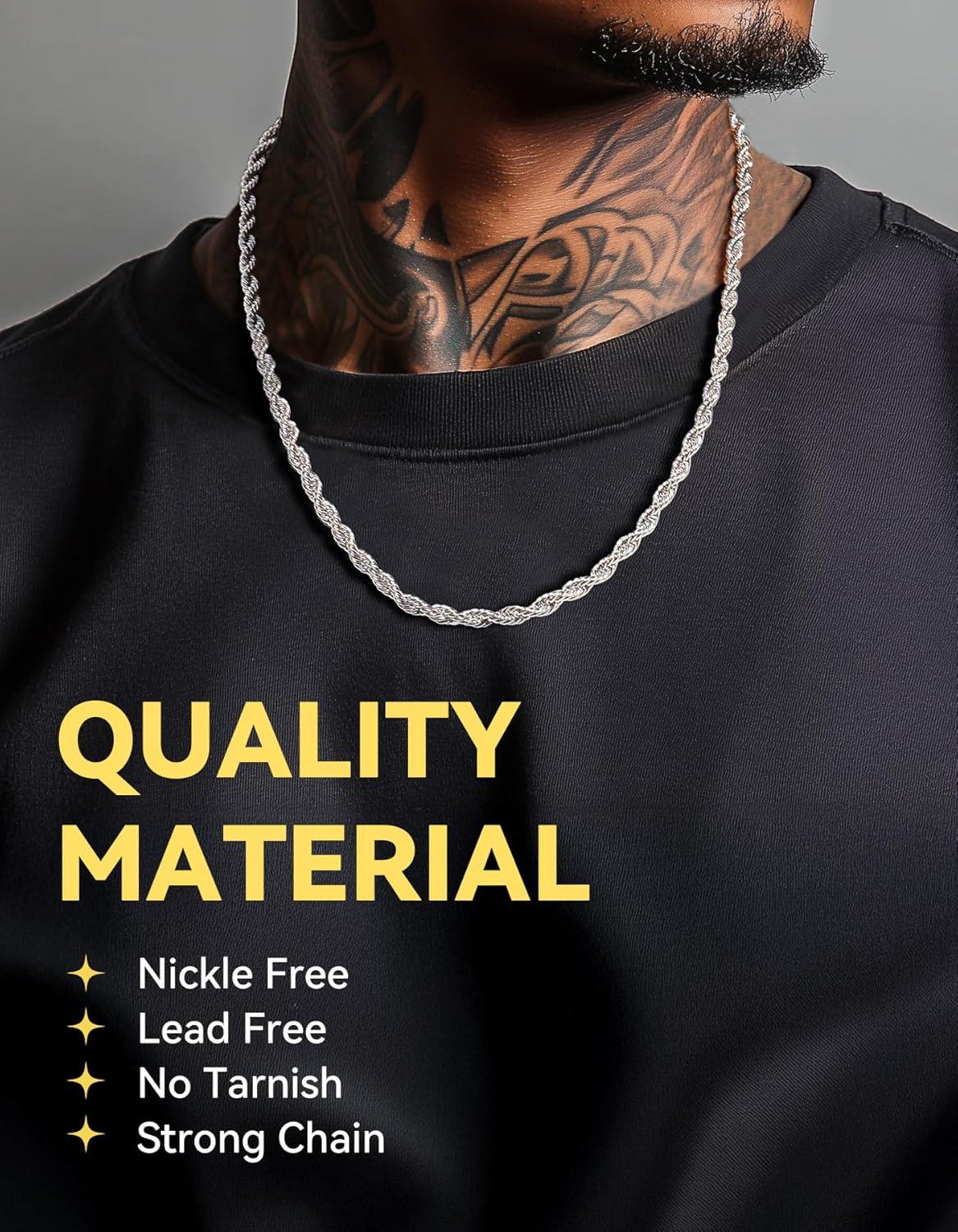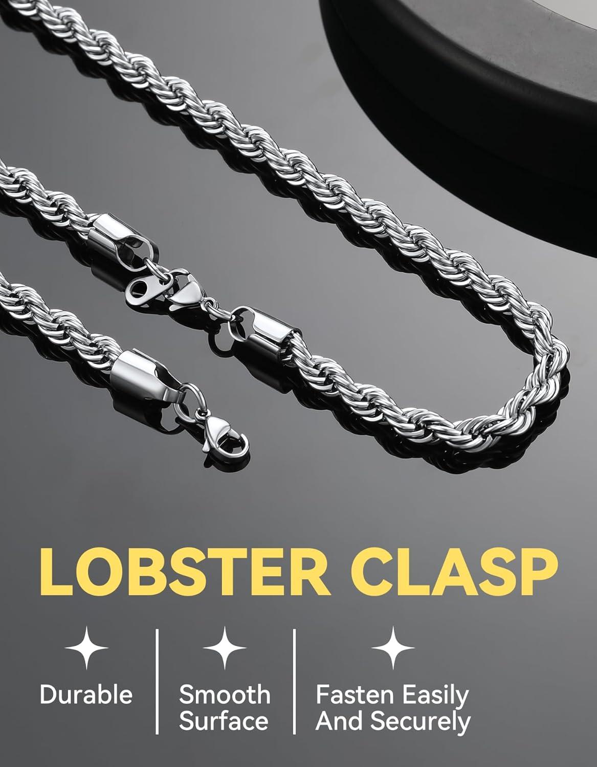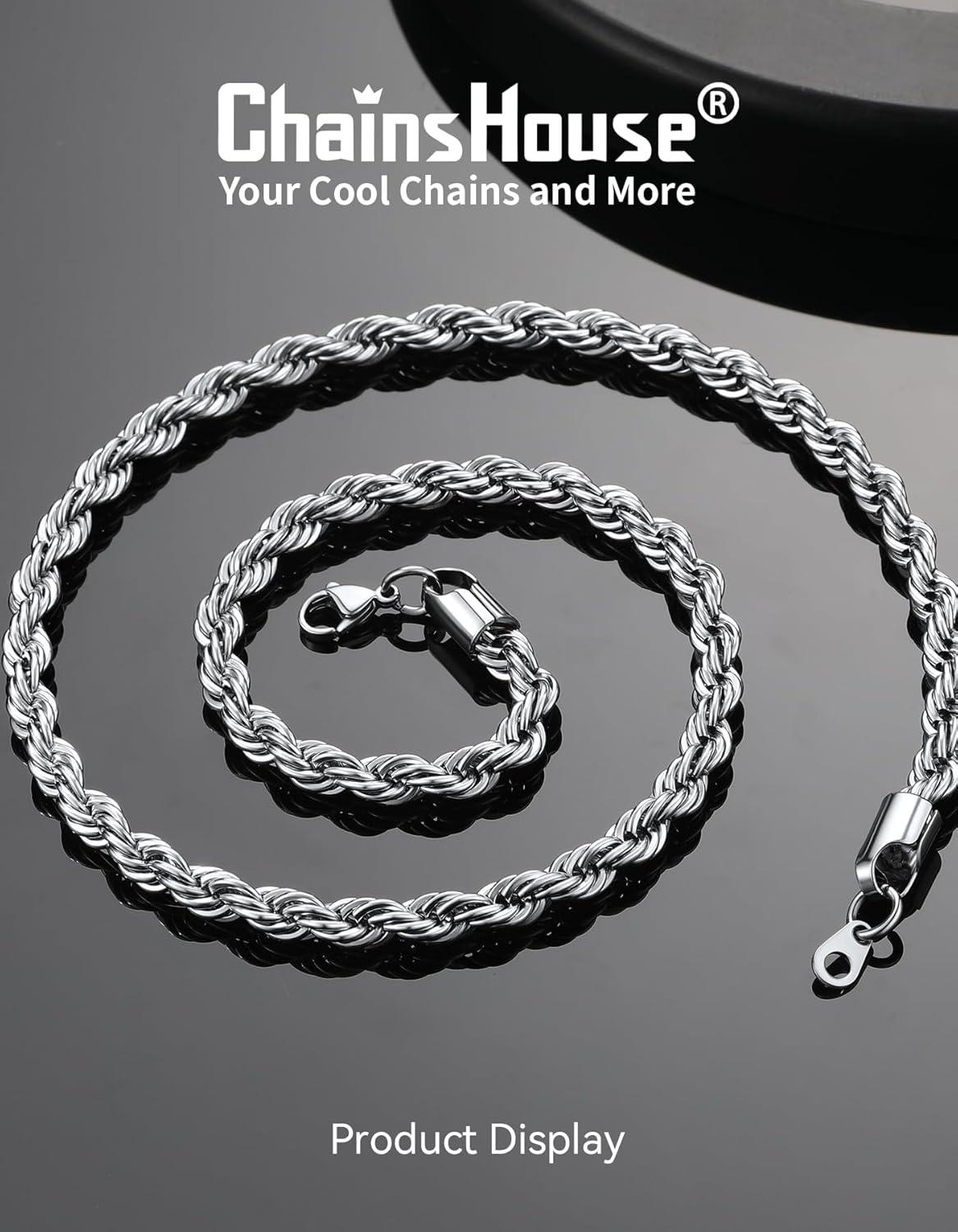 ChainsHouse Rope Chain for Men Women, Stainless Steel Twisted Chain Necklace 1.5mm/2mm/3mm/3.8mm/6mm Width, Black/14K Gold Mens Rope Chains Jewelry 16″-30″, Send Gift Box(a. 3.8mm width-steel)