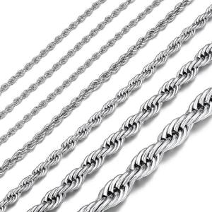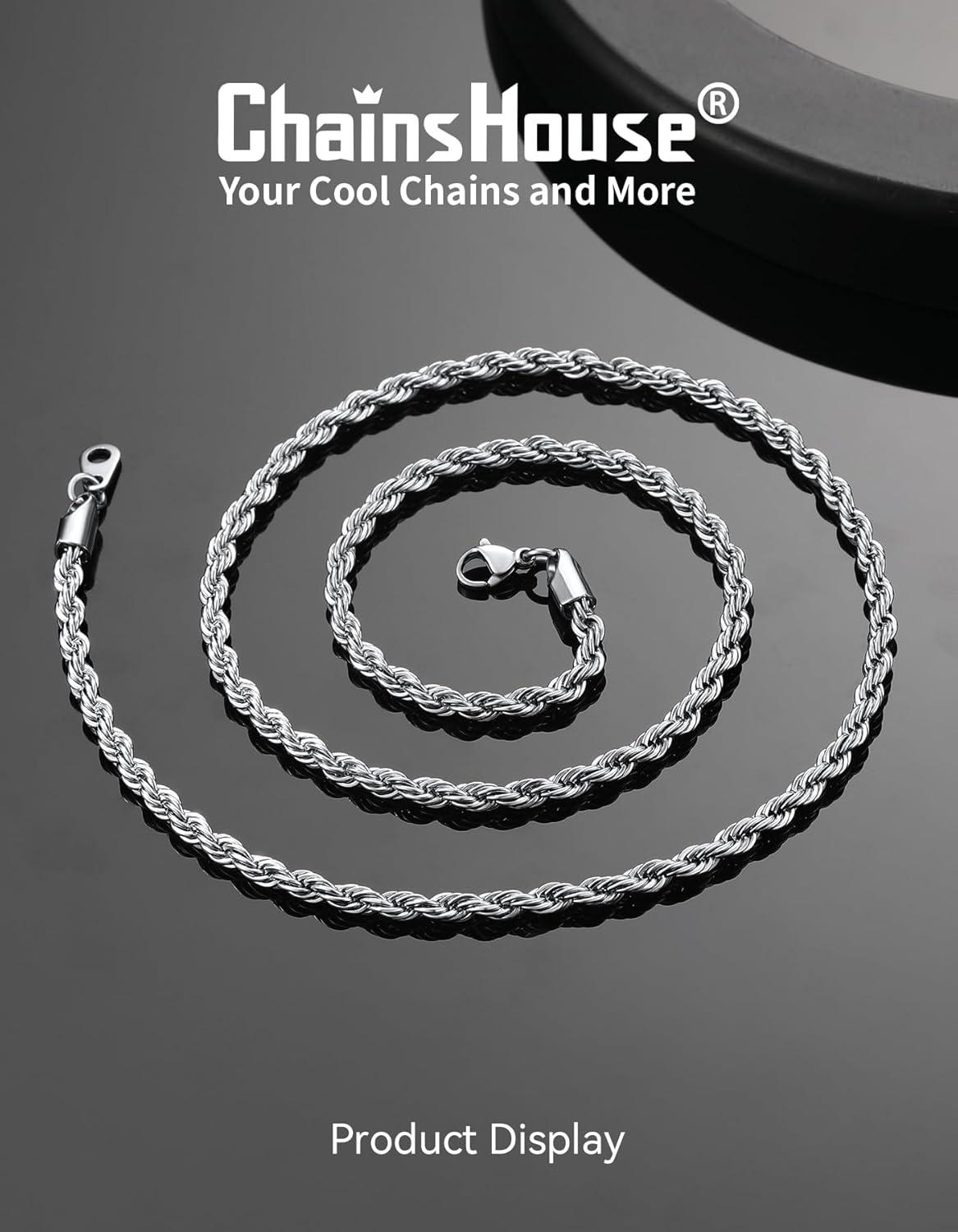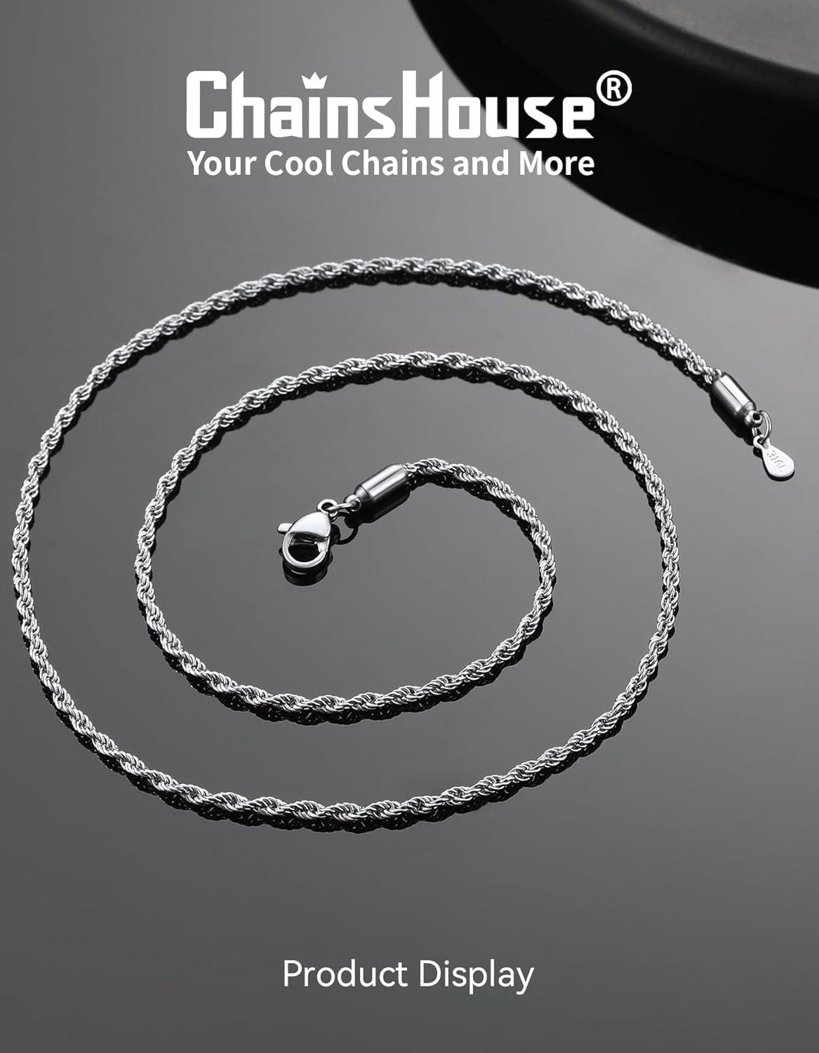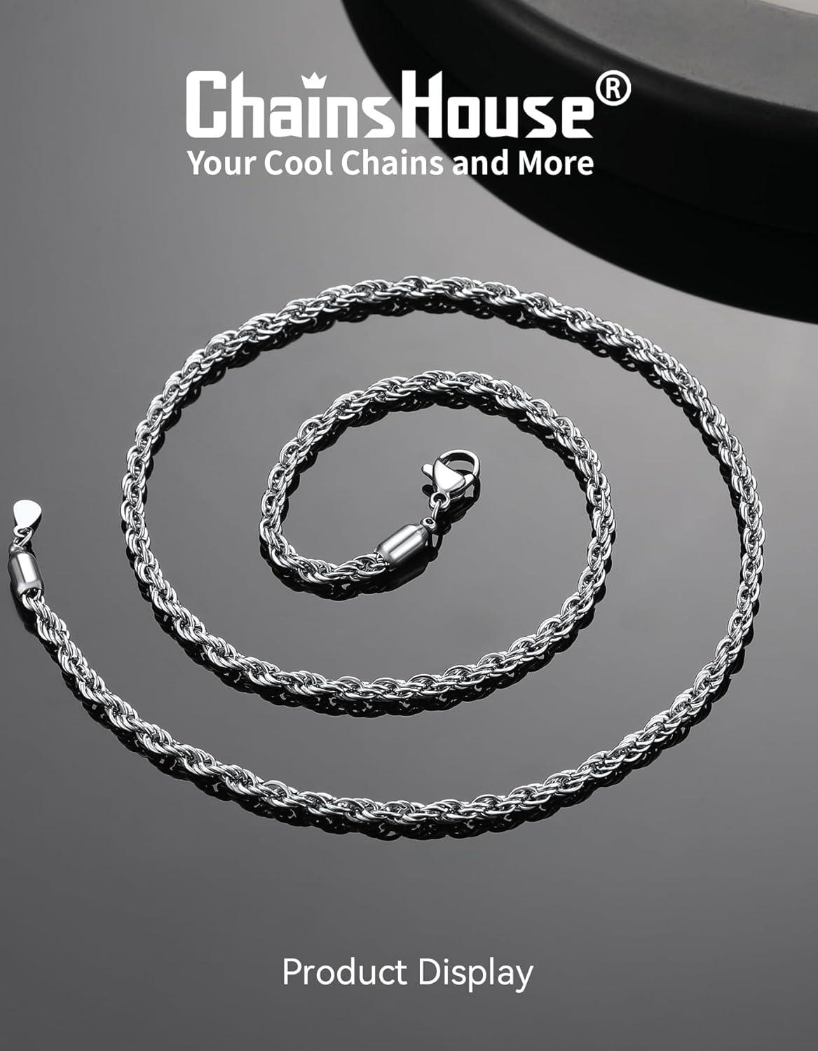 ChainsHouse Rope Chain for Men Women, Stainless Steel Twisted Chain Necklace 1.5mm/2mm/3mm/3.8mm/6mm Width, Black/14K Gold Mens Rope Chains Jewelry 16″-30″, Send Gift Box(a. 3mm width-steel)
