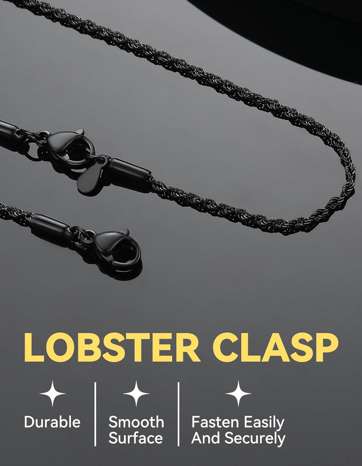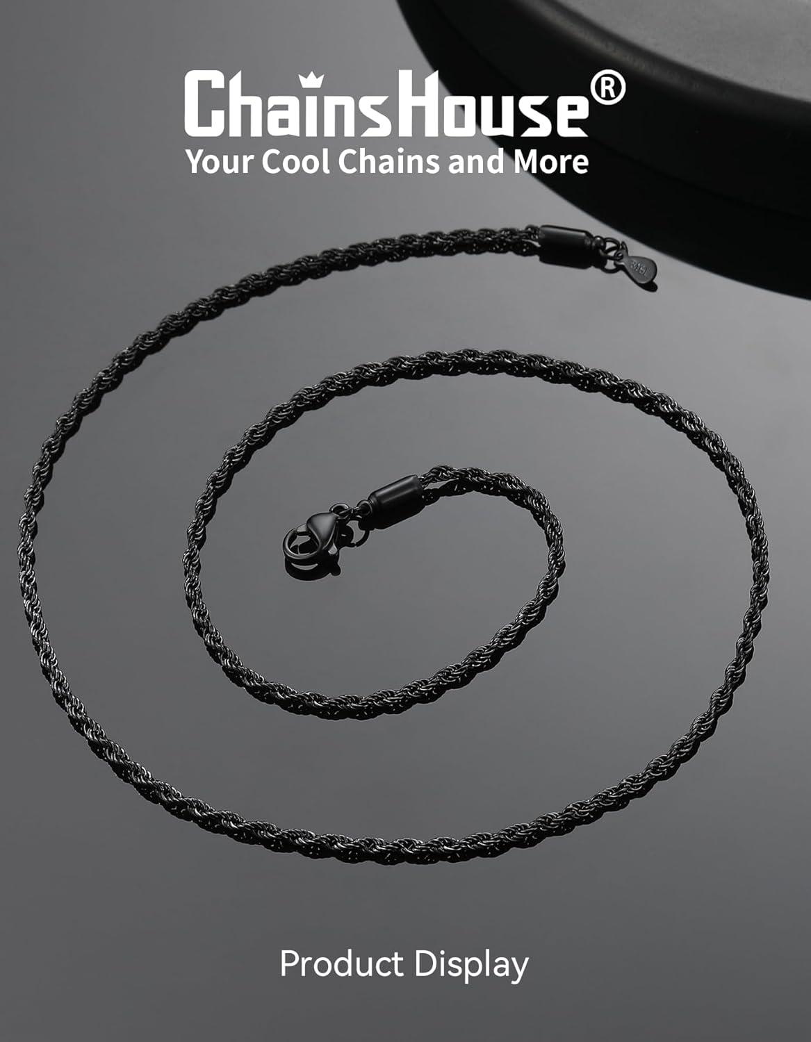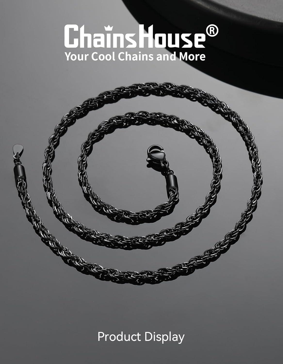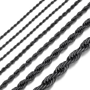 ChainsHouse Rope Chain for Men Women, Stainless Steel Twisted Chain Necklace 1.5mm/2mm/3mm/3.8mm/6mm Width, Black/14K Gold Mens Rope Chains Jewelry 16″-30″, Send Gift Box(c. 3mm width-black)