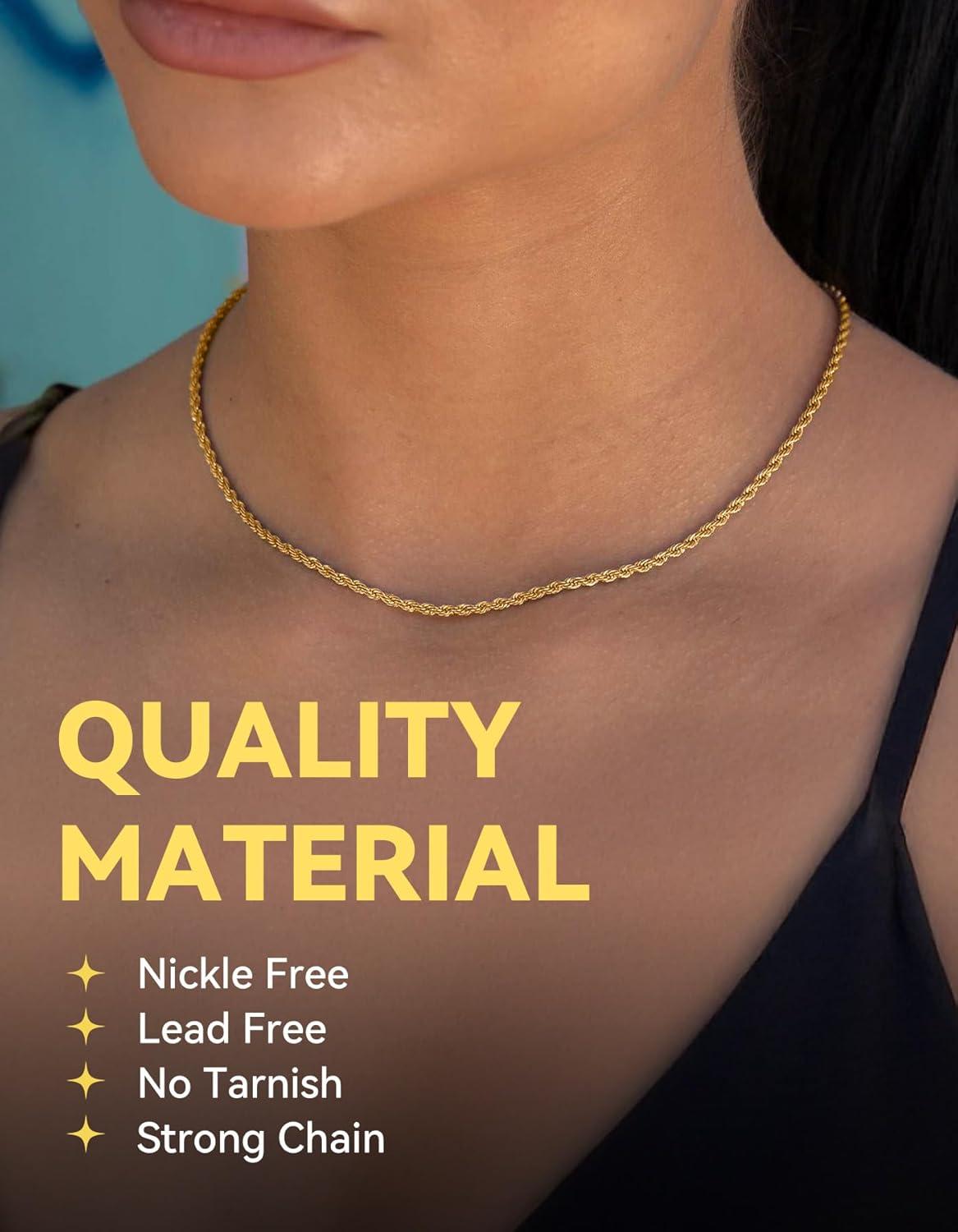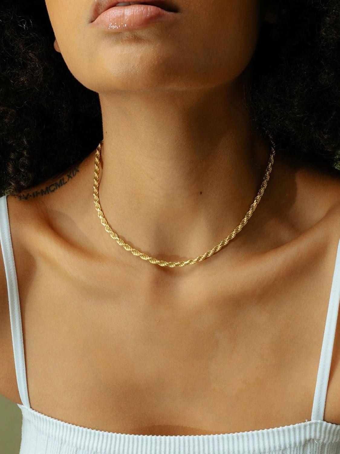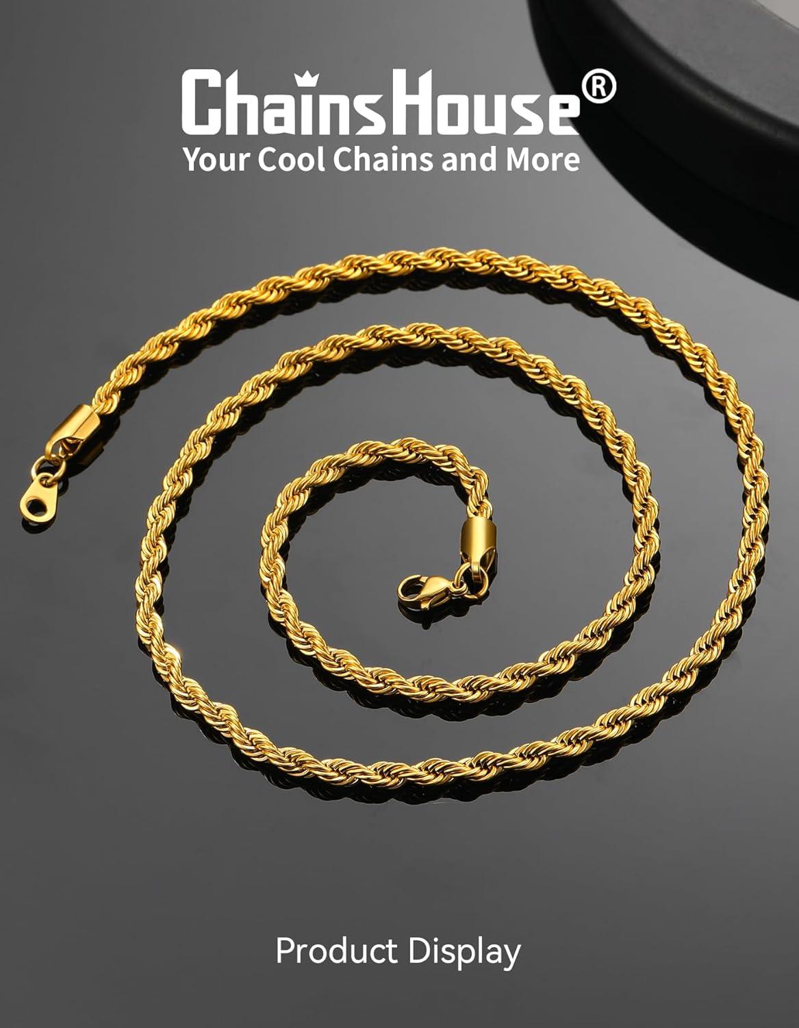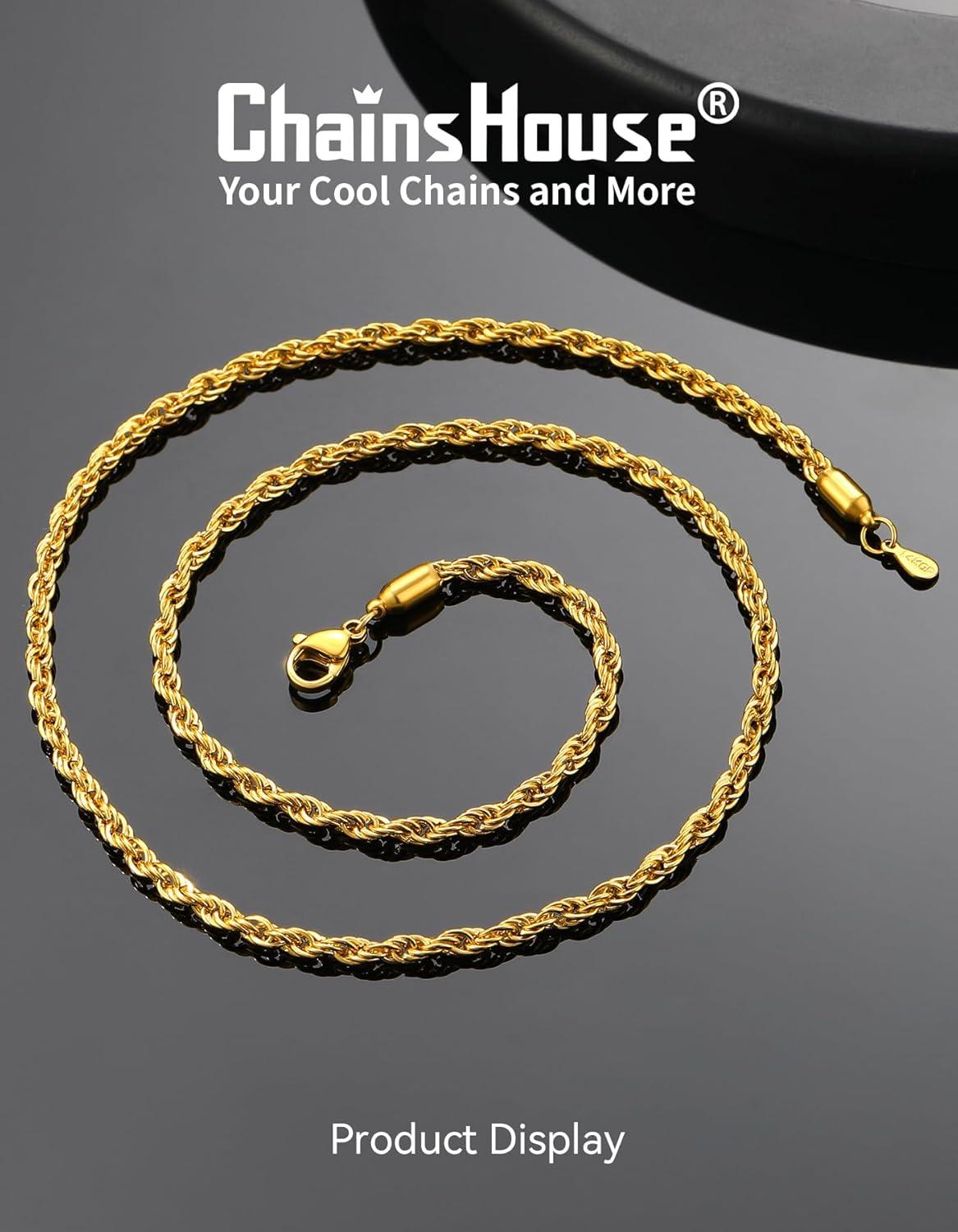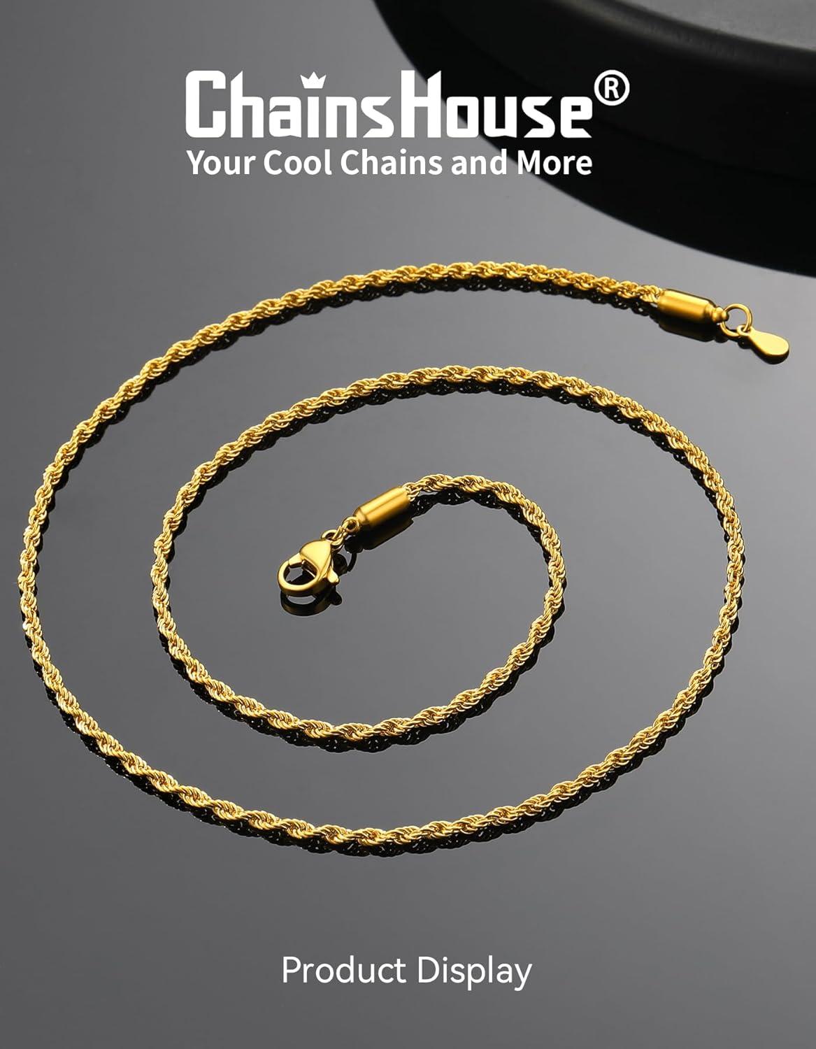 ChainsHouse Rope Chain for Men Women, Stainless Steel Twisted Chain Necklace 1.5mm/2mm/3mm/3.8mm/6mm Width, Black/14K Gold Mens Rope Chains Jewelry 16″-30″, Send Gift Box(b. 3mm width-gold)
