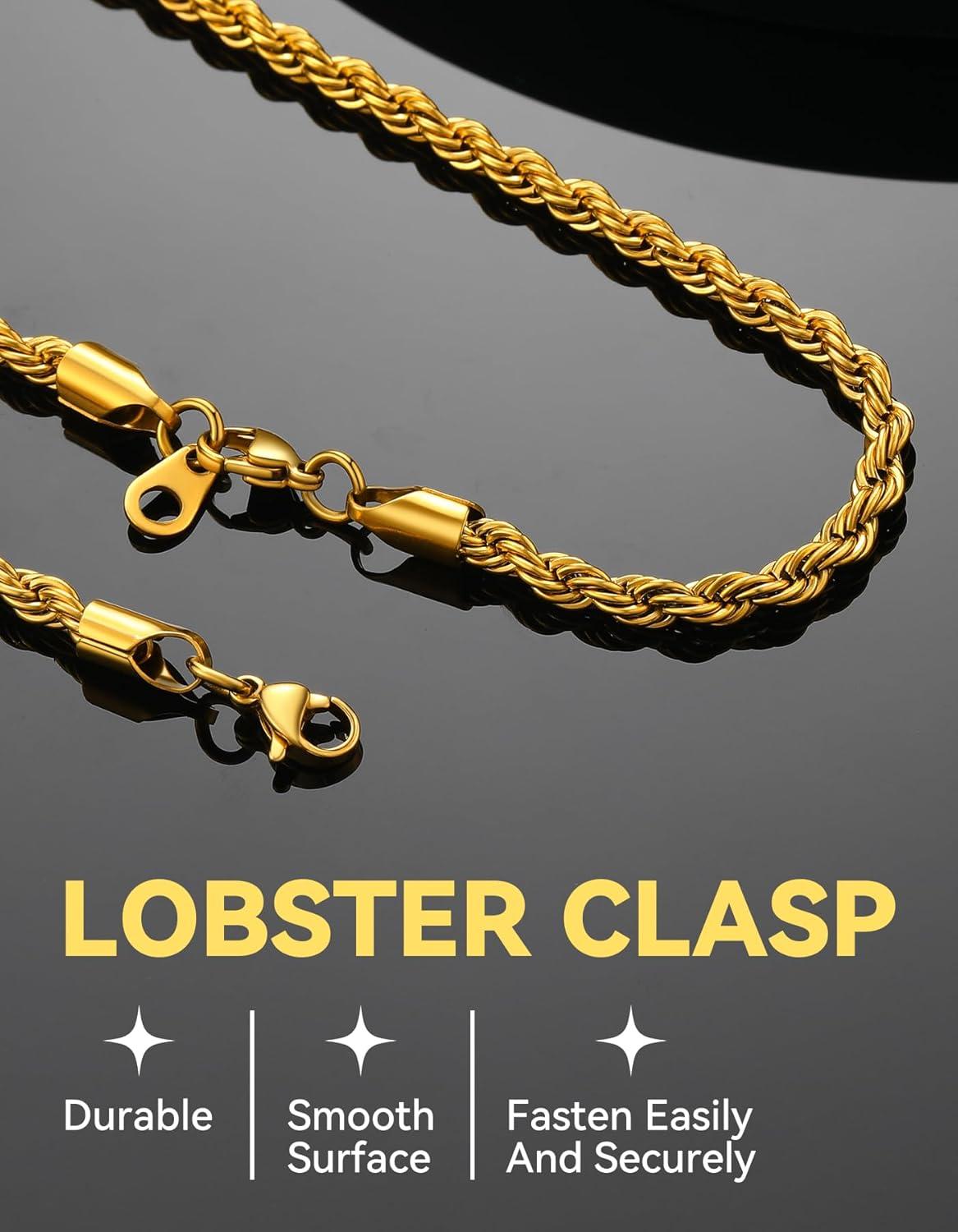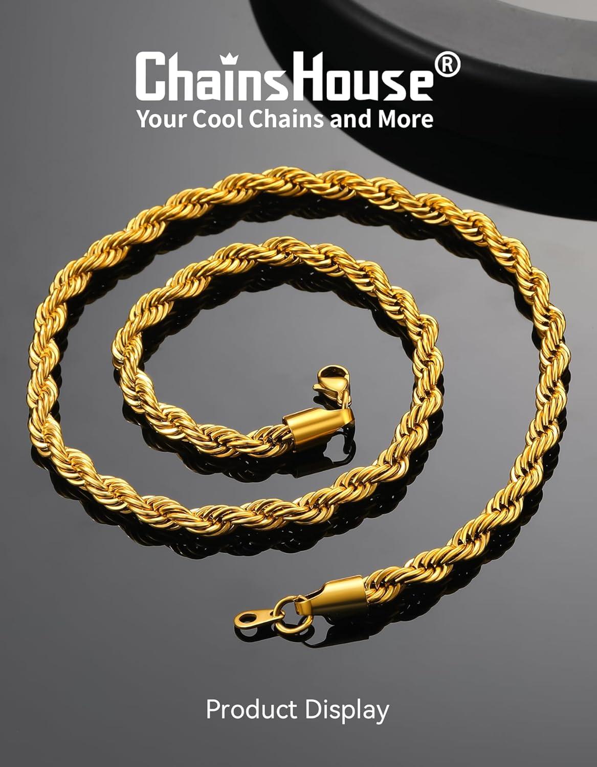 ChainsHouse Rope Chain for Men Women, Stainless Steel Twisted Chain Necklace 1.5mm/2mm/3mm/3.8mm/6mm Width, Black/14K Gold Mens Rope Chains Jewelry 16″-30″, Send Gift Box(b. 3.8mm width-gold)