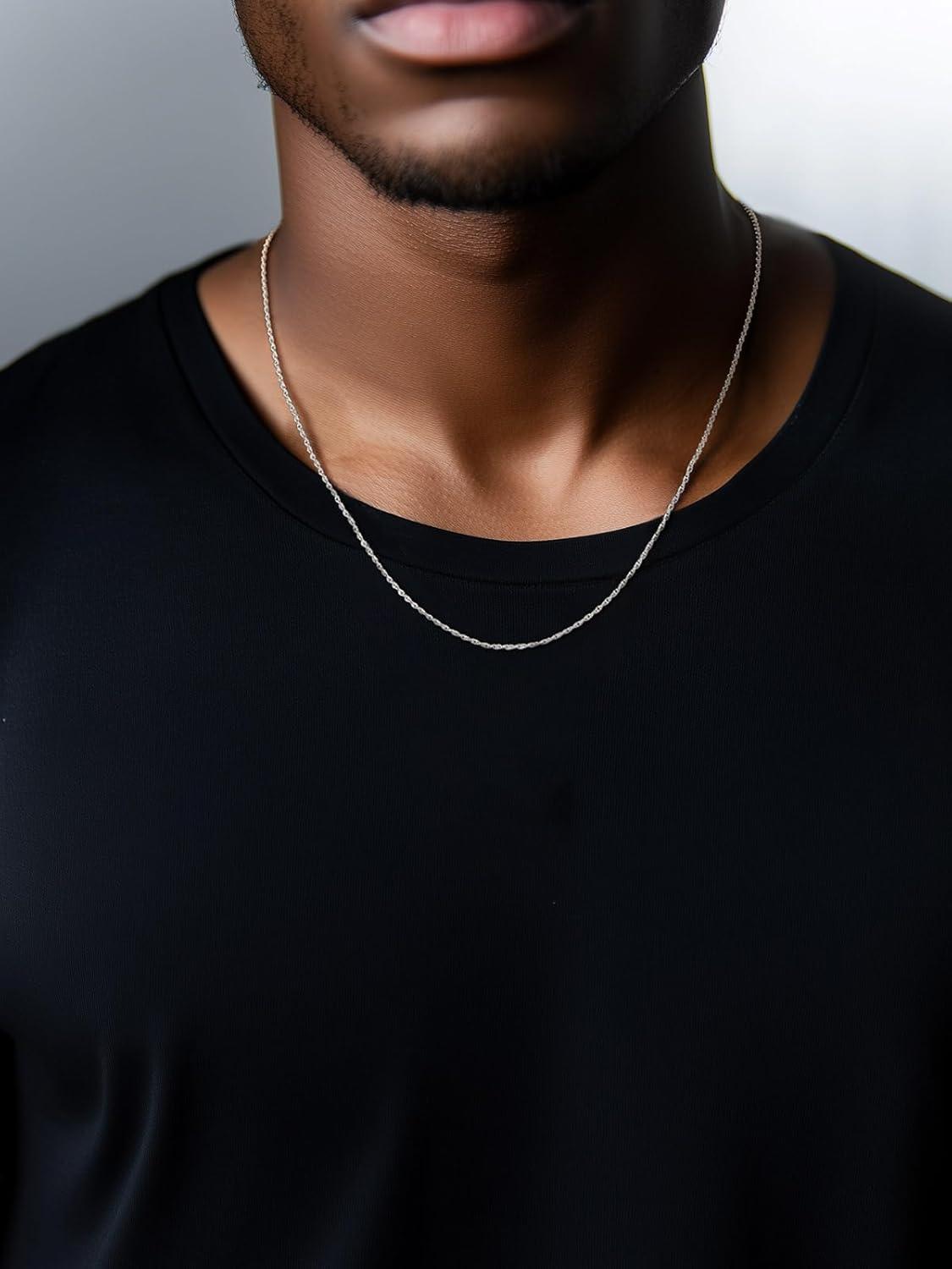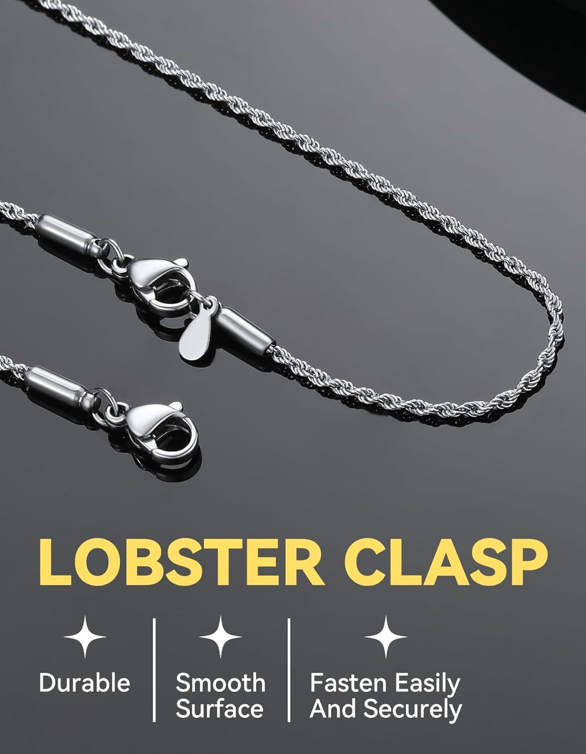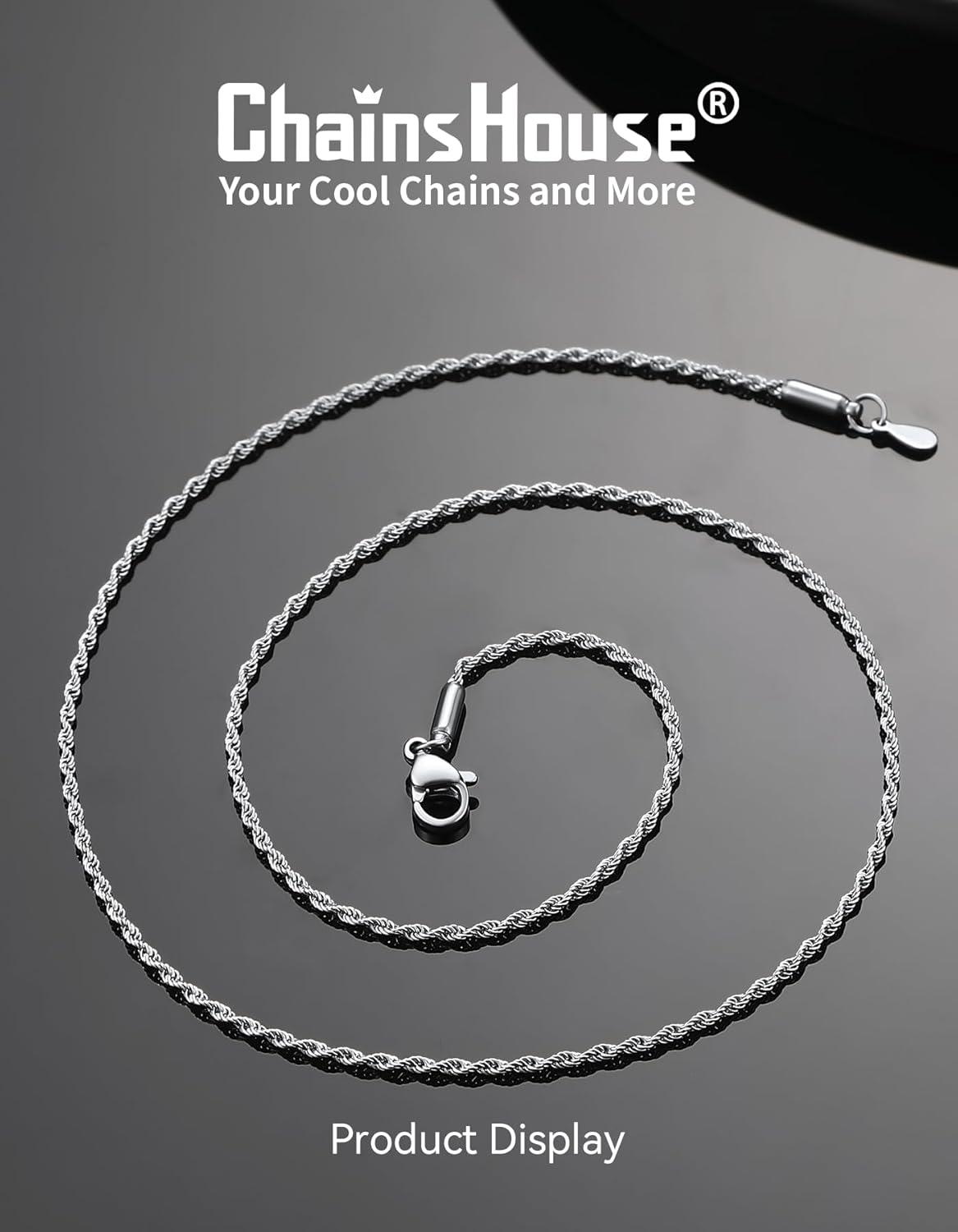 ChainsHouse Rope Chain for Men Women, Stainless Steel Twisted Chain Necklace 1.5mm/2mm/3mm/3.8mm/6mm Width, Black/14K Gold Mens Rope Chains Jewelry 16″-30″, Send Gift Box(a. 2mm width-steel)