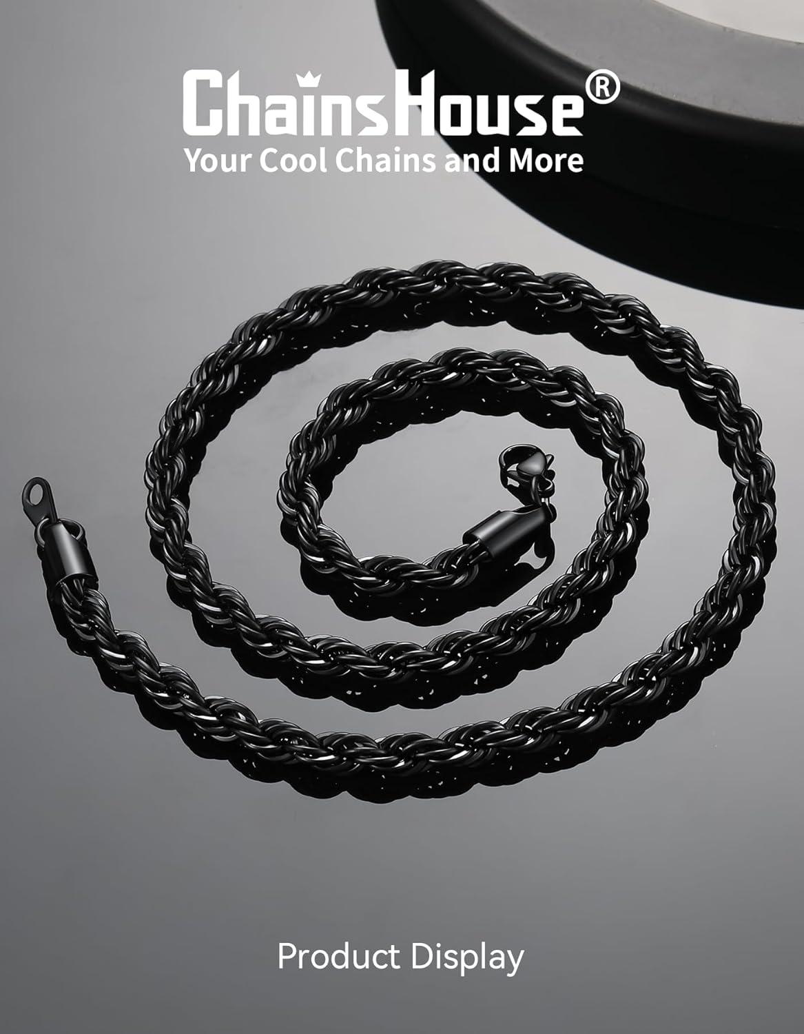 ChainsHouse Rope Chain for Men Women, Stainless Steel Twisted Chain Necklace 1.5mm/2mm/3mm/3.8mm/6mm Width, Black/14K Gold Mens Rope Chains Jewelry 16″-30″, Send Gift Box(c. 6mm width-black)