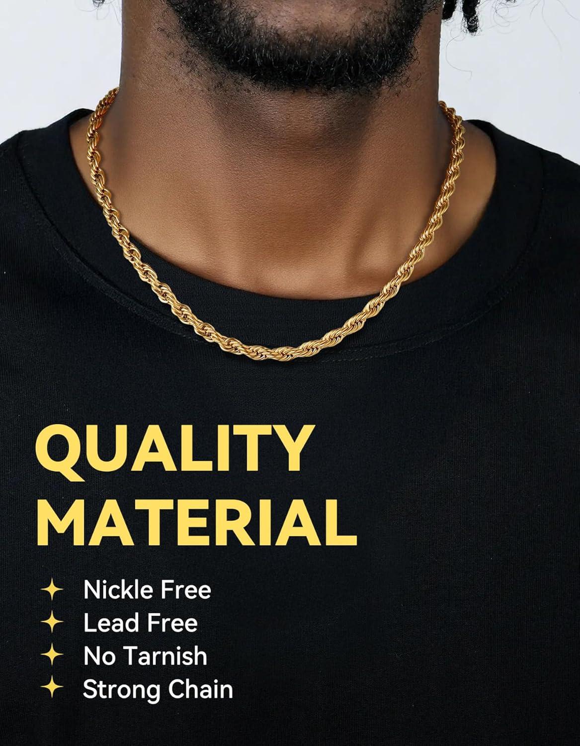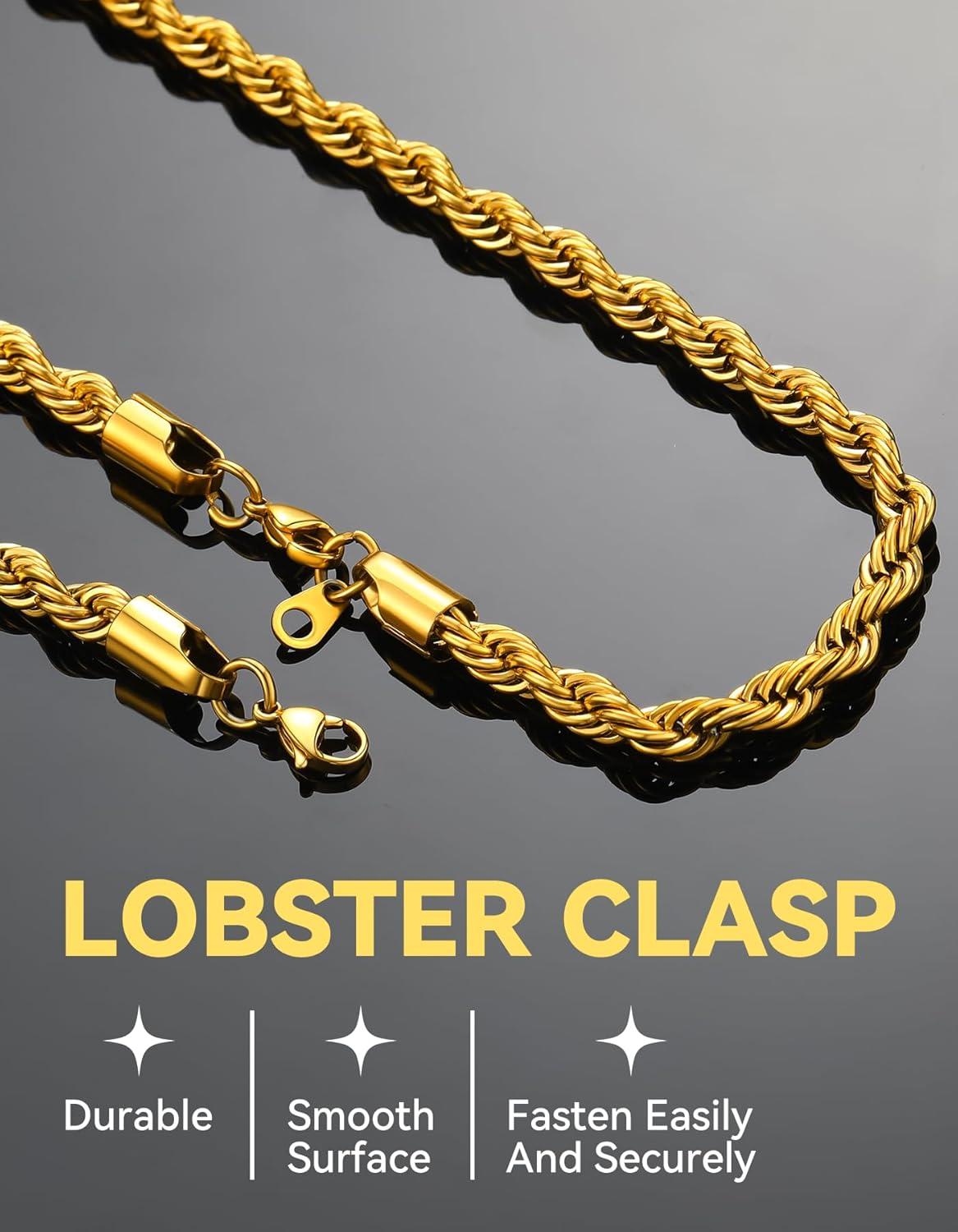 ChainsHouse Rope Chain for Men Women, Stainless Steel Twisted Chain Necklace 1.5mm/2mm/3mm/3.8mm/6mm Width, Black/14K Gold Mens Rope Chains Jewelry 16″-30″, Send Gift Box(b. 6mm width-gold)
