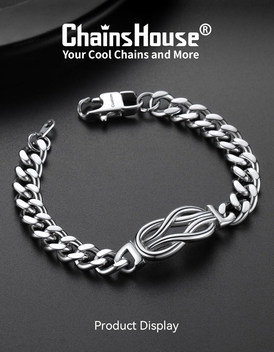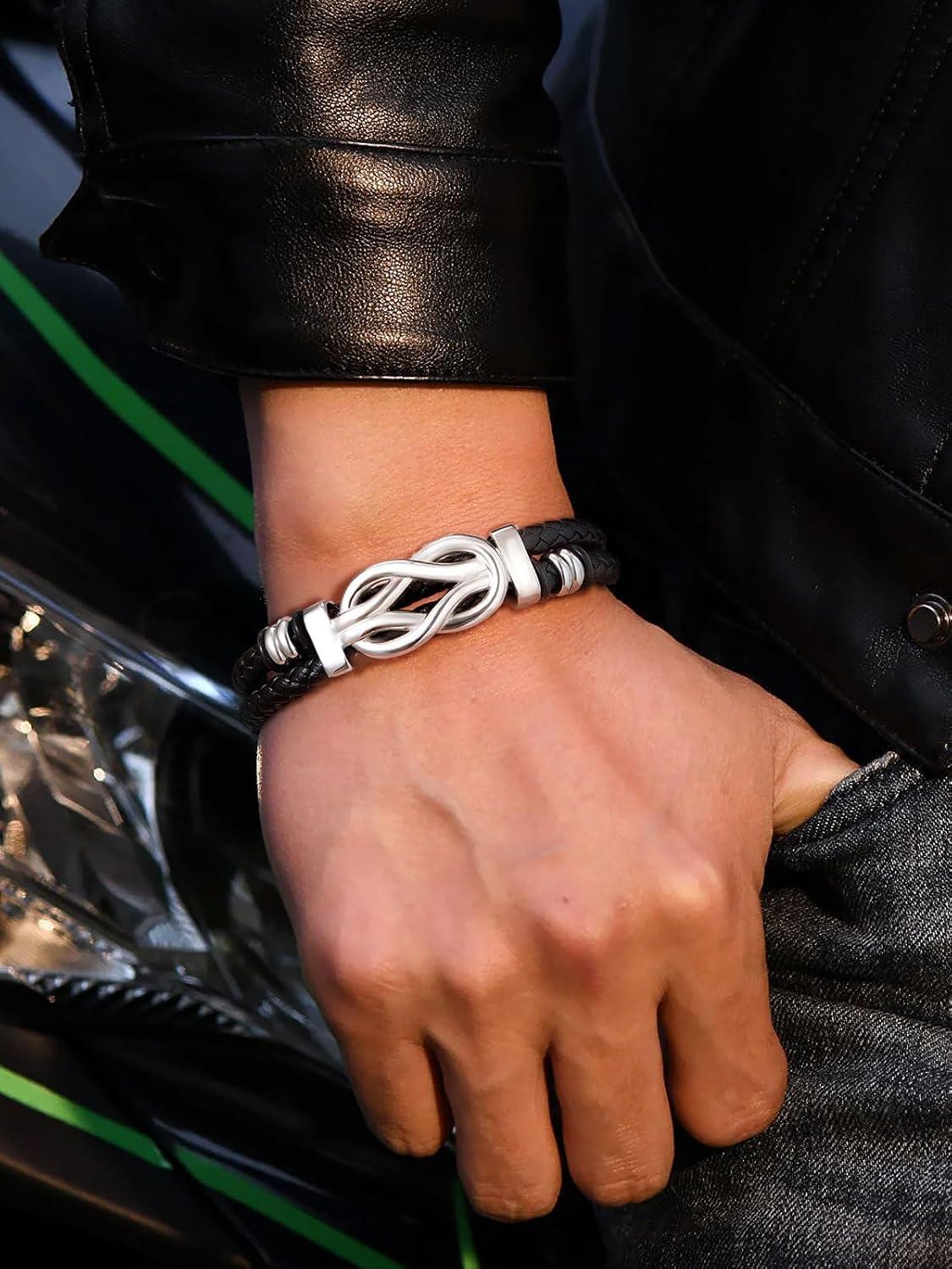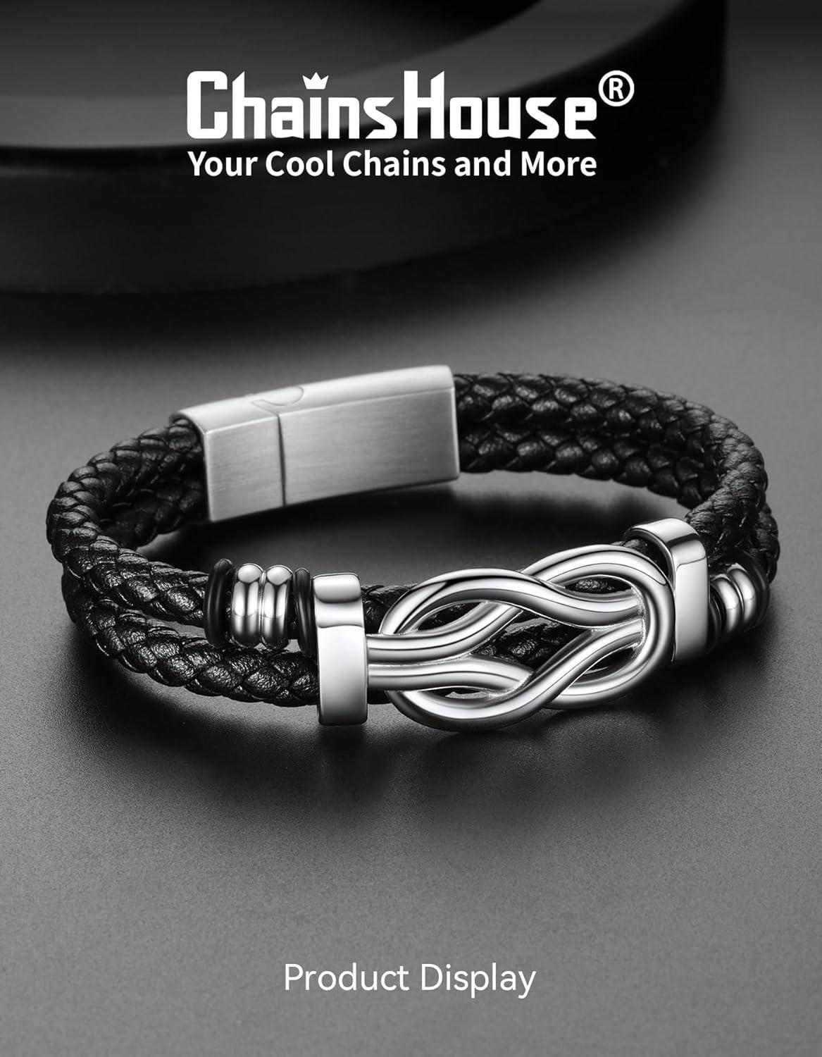 ChainsHouse Square Love Knot Bracelets for Men Braided Leather Stainless Steel Infinity Bracelets with Love Message Card Aniversary Birthday Gift for Men/Love/Husband/Dad(23-Custom-Steel)