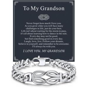 ChainsHouse Square Love Knot Bracelets for Men Braided Leather Stainless Steel Infinity Bracelets with Love Message Card Aniversary Birthday Gift for Men/Love/Husband/Dad(12-To My Grandson-Steel)