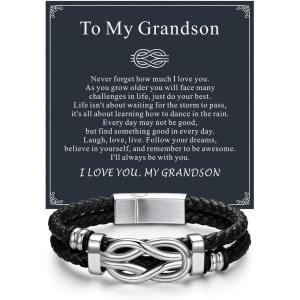 ChainsHouse Square Love Knot Bracelets for Men Braided Leather Stainless Steel Infinity Bracelets with Love Message Card Aniversary Birthday Gift for Men/Love/Husband/Dad(05-To My Grandson-Braided)