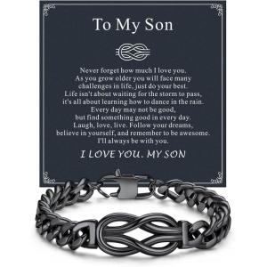 ChainsHouse Square Love Knot Bracelets for Men Braided Leather Stainless Steel Infinity Bracelets with Love Message Card Aniversary Birthday Gift for Men/Love/Husband/Dad(18-To My Son-Black)