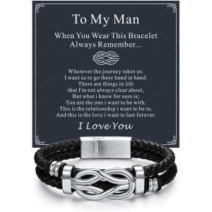ChainsHouse Square Love Knot Bracelets for Men Braided Leather Stainless Steel Infinity Bracelets with Love Message Card Aniversary Birthday Gift for Men/Love/Husband/Dad(02-To My Man-Braided)
