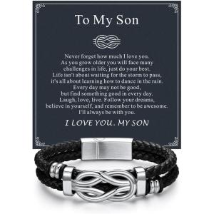 ChainsHouse Square Love Knot Bracelets for Men Braided Leather Stainless Steel Infinity Bracelets with Love Message Card Aniversary Birthday Gift for Men/Love/Husband/Dad(04-To My Son-Braided)