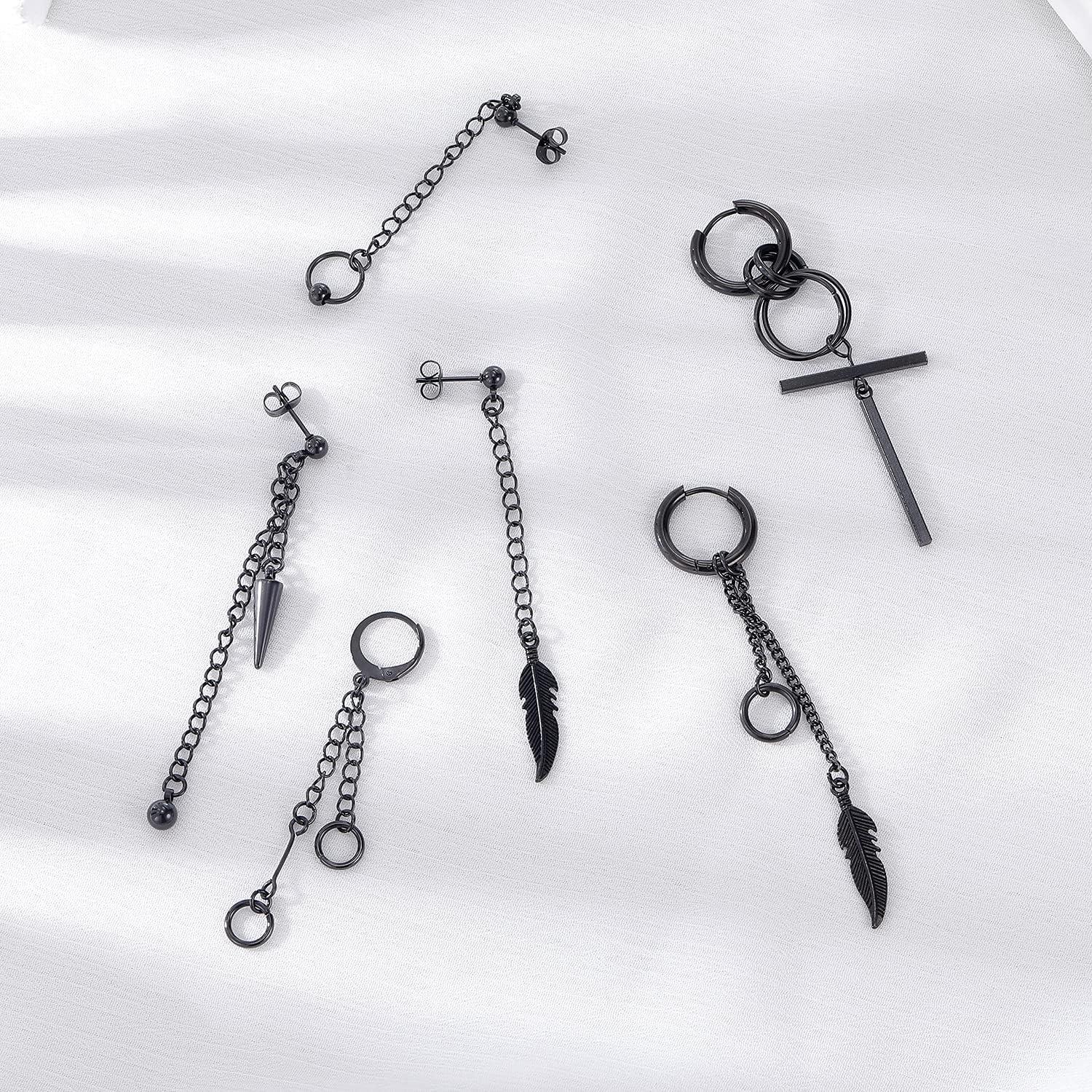 12 Pcs Dangle Cross Earrings for Men Surgical Steel Earrings Sets Dangling Chain Hypoallergenic Earrings Hoops(Black Earrings B)