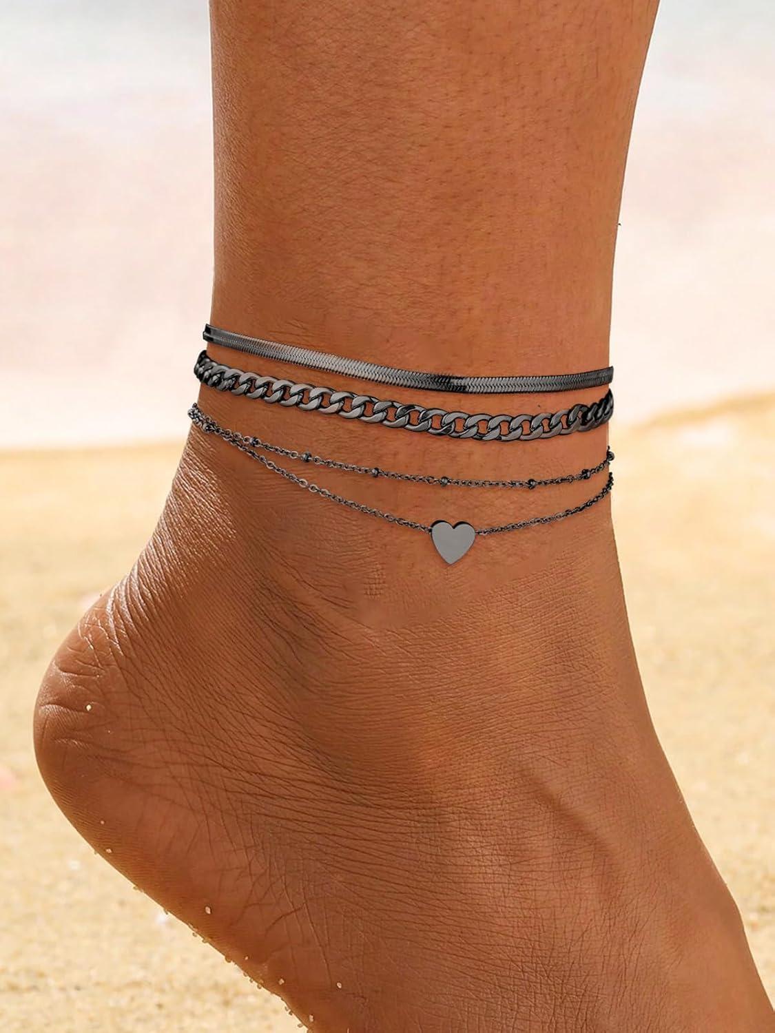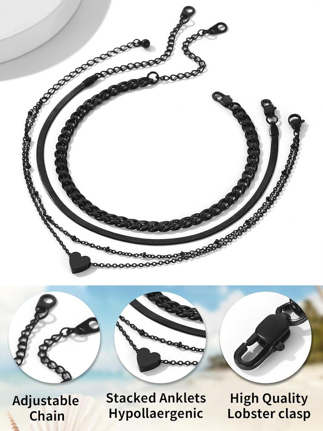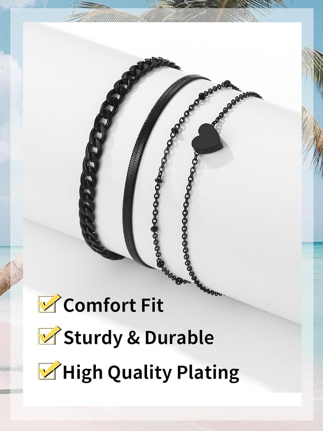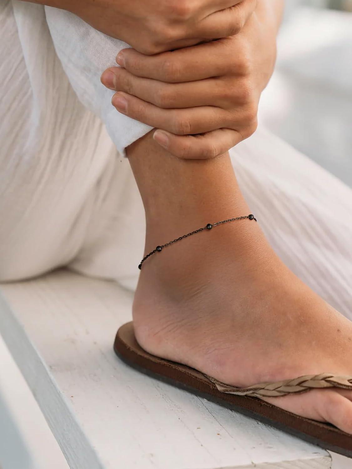 ChainsHouse Ankle Bracelets for Women, Stainless Steel Beaded Chain Ankle Bracelet, Womens Heart Anklets for Summer Beach Jewelry Gifts(K: bead-3.5mm-black)