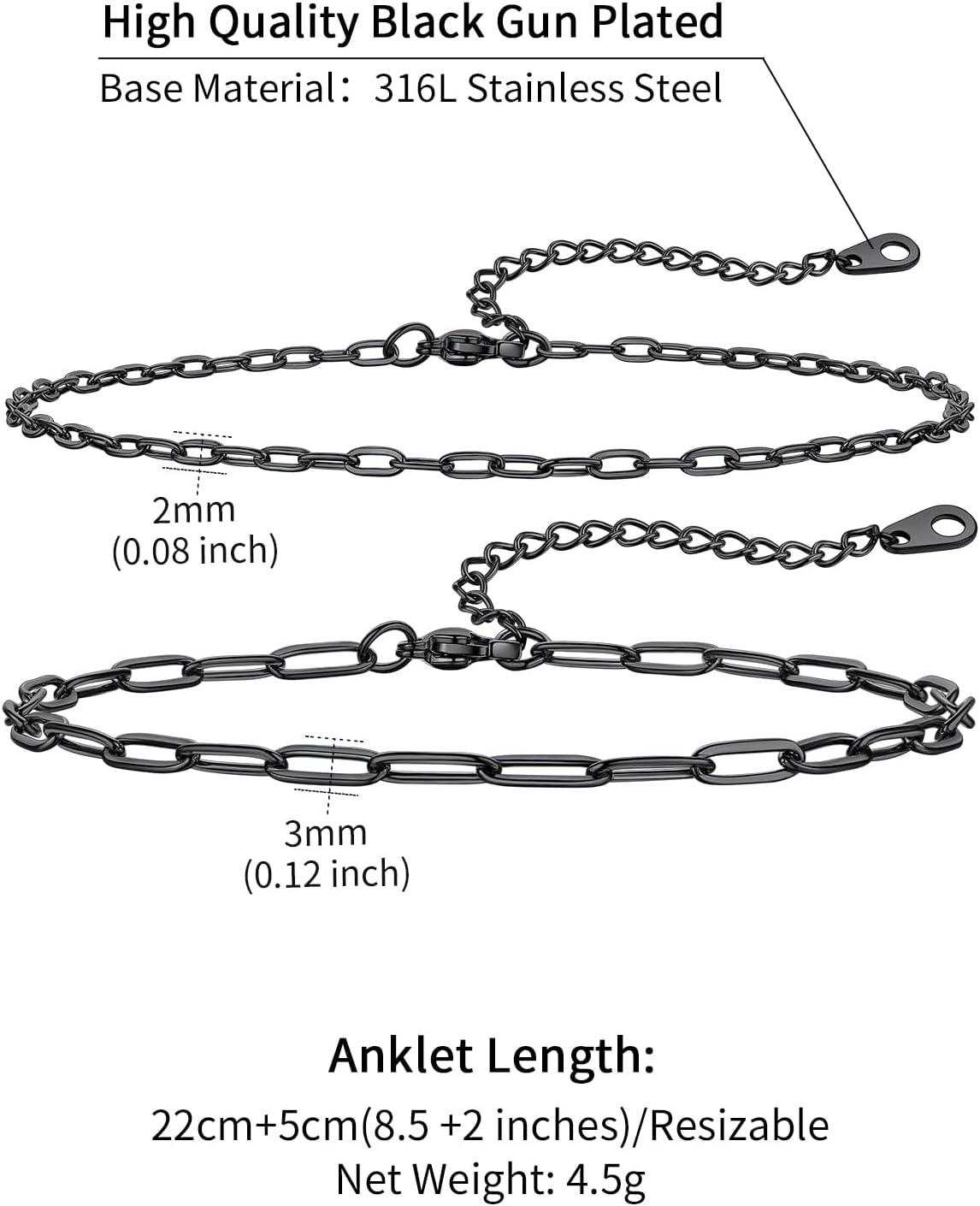 ChainsHouse Ankle Bracelets for Women, Stainless Steel Chain Anklets Waterproof, Women Summer Beach Jewelry Gift, Come with Box(02. 2Pcs-(2+3mm)-Paperclip-Black)