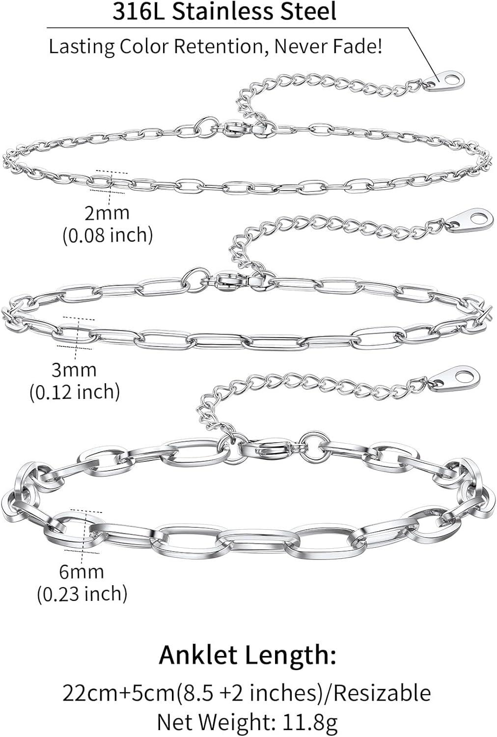ChainsHouse Ankle Bracelets for Women, Stainless Steel Chain Anklets Waterproof, Women Summer Beach Jewelry Gift, Come with Box(03. 3Pcs-(2+3+6mm)-Paperclip-Steel)