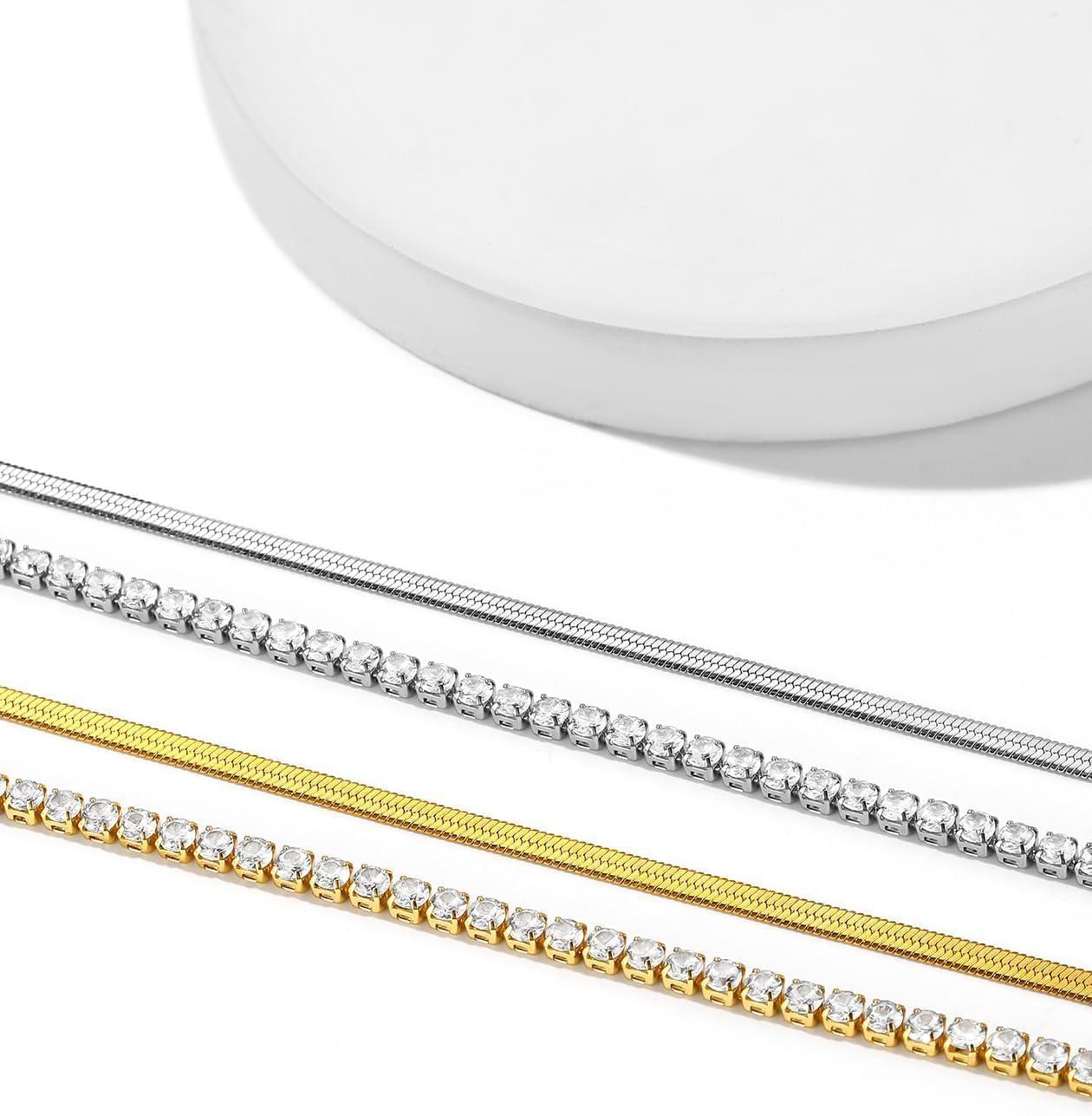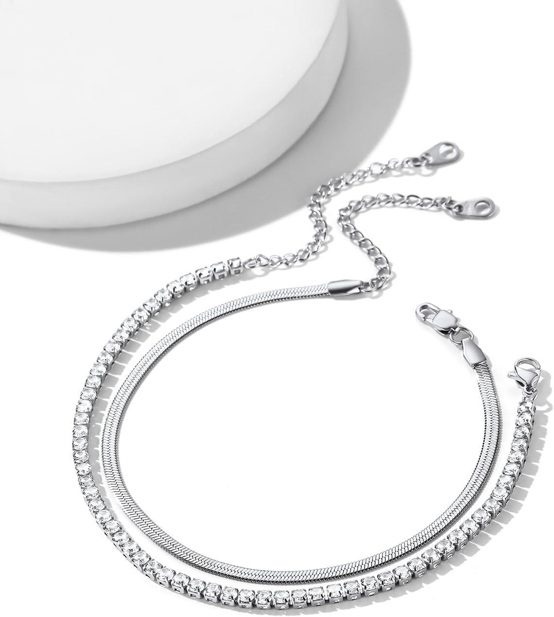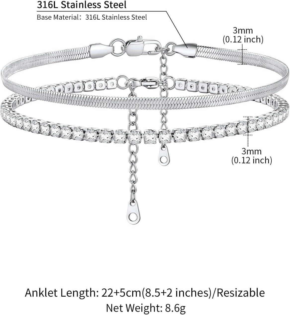 ChainsHouse Ankle Bracelets for Women, Stainless Steel Chain Anklets Waterproof, Women Summer Beach Jewelry Gift, Come with Box(05. 2pcs-(3mm)-CZ Snake-Steel)