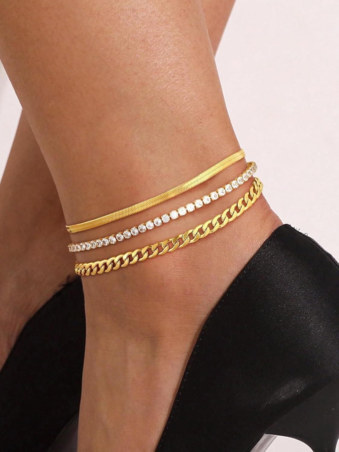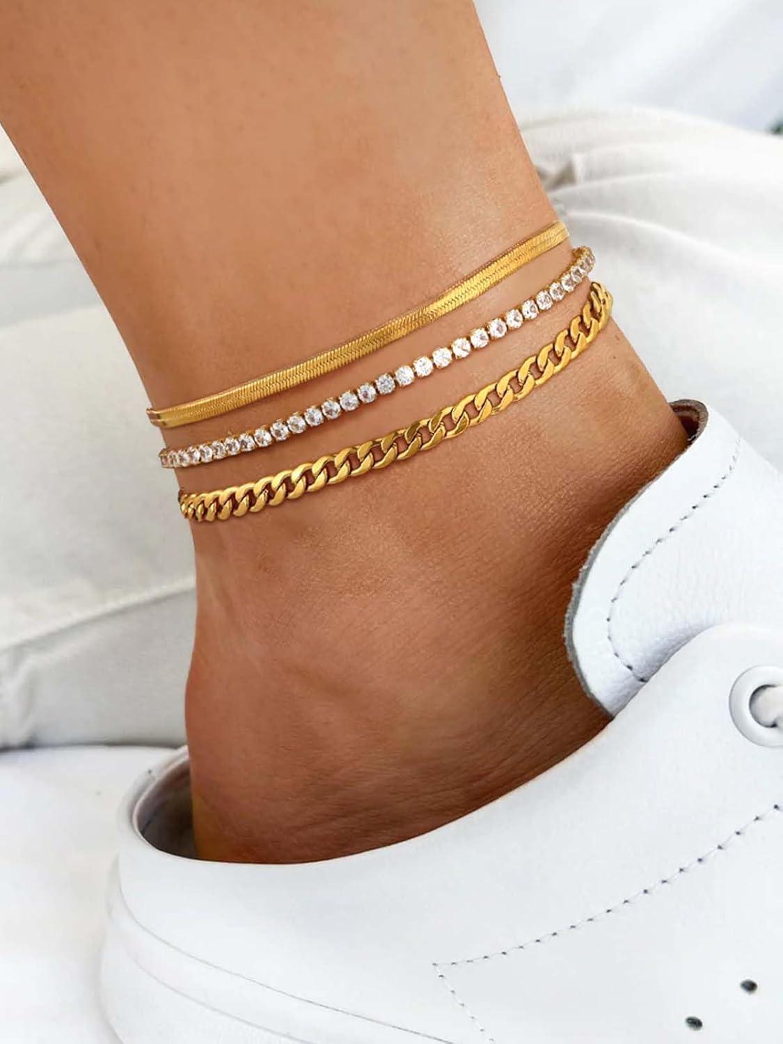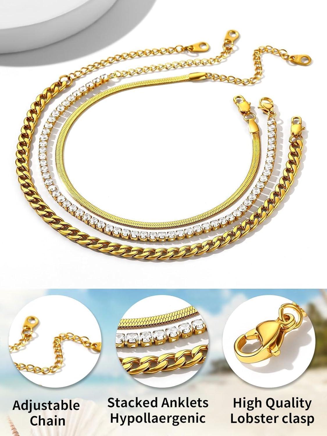 ChainsHouse Ankle Bracelets for Women, Stainless Steel Chain Anklets Waterproof, Women Summer Beach Jewelry Gift, Come with Box(08. 3pcs CZ Cuban-Gold)