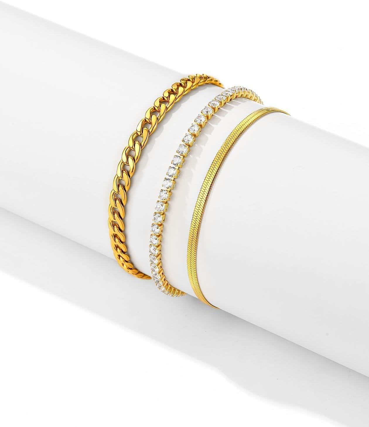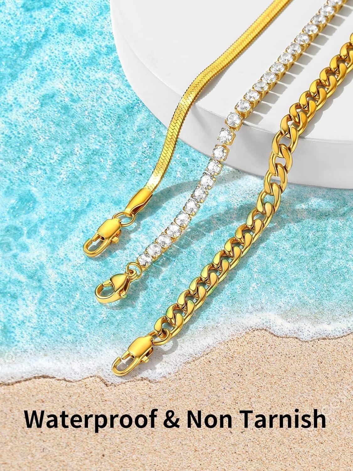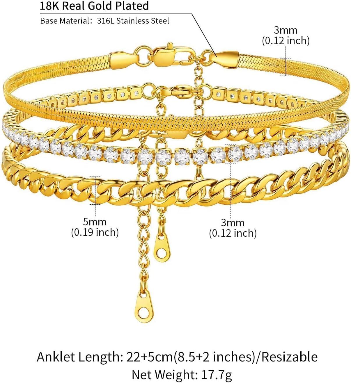 ChainsHouse Ankle Bracelets for Women, Stainless Steel Chain Anklets Waterproof, Women Summer Beach Jewelry Gift, Come with Box(08. 3pcs CZ Cuban-Gold)