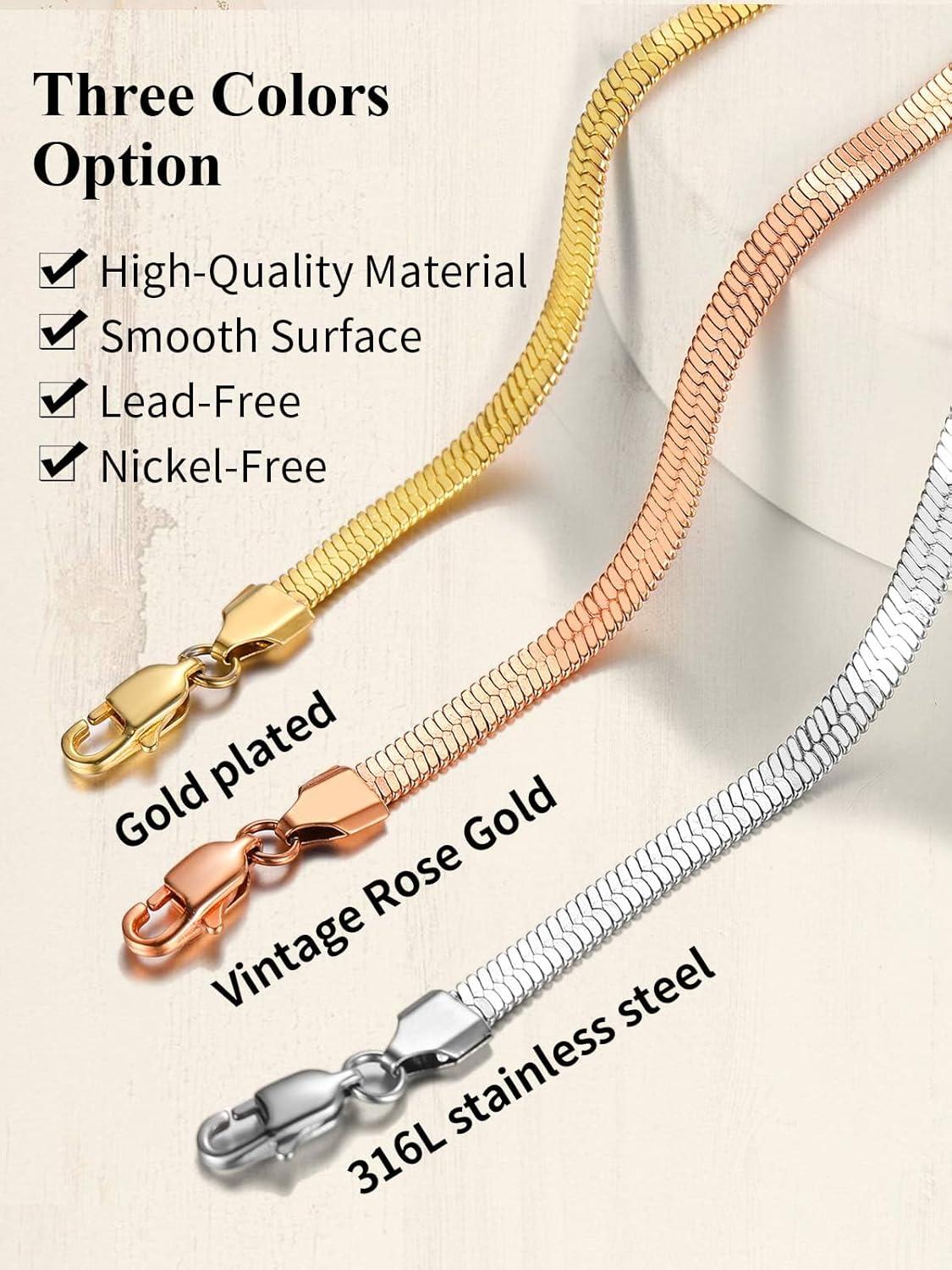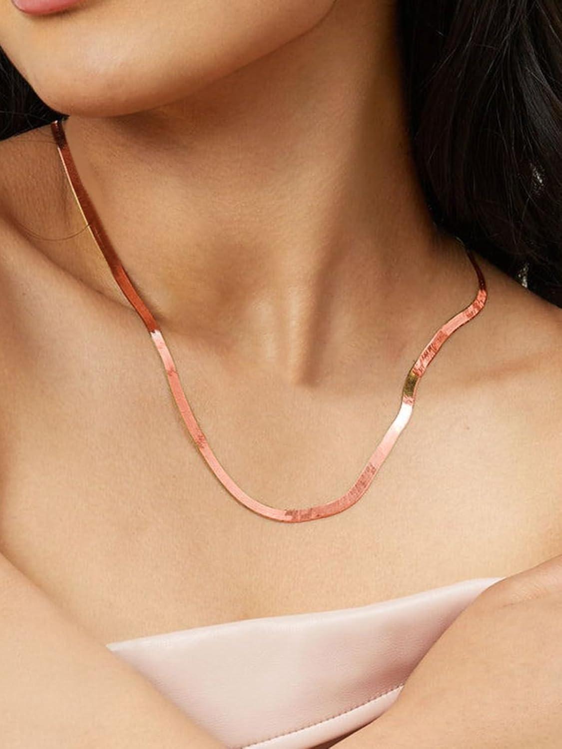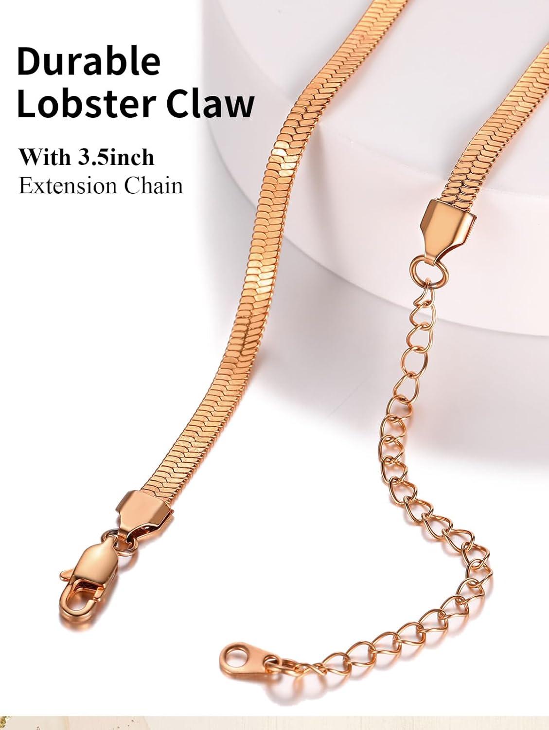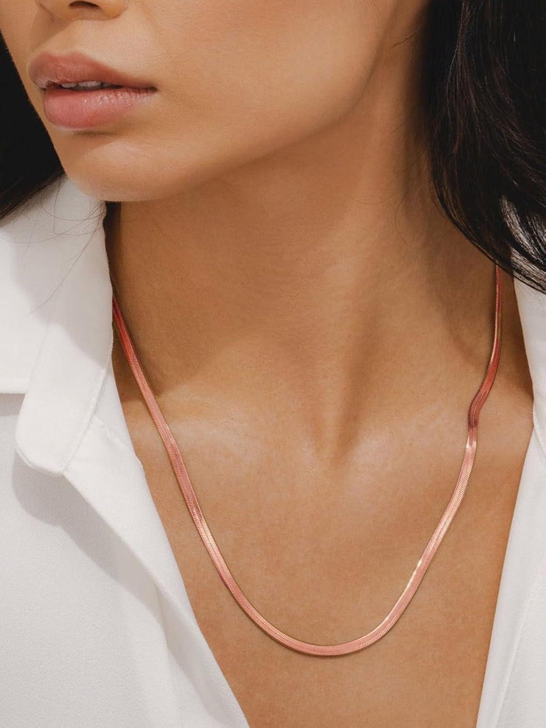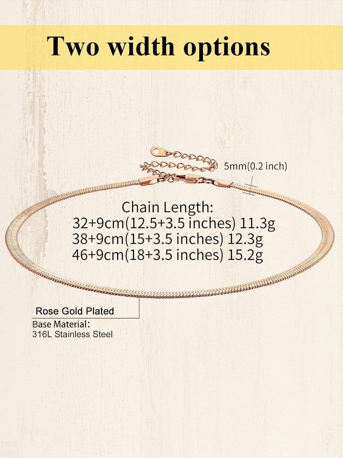 ChainsHouse Flat Snake Chain Herringbone Choker Necklace for Women, Stainless Steel/Rose Gold/18K Gold Plated Dainty Adjustable Simple Short Layered Necklaces, 12″/15″/18″ with 3.5″ Extender(a. rose gold-5mm)