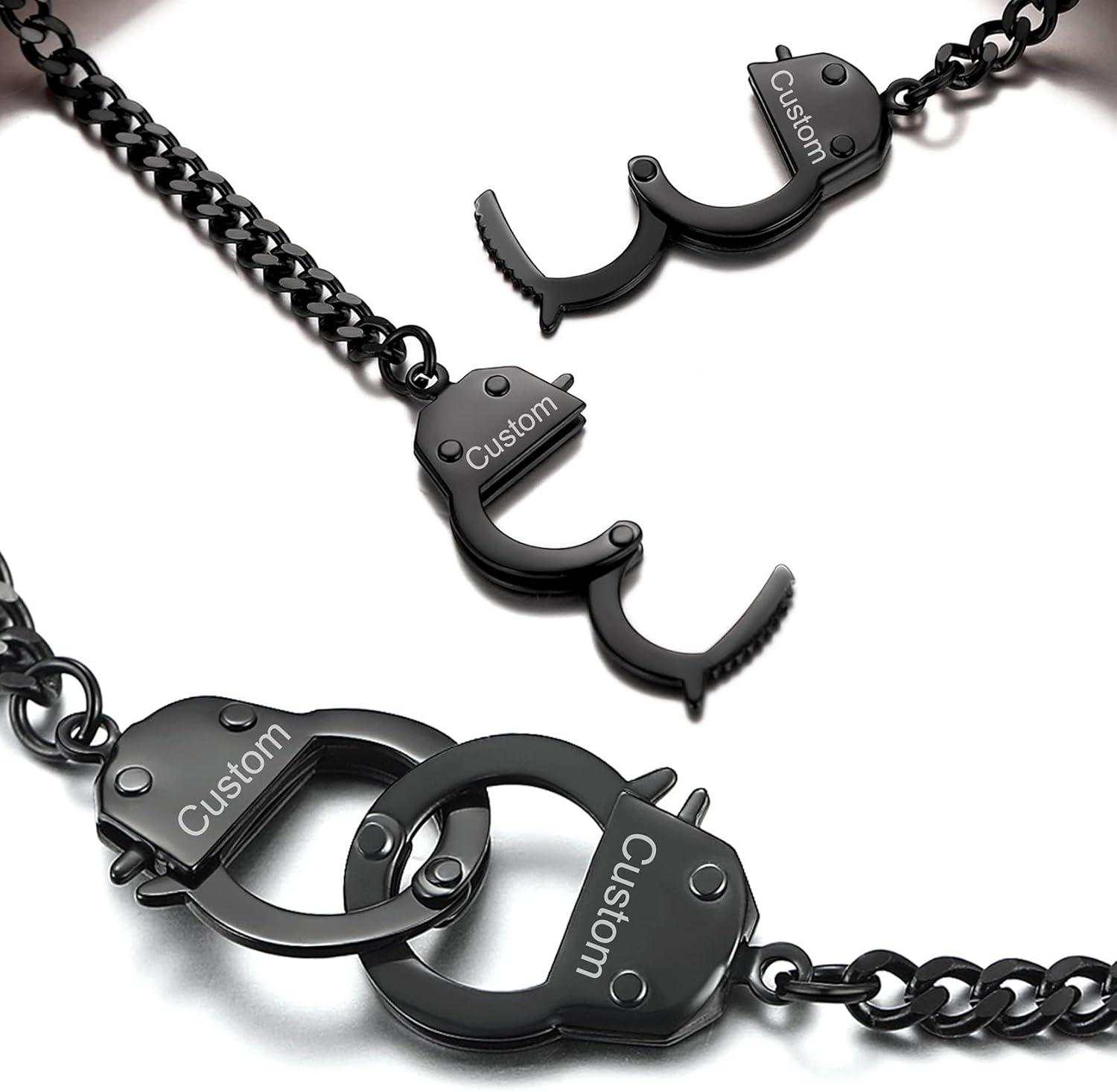 ChainsHouse Handcuff Link Bracelet for Men Women, 18K Gold/Black Metal/Stainless Steel Biker Curb Chain Friendship Best Friends Statement Bangles Bracelets, Send Gift Box(E: Black-Custom)