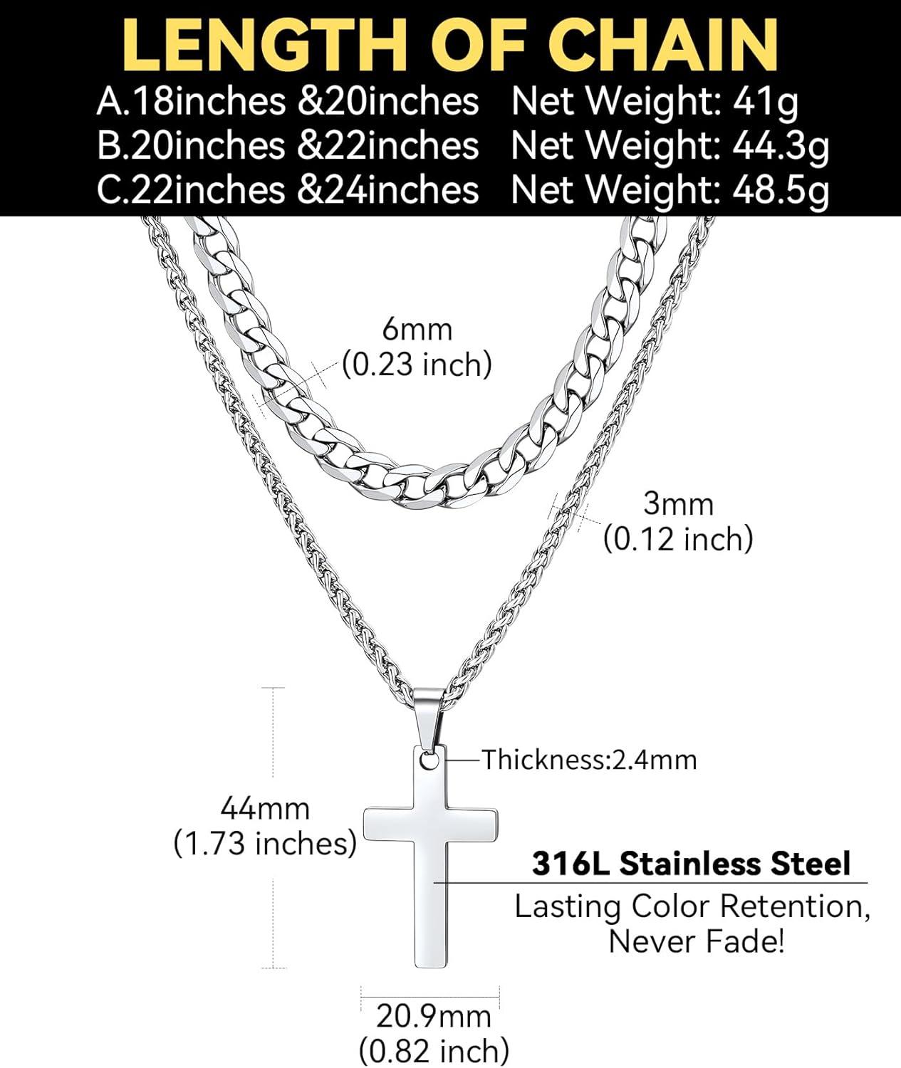 ChainsHouse Layered Cross Necklace for Men, Stainless Steel/Black/Gold Plated Cuban/Barbed Wire Necklace with Cross/Crucifix Pendant Religious Jewelry Gift Set for Dad, Husband(01. Steel-Layered Cuban+Cross Pendant)