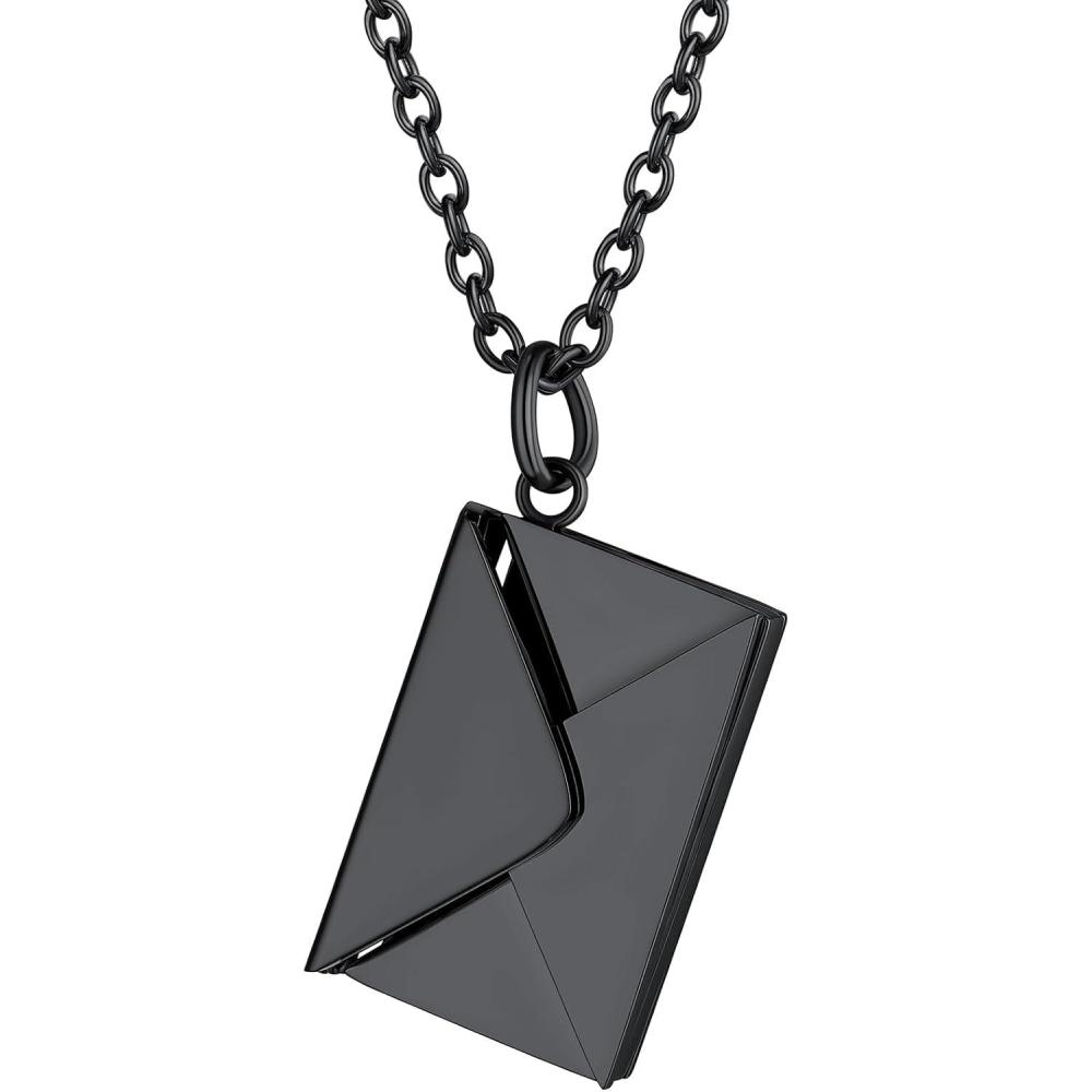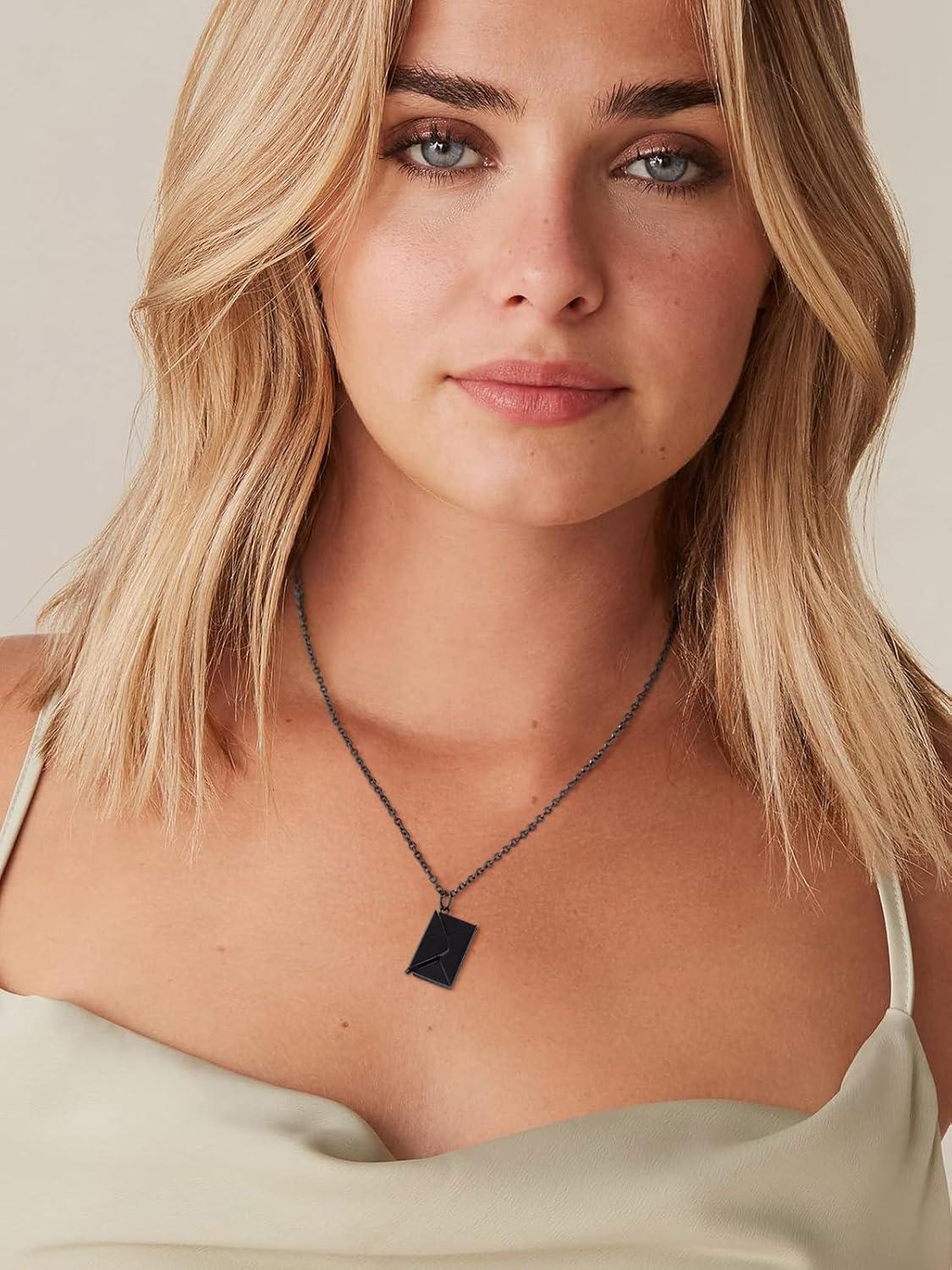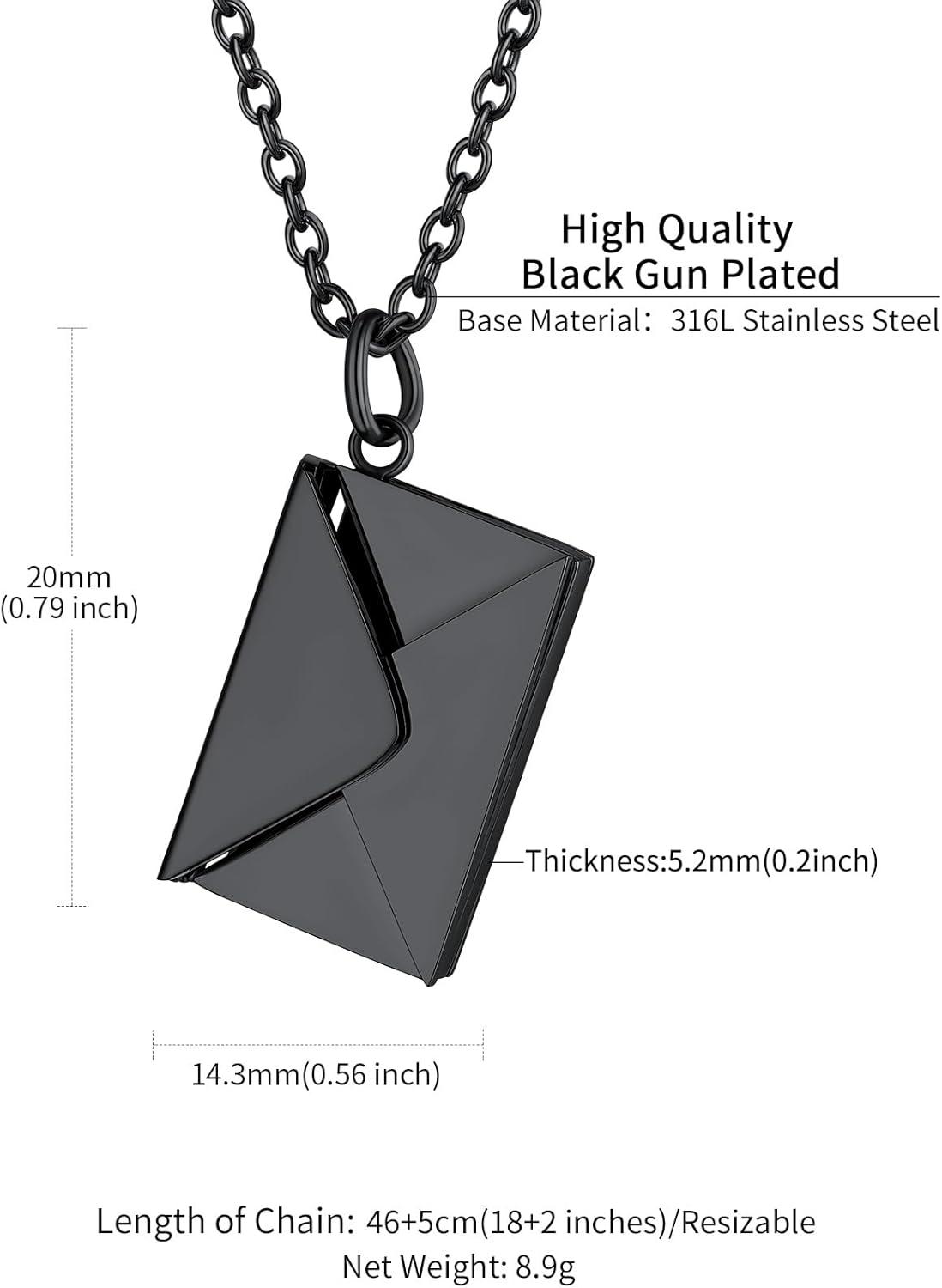 ChainsHouse Personalized Locket Necklace, Custom Envelope Necklaces with Photo Message Engraved for Women, Stainless Steel/Black/Gold/Rose Gold Plated Memorial Gift for Wife (with Gift Box)(B – Love You Envelope-Black)