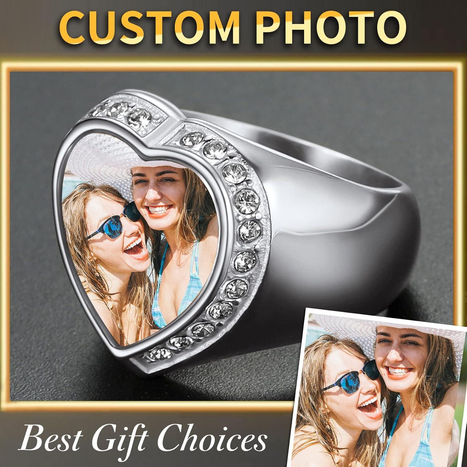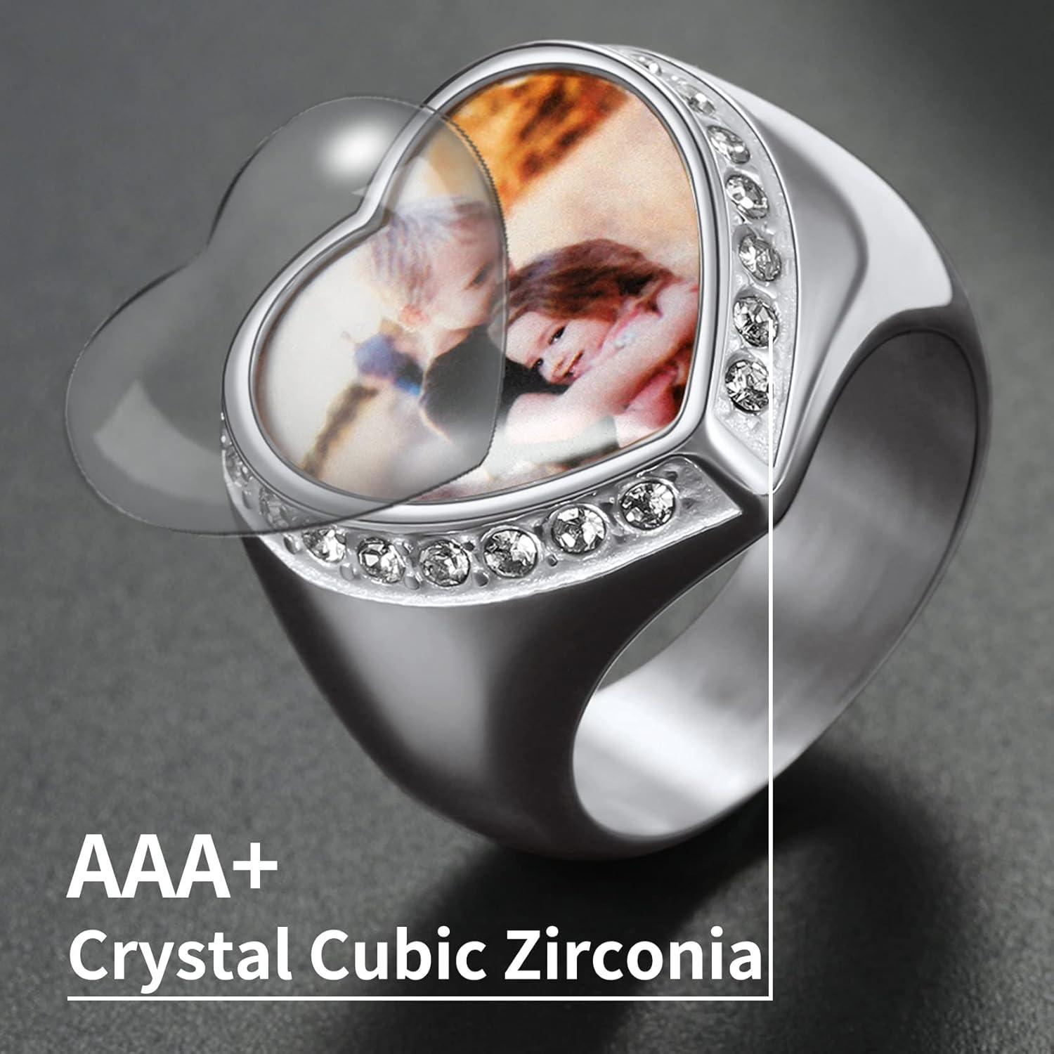 ChainsHouse Signet Rings Solid Polished Stainless Steel Biker Ring for Men Women, 316L Stainless Steel/18K Gold/Black Metal Plated, Text Engraving/Photo Custom, Size 7 to 14, Send Gift Box(b. CZ Heart Photo – Steel)