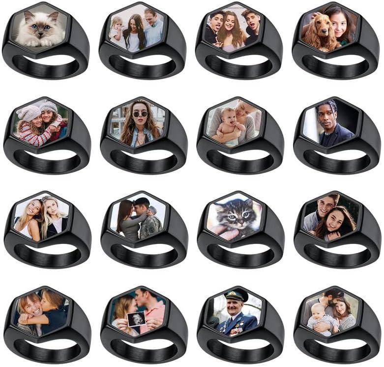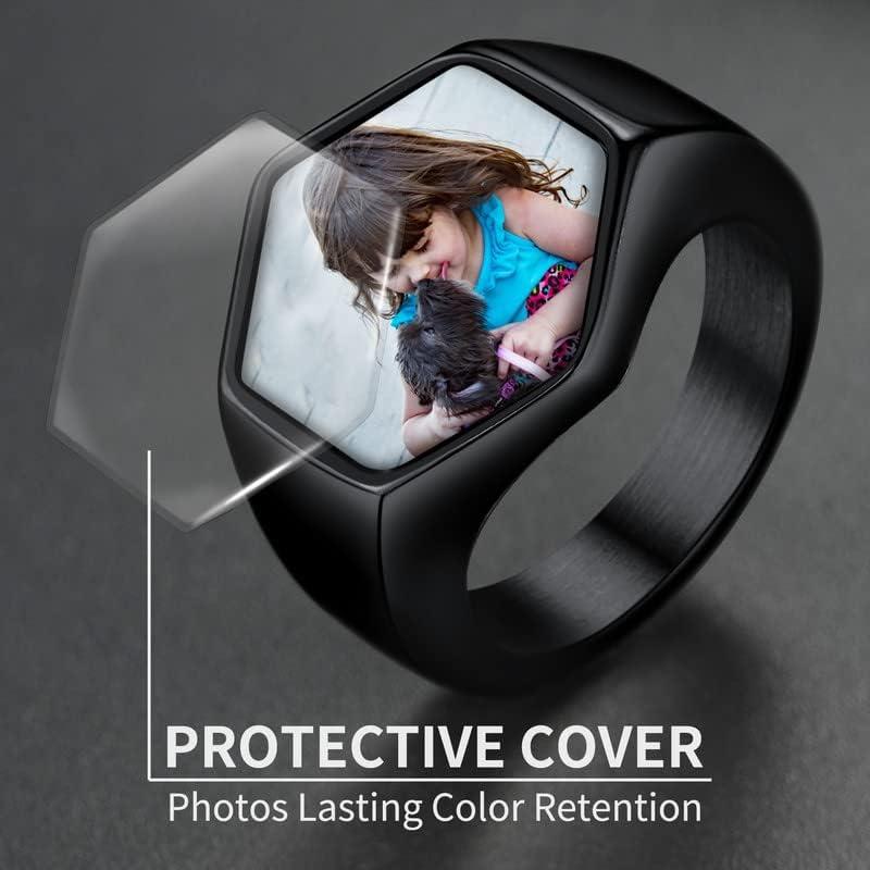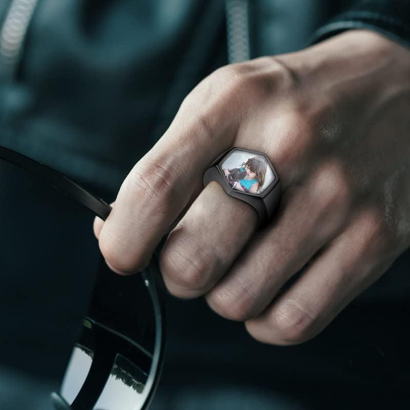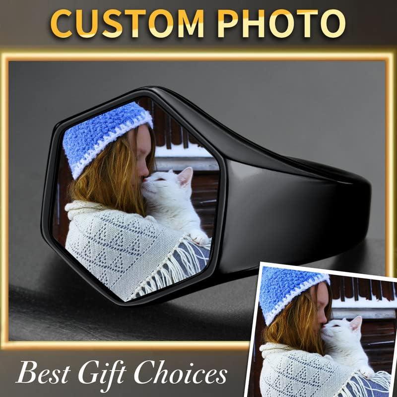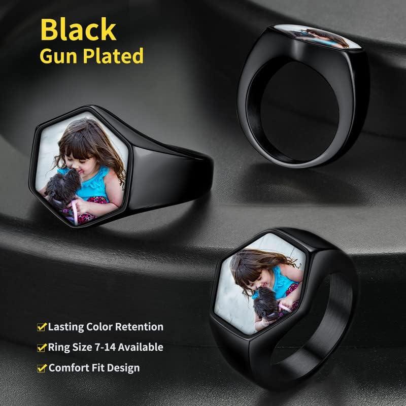 ChainsHouse Signet Rings Solid Polished Stainless Steel Biker Ring for Men Women, 316L Stainless Steel/18K Gold/Black Metal Plated, Text Engraving/Photo Custom, Size 7 to 14, Send Gift Box(e. Hexagonal Photo – Black)