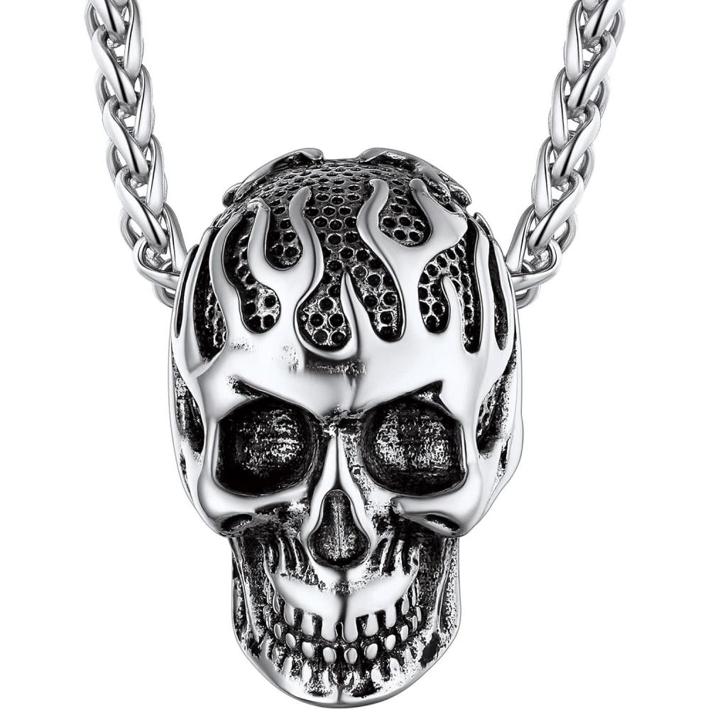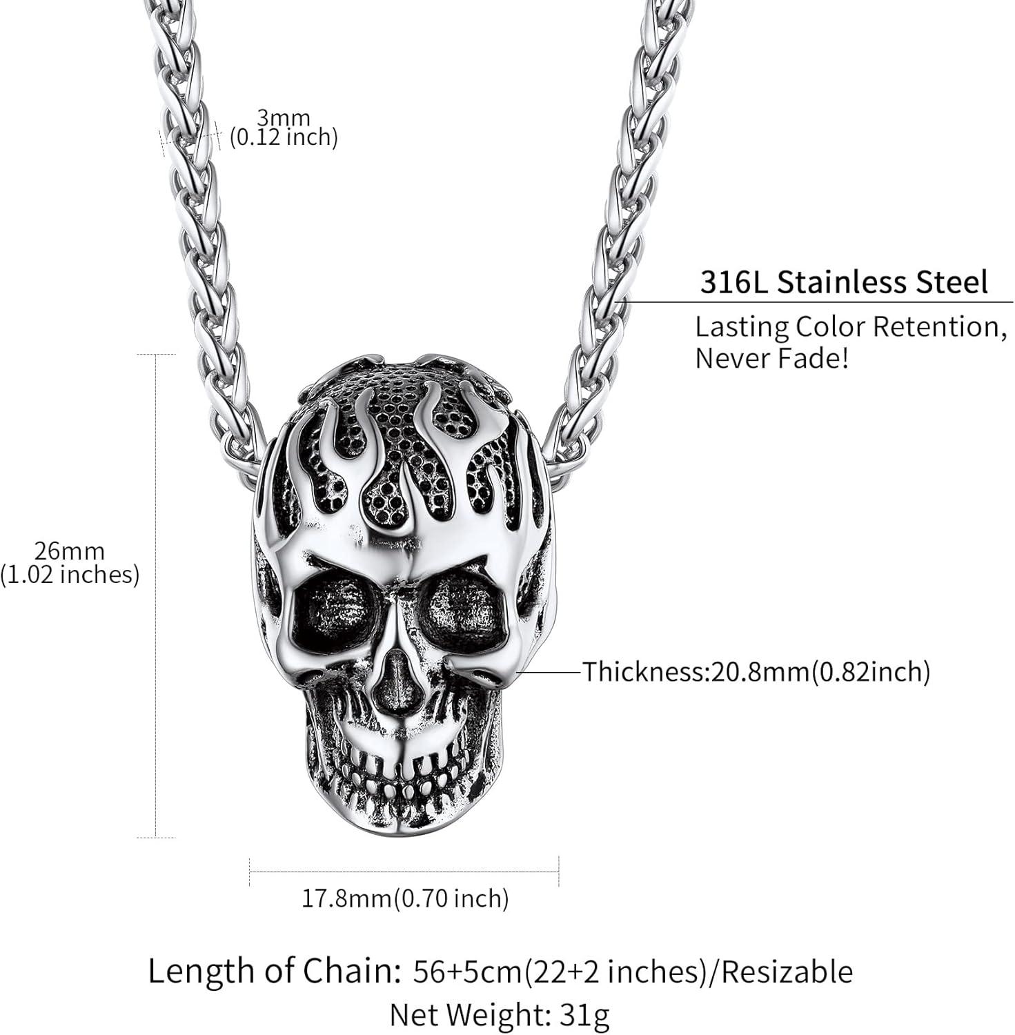 ChainsHouse Skull Necklace for Men, Retro Gothic Punk Jewelry Biker Necklace for Men Women Free Engraving Stainless Steel Dog Tag Pendant Necklace,with Gift Box(01. Flame -Steel)
