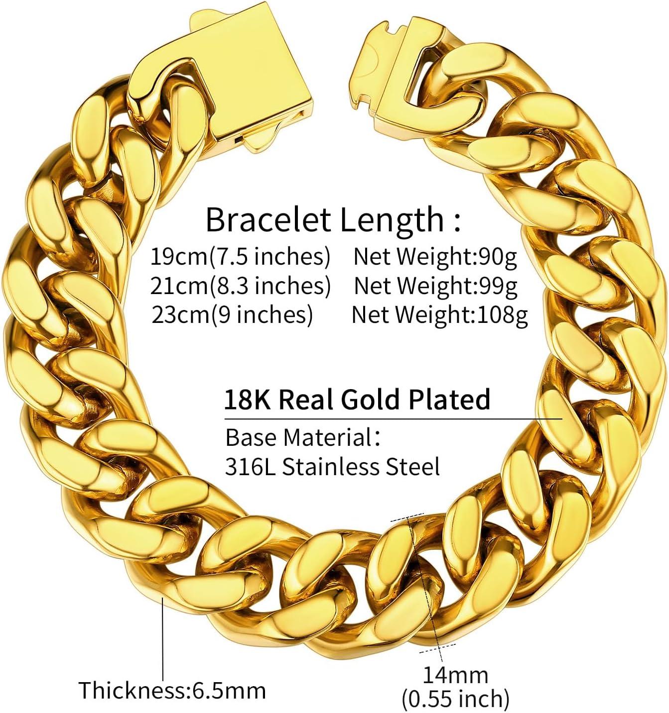 ChainsHouse Stainless Steel Cuban Link Bracelet for Men, 5mm/7mm/9mm/12mm Width, 7.5″/8.3″/9″ Length, Black/18K Gold Plated Chain Wrist Bracelets for Men, with Gift Box(d. 14mm width-gold)