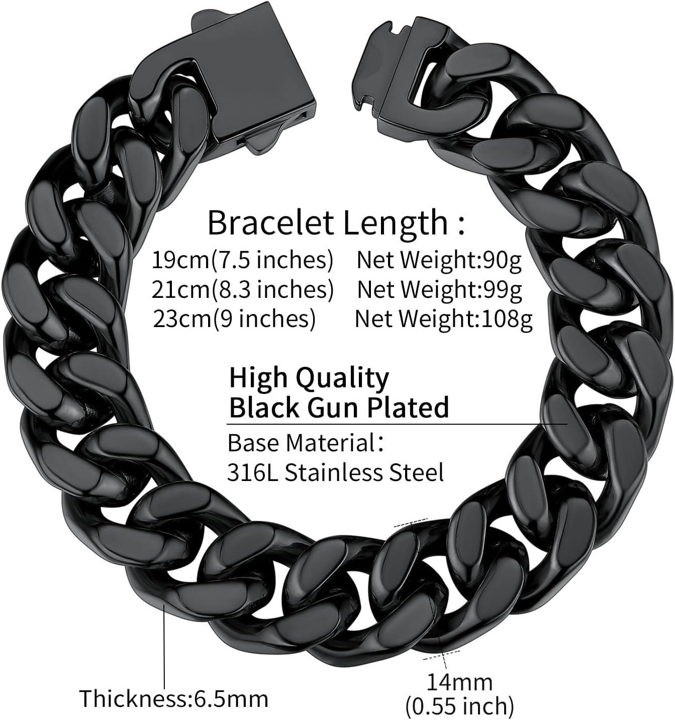 ChainsHouse Stainless Steel Cuban Link Bracelet for Men, 5mm/7mm/9mm/12mm Width, 7.5″/8.3″/9″ Length, Black/18K Gold Plated Chain Wrist Bracelets for Men, with Gift Box(f. 14mm width-black)