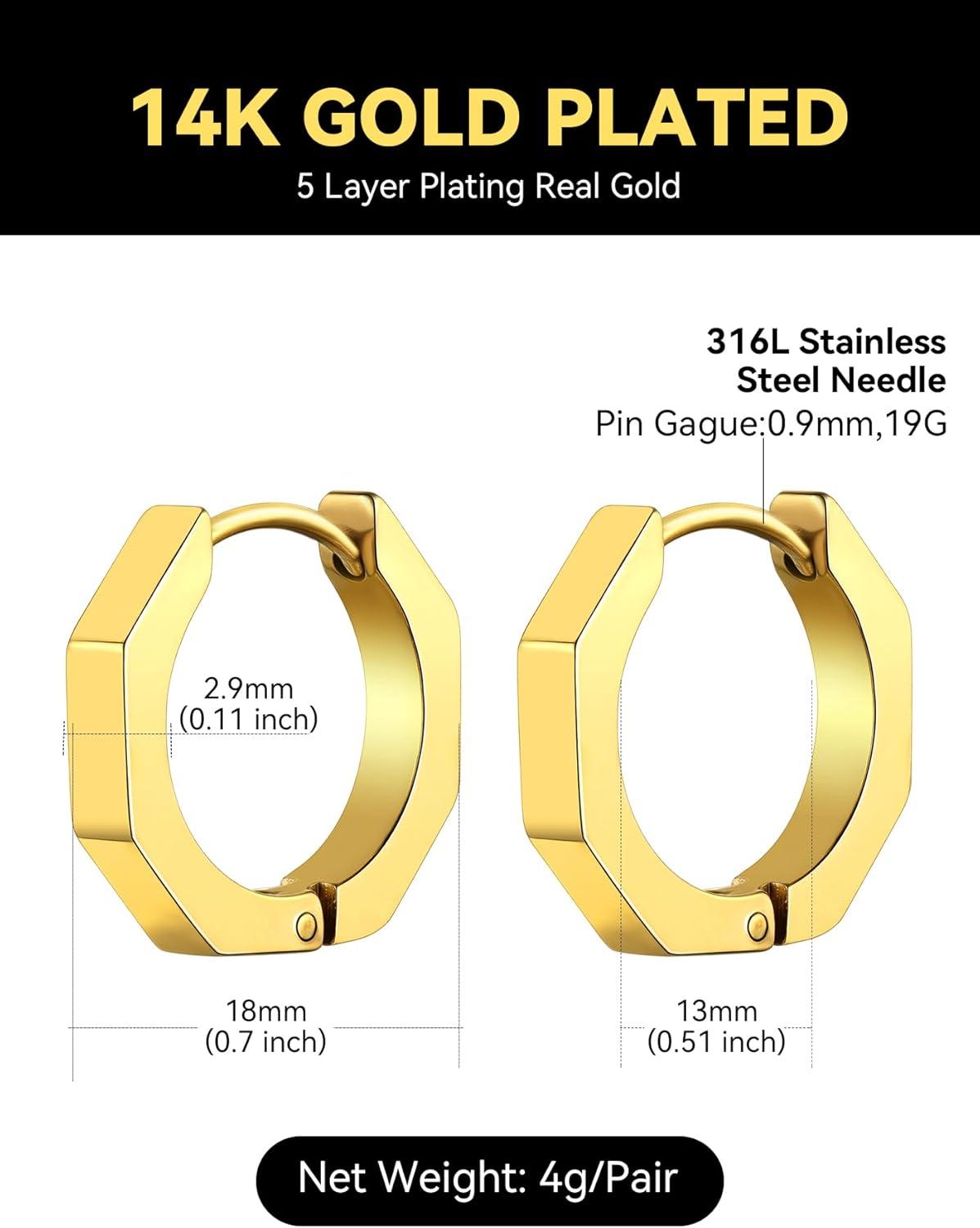 ChainsHouse Stud Earrings for Men Women,316L Stainless Steel/14K Gold/Black Plated Metal, Punk Hypoallergenic Surgical Huggie Hoop Earrings Mens Jewelry Piercing Hoop Earrings(E: Gold-Octagon(1 Pair))