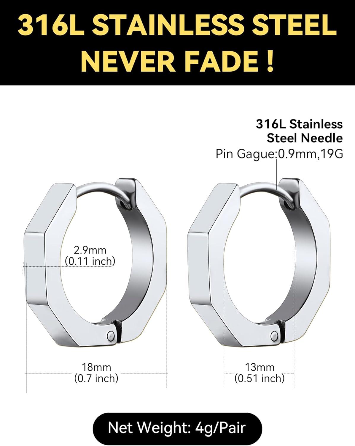 ChainsHouse Stud Earrings for Men Women,316L Stainless Steel/14K Gold/Black Plated Metal, Punk Hypoallergenic Surgical Huggie Hoop Earrings Mens Jewelry Piercing Hoop Earrings(E: Silver-Octagon(1 Pair))