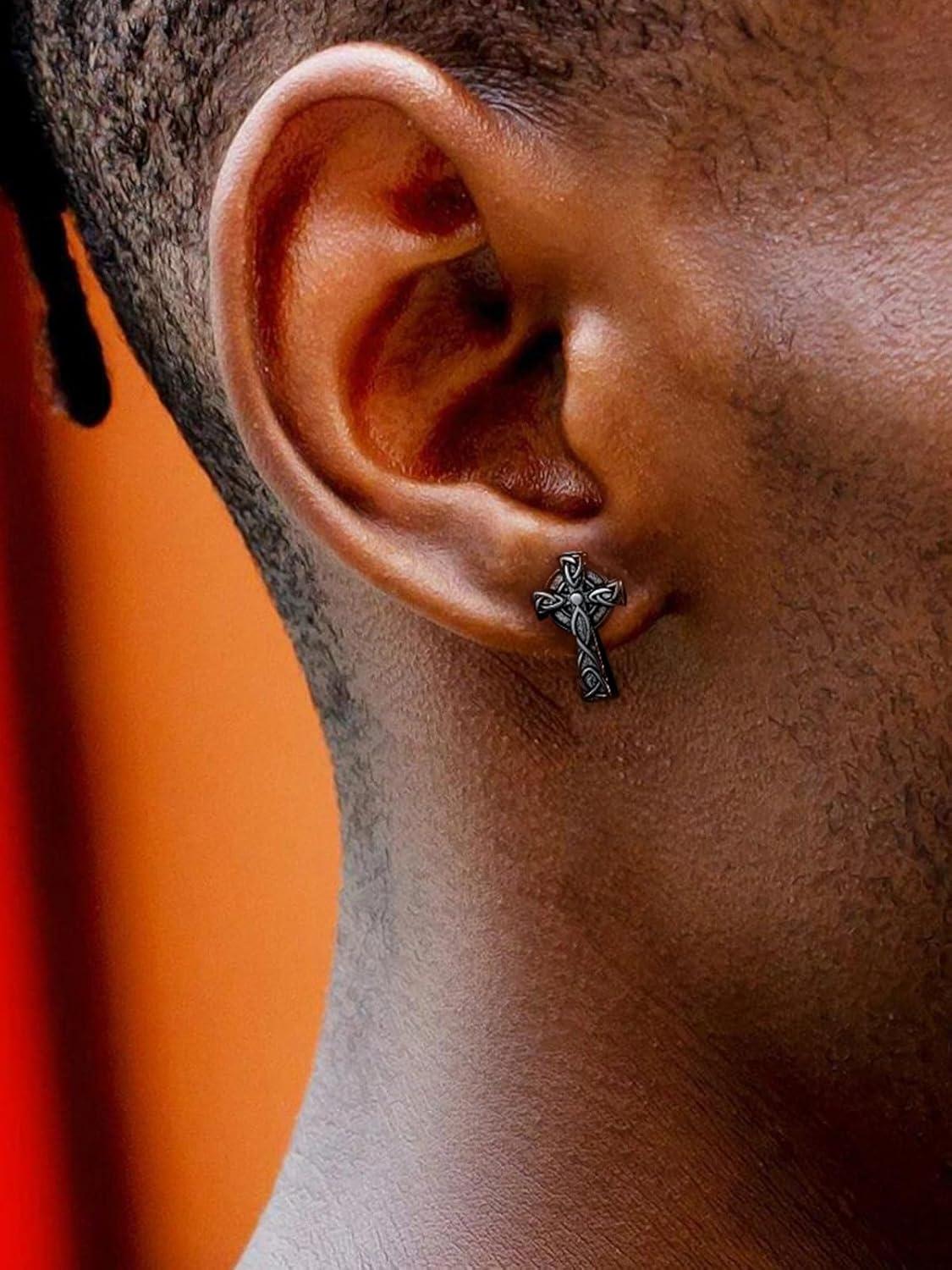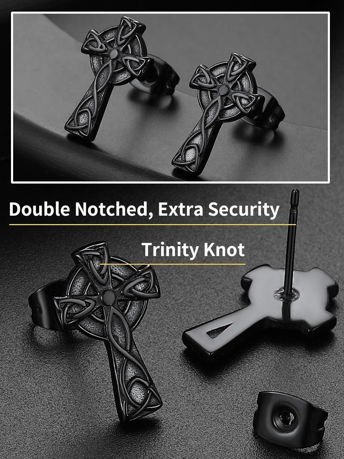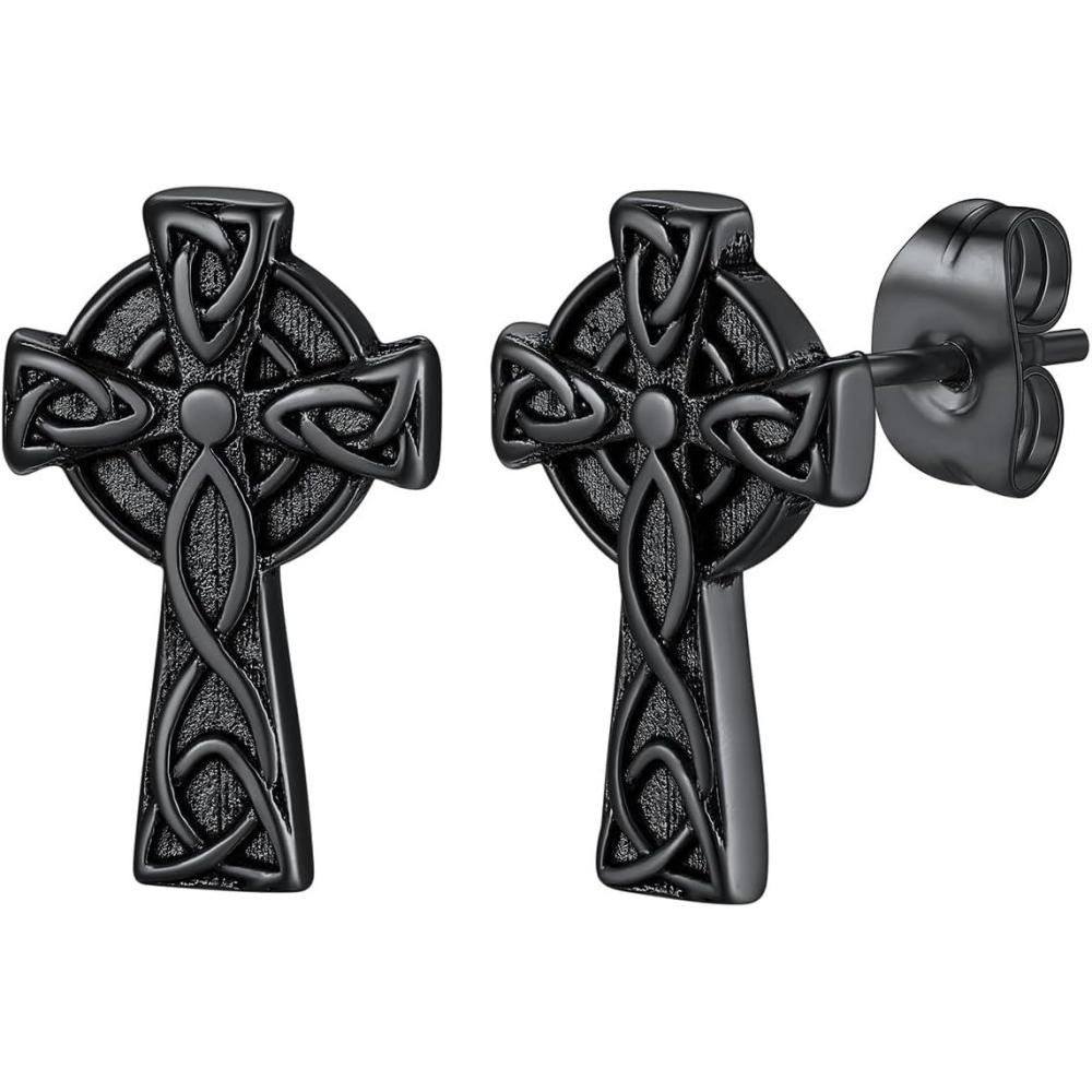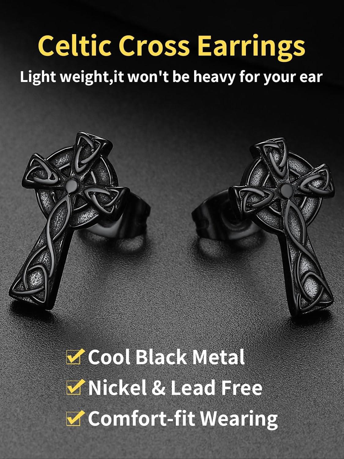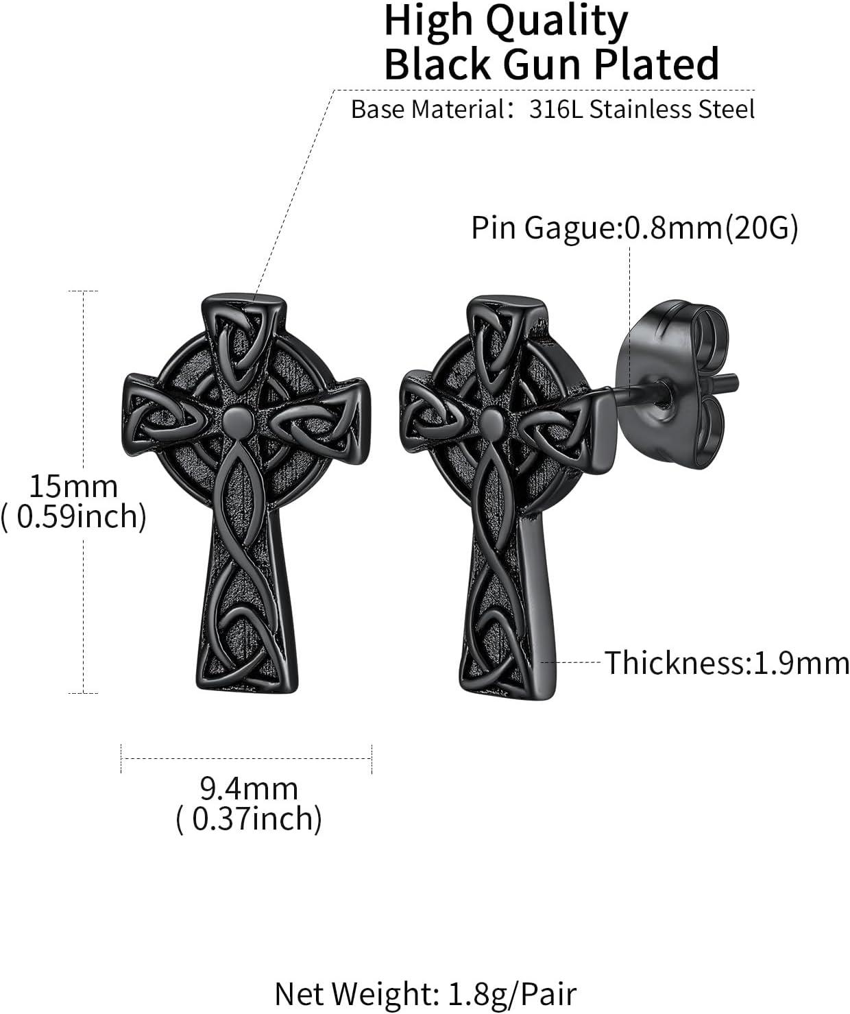 ChainsHouse Viking Earrings for Men, Raven Skull/Celtic Cross Ear Studs, Stainless Steel/Black/Gold Plated Punk Gothic Earrings, Lightweight Hypoallergenic Stud Jewelry with Gift Box(C-Celtic Cross-Black)
