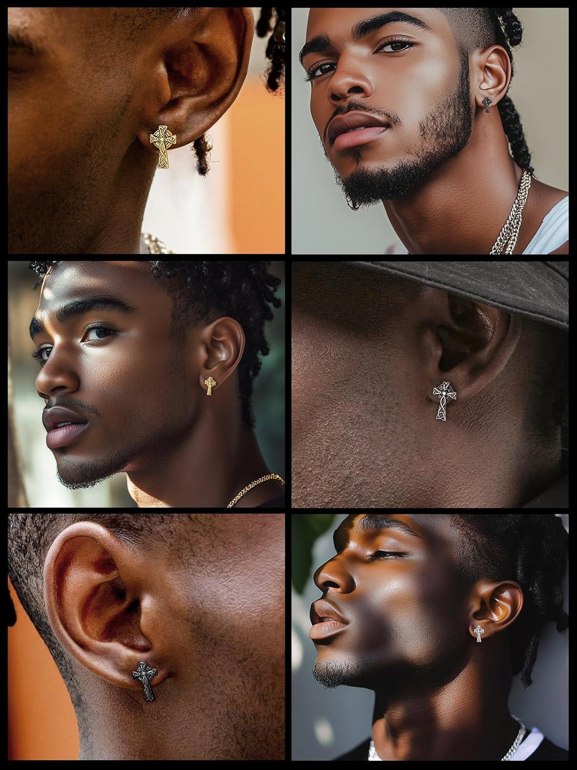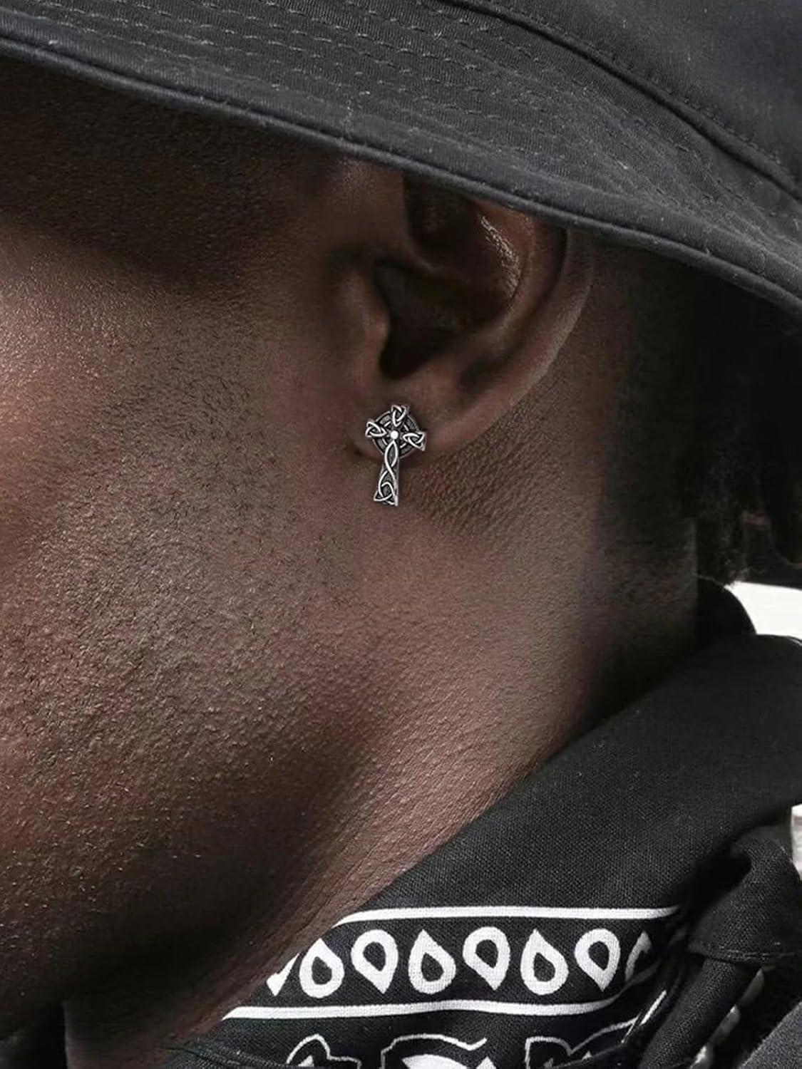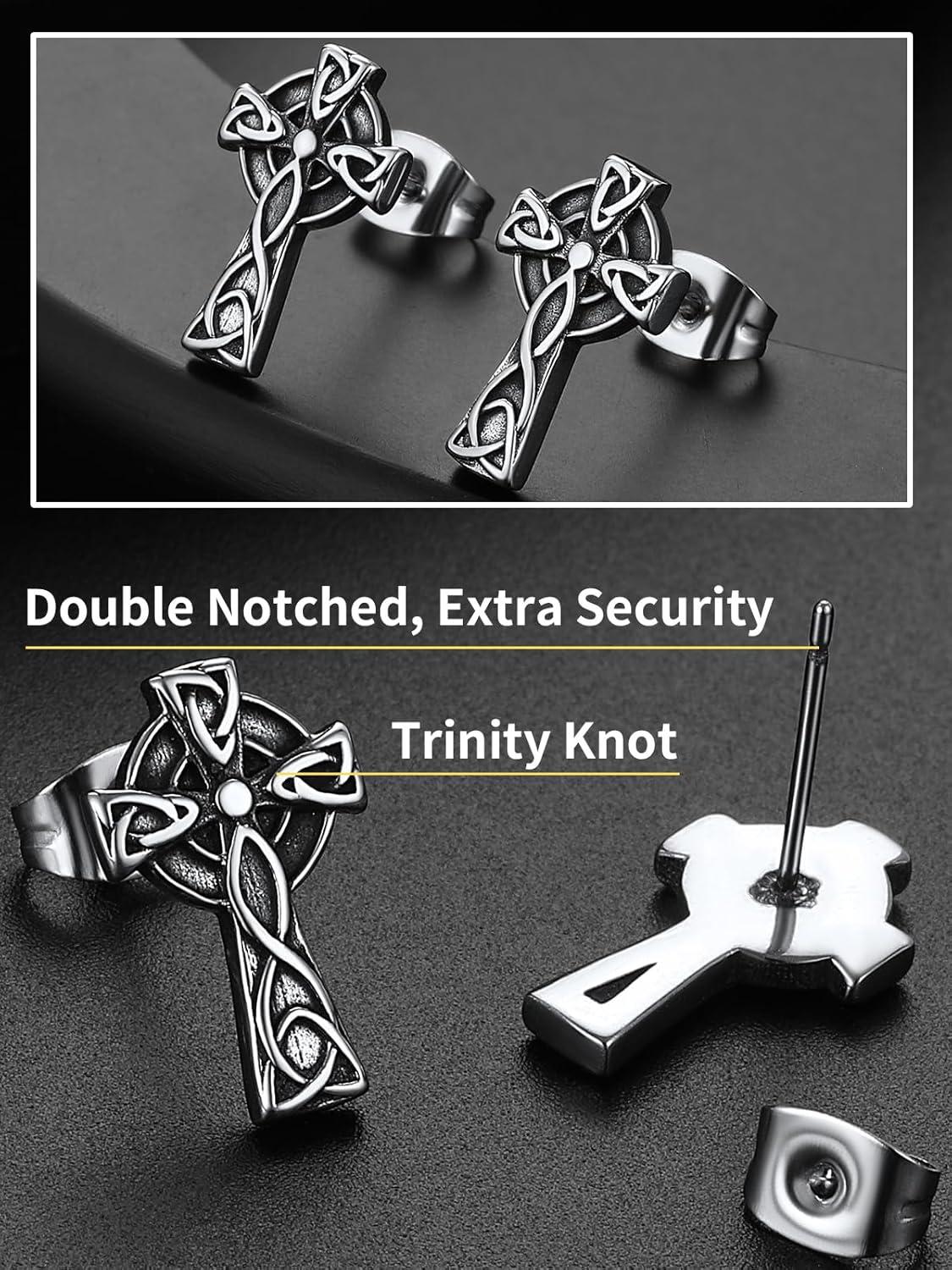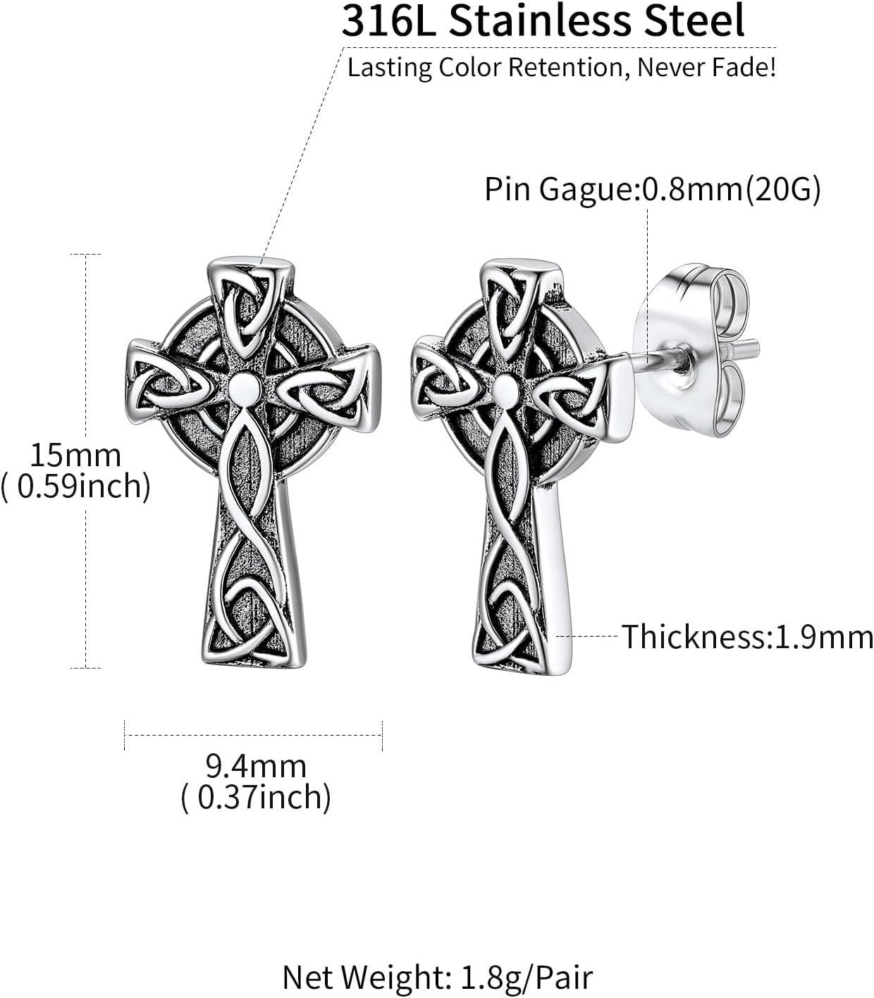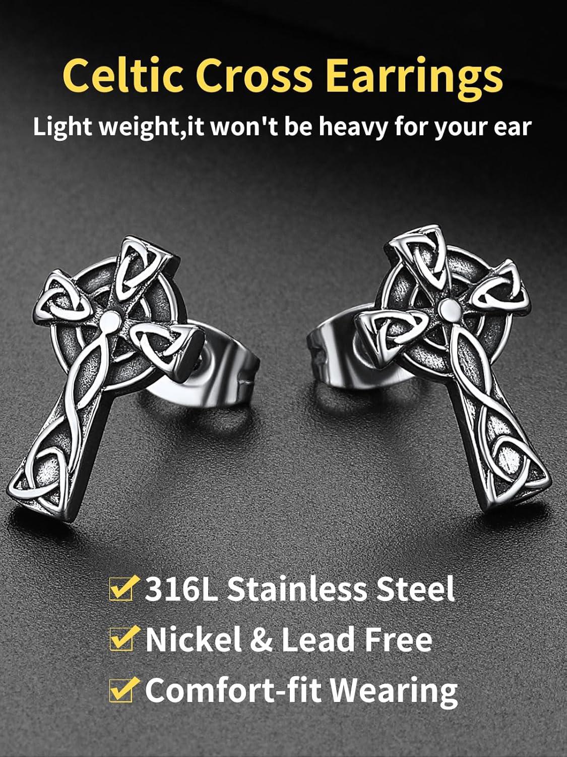 ChainsHouse Viking Earrings for Men, Raven Skull/Celtic Cross Ear Studs, Stainless Steel/Black/Gold Plated Punk Gothic Earrings, Lightweight Hypoallergenic Stud Jewelry with Gift Box(C-Celtic Cross-Steel)