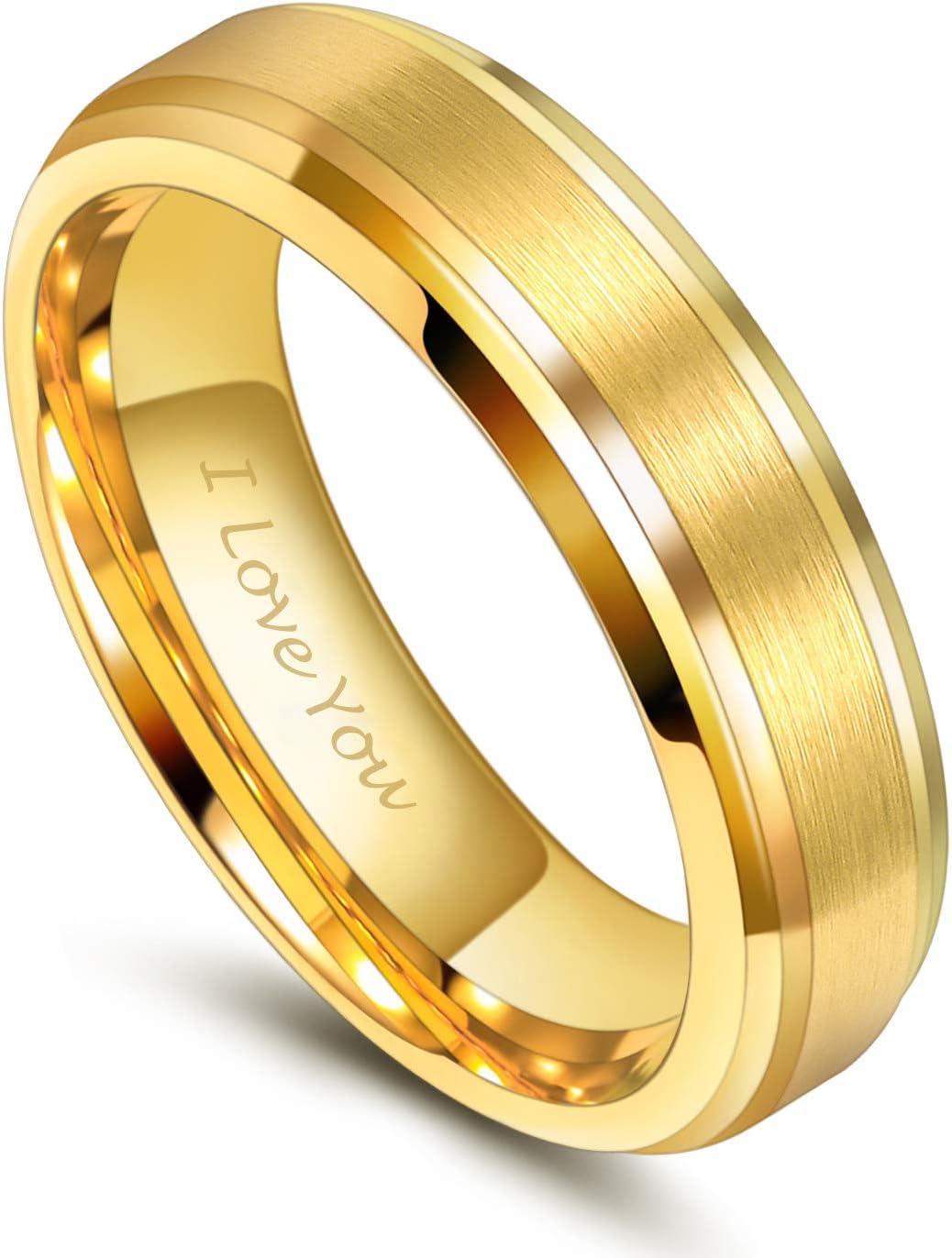 TRUMIUM 6mm 8mm Mens Womens 24K Gold Plated Tungsten Wedding Ring Band Brush Finish Scratch Resistant Size 5-14(6mm I Love You Engraved)