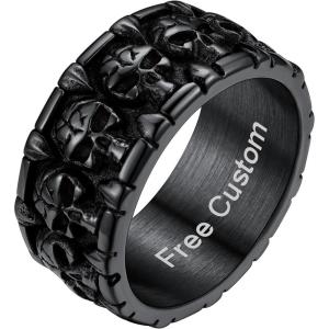 ChainsHouse Skull Rings for Men, Stainless Steel/Black Plated Gothic Rings, Skeleton Cocktail Party Biker Ring, Offer Custom Service, Size 7-14, Send Gift Box(B: Engrave-black-Custom)