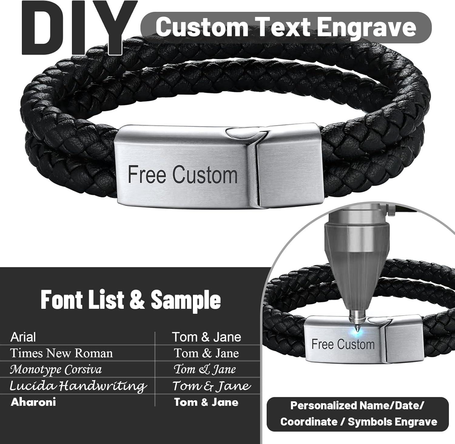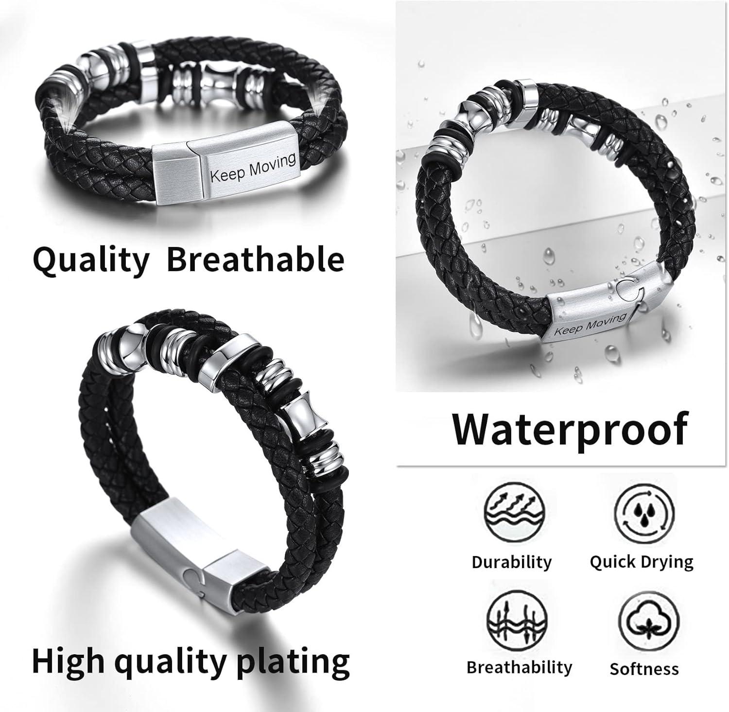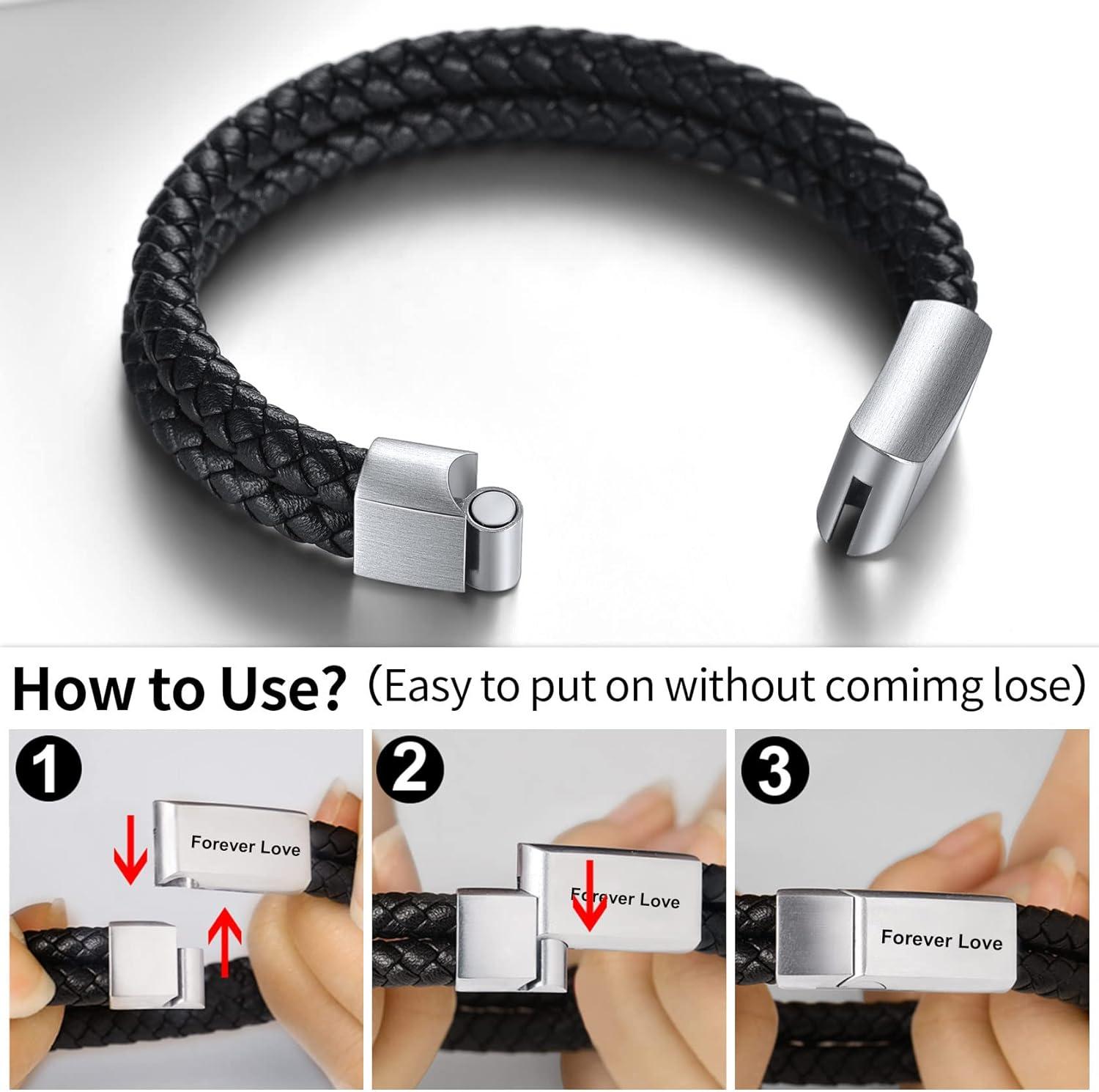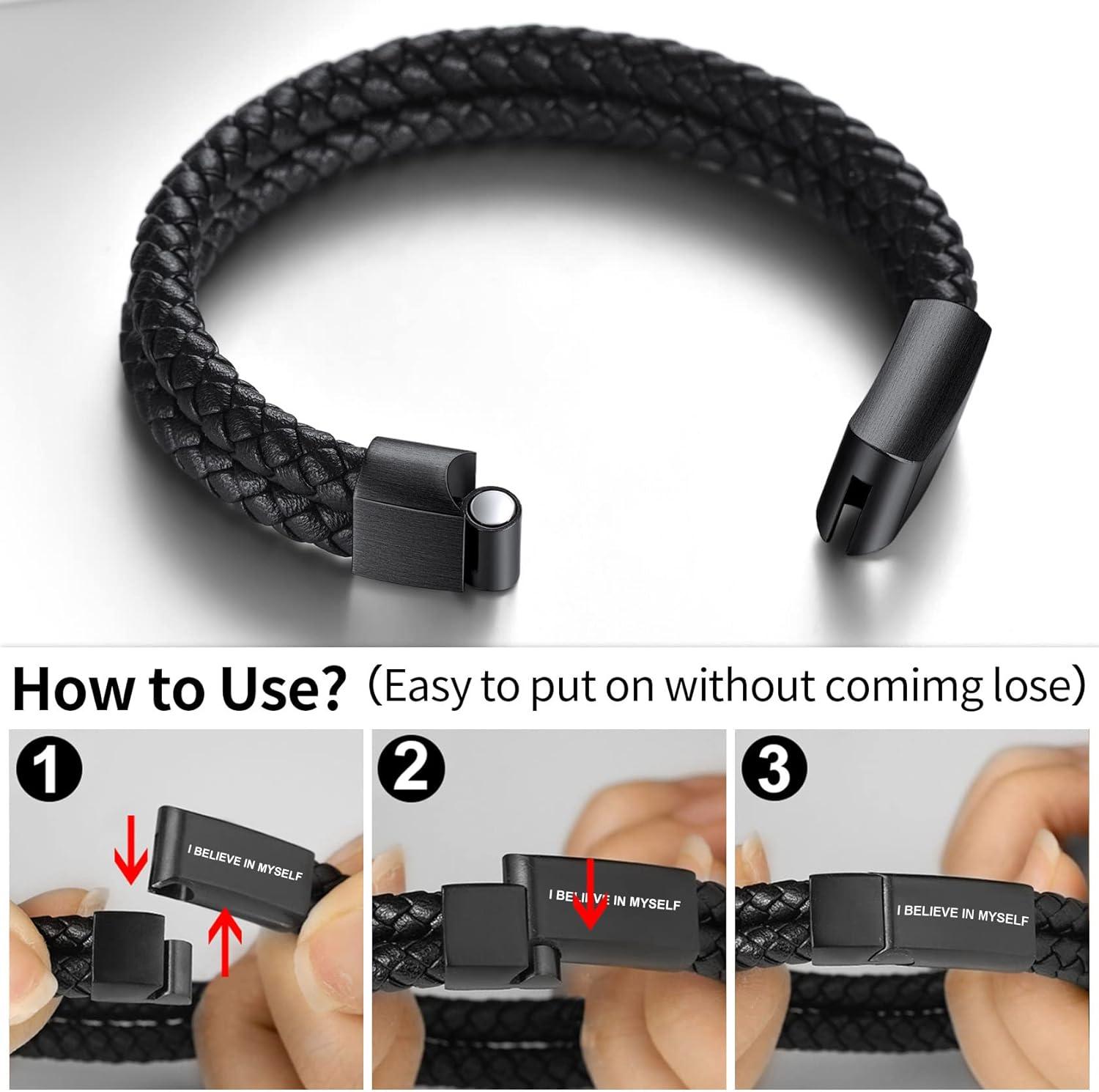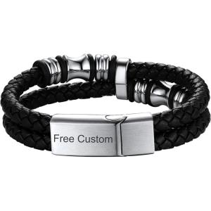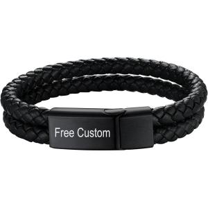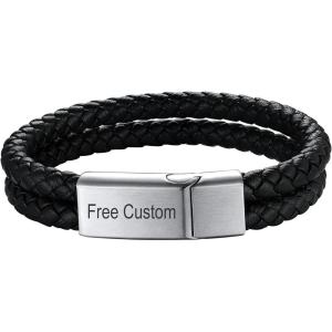 ChainsHouse Mens Wrap Braided Leather Black Bead Bracelets Bangles, Vintage Star of David/Wing Skull/Templar Cross Genuine Leather Bracelet, Customize Available, Size 7.5/8.3/9.0 Inch, Send Gift Box(B: Double Braided-Steel Clasp-Custom)