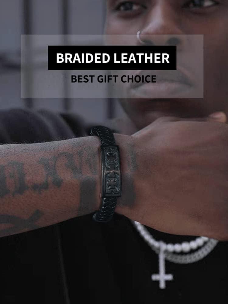 ChainsHouse Mens Wrap Braided Leather Black Bead Bracelets Bangles, Vintage Star of David/Wing Skull/Templar Cross Genuine Leather Bracelet, Customize Available, Size 7.5/8.3/9.0 Inch, Send Gift Box(A: Templar Cross-Black)