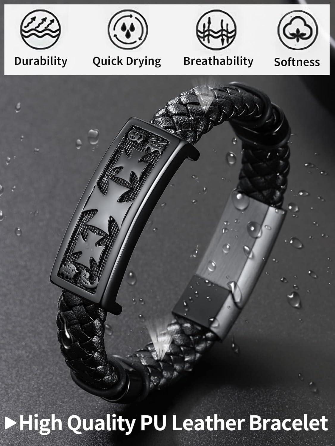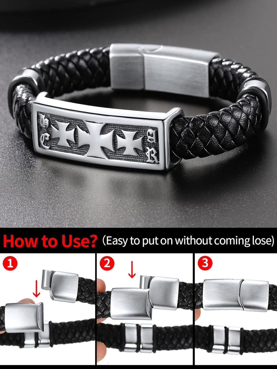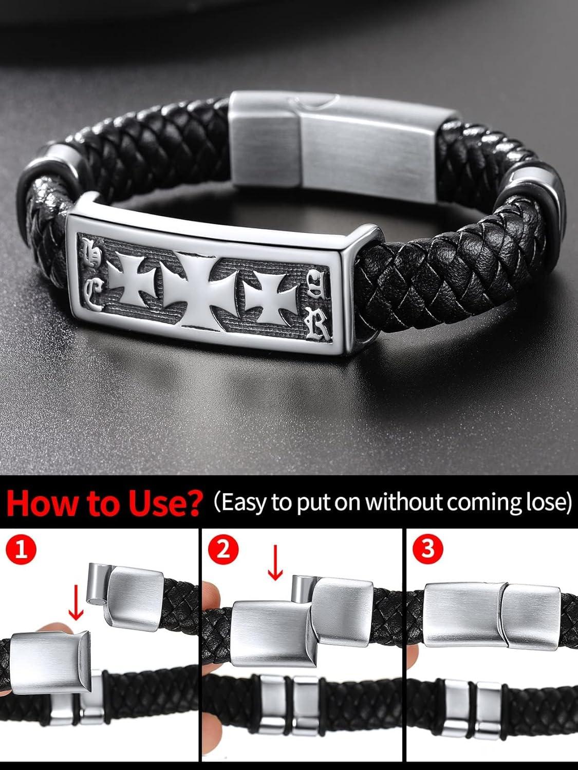 ChainsHouse Mens Wrap Braided Leather Black Bead Bracelets Bangles, Vintage Star of David/Wing Skull/Templar Cross Genuine Leather Bracelet, Customize Available, Size 7.5/8.3/9.0 Inch, Send Gift Box(A: Templar Cross-Steel)