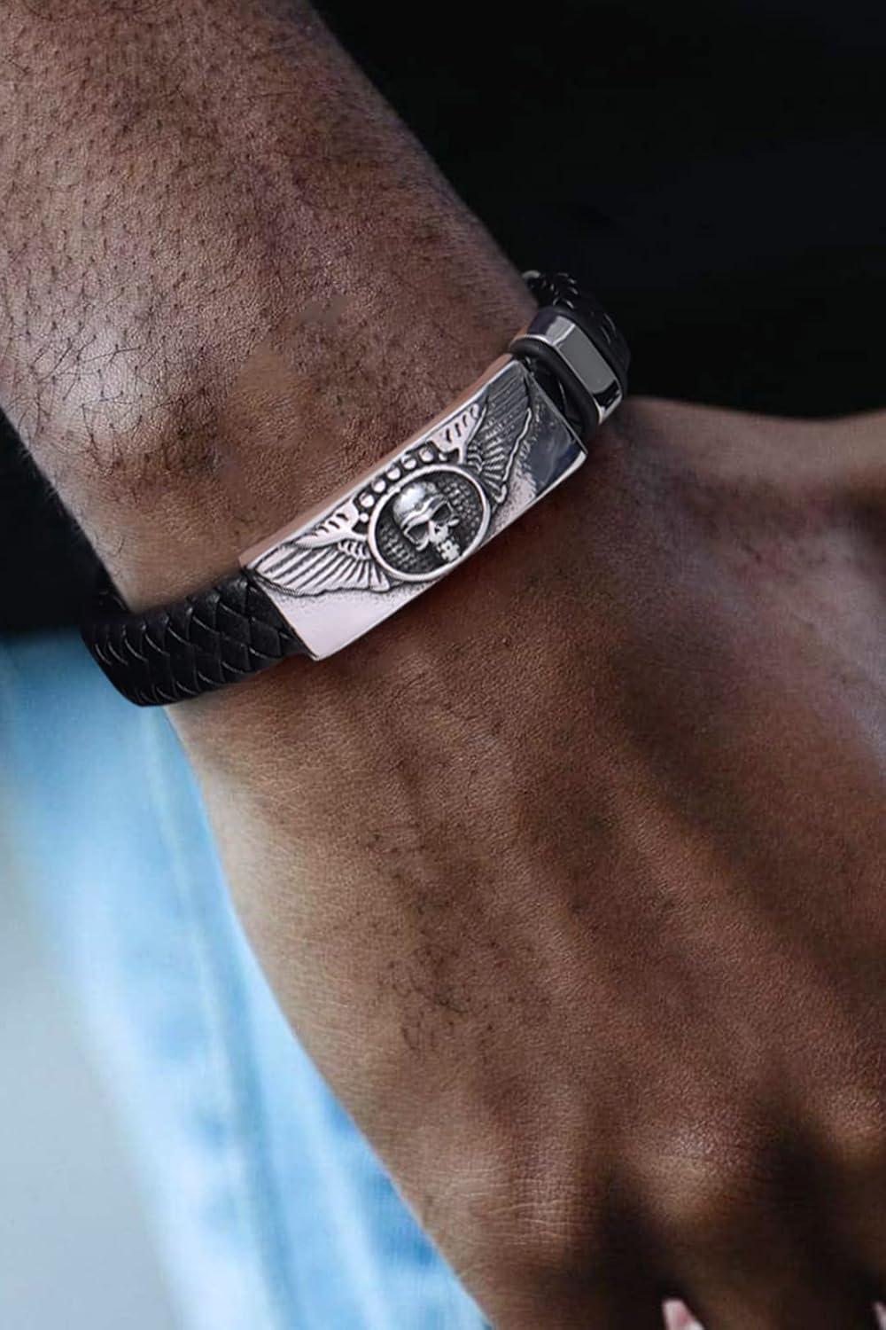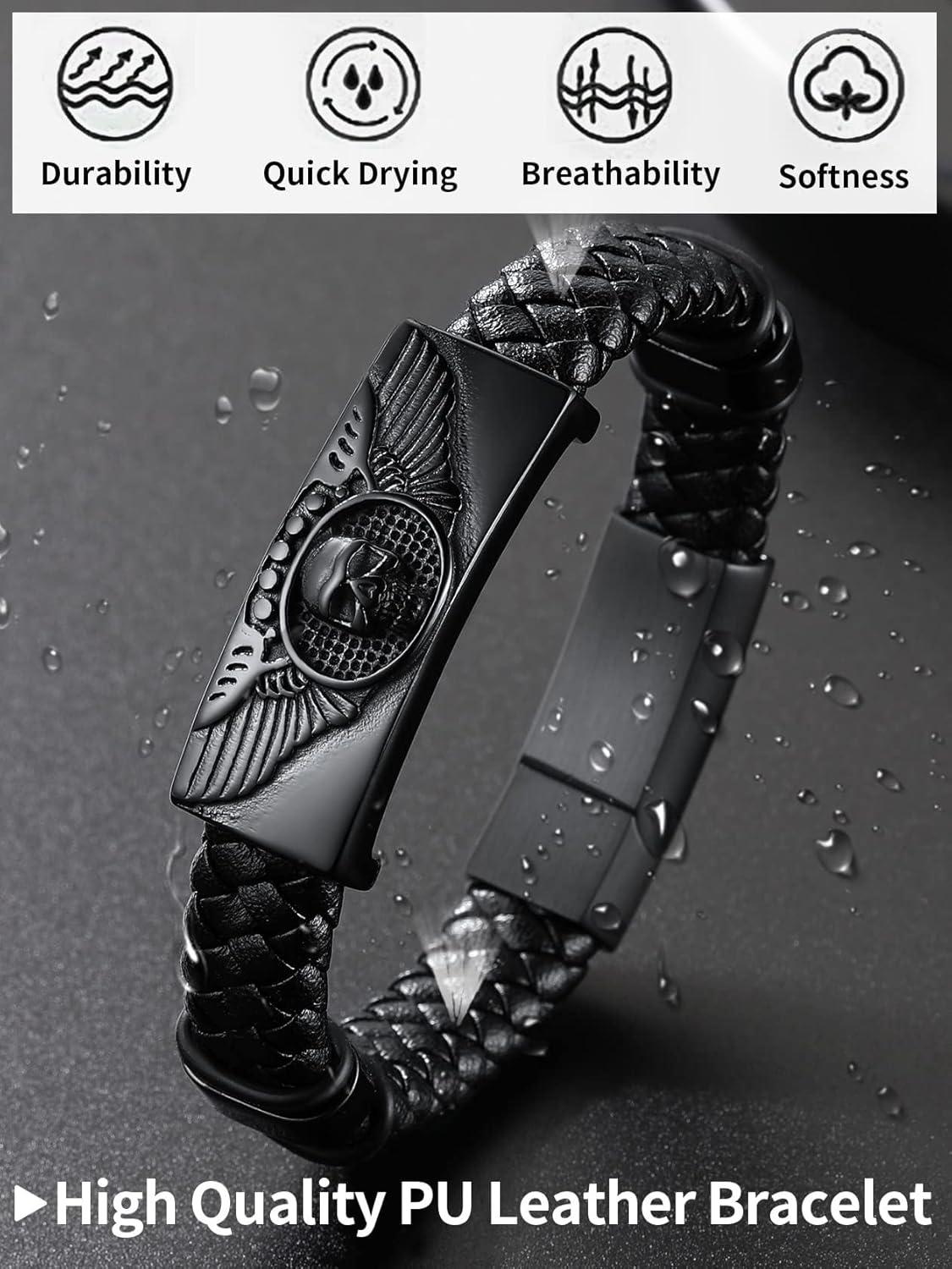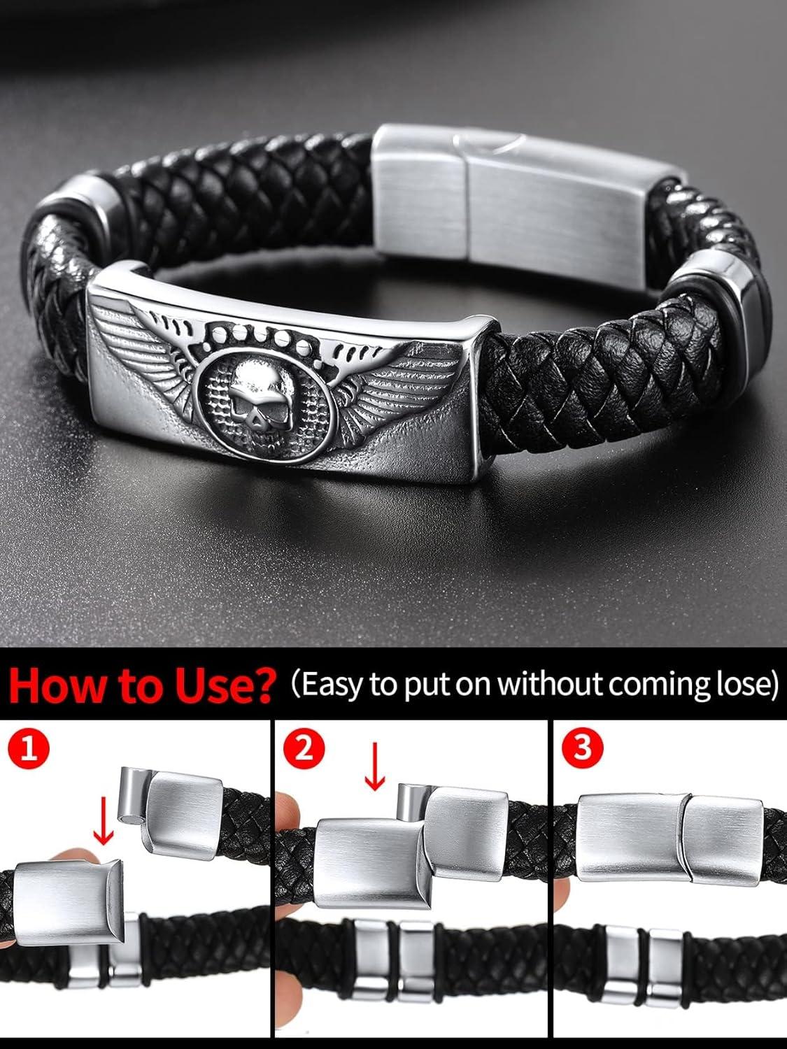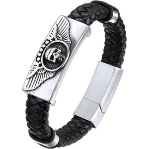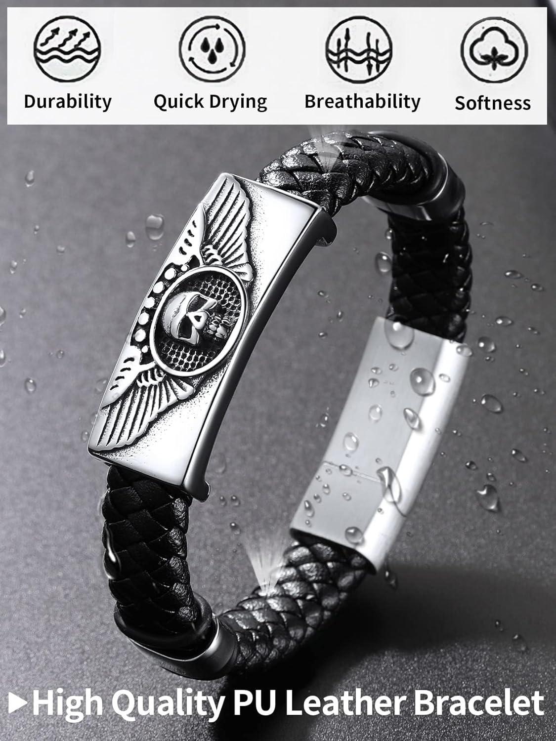 ChainsHouse Mens Wrap Braided Leather Black Bead Bracelets Bangles, Vintage Star of David/Wing Skull/Templar Cross Genuine Leather Bracelet, Customize Available, Size 7.5/8.3/9.0 Inch, Send Gift Box(B: Wing Skull-Steel-Custom)